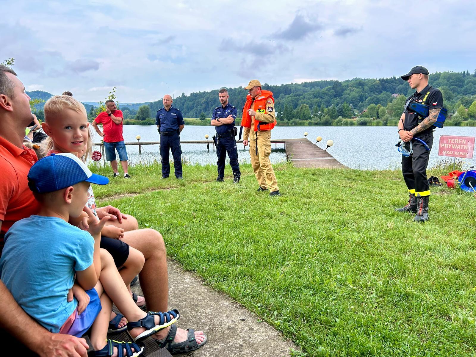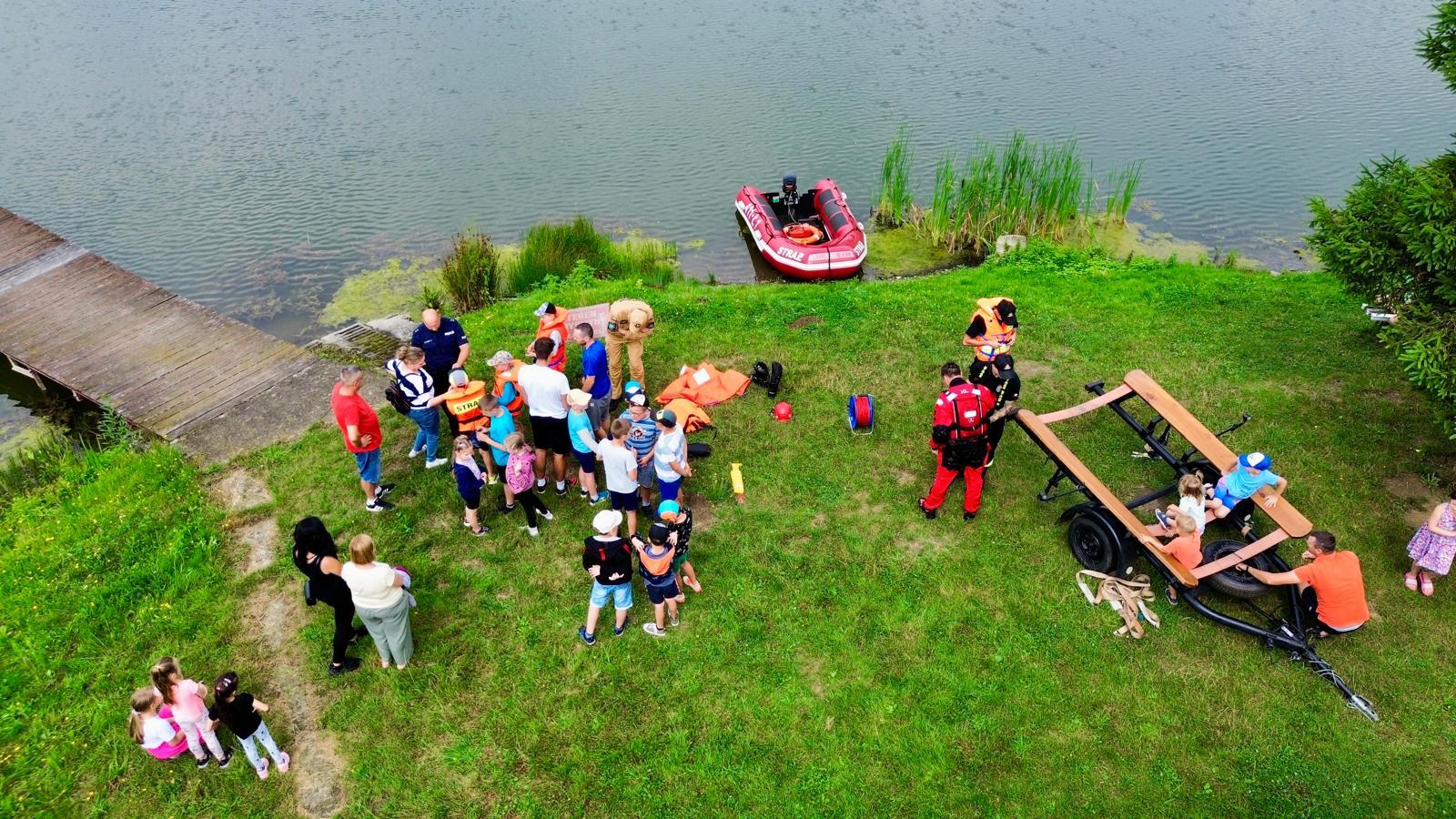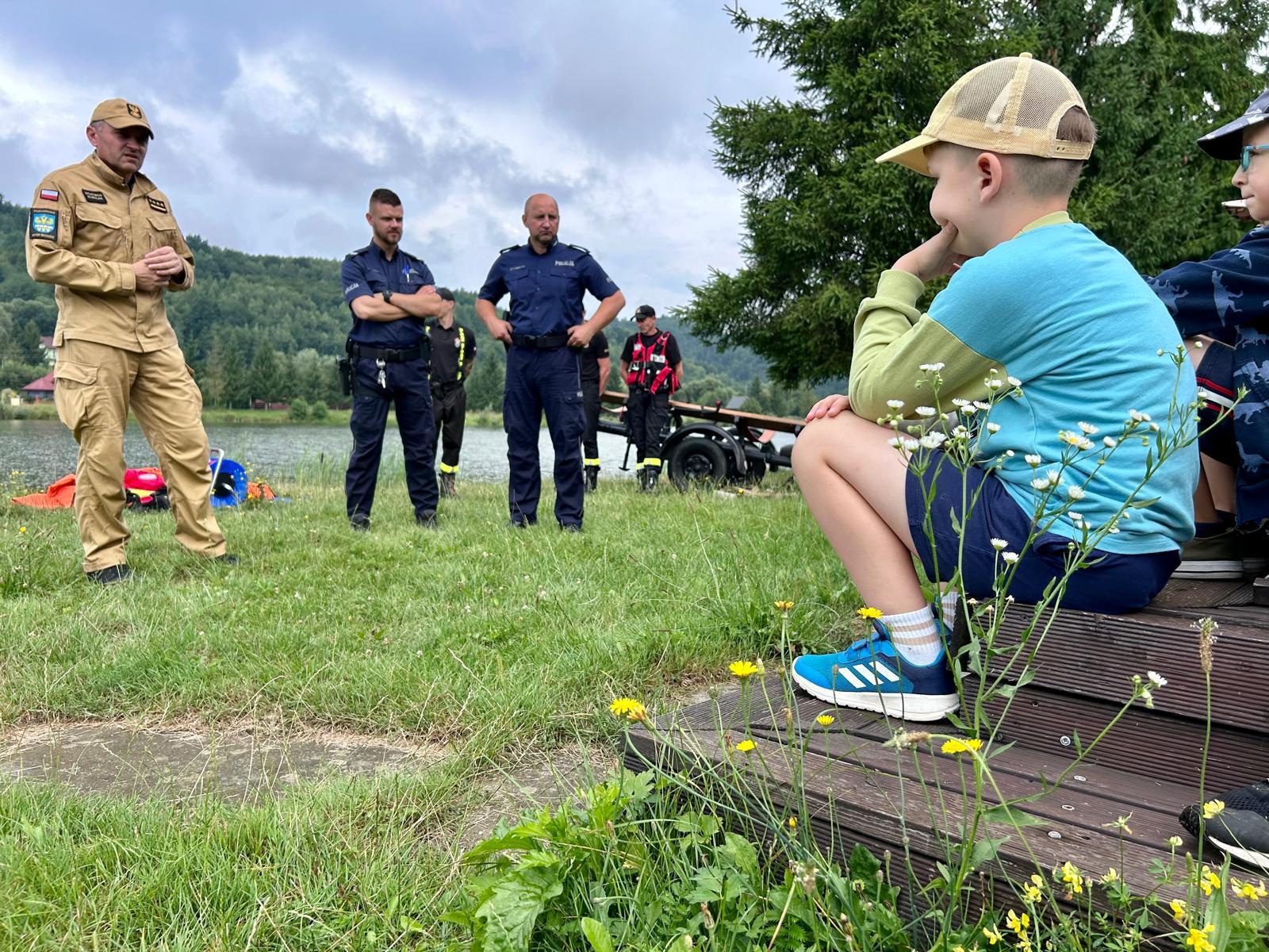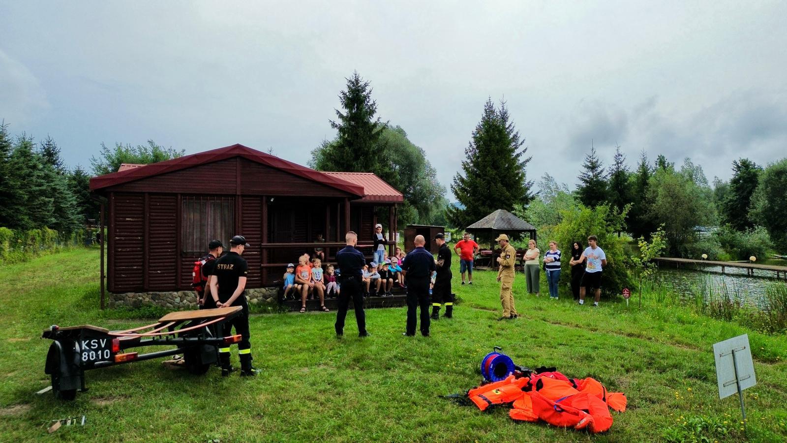 17 lipca 2024 r. w Krzemiennej przy Ośrodku Wypoczynkowym „U Schabińskiej - Krzemienna nad Sanem” odbyła się prelekcja na temat bezpiecznego wypoczynku nad wodą oraz doskonalenie stermotorzystów dla strażaków Komendy Powiatowej Państwowej Straży Pożarnej w Brzozowie. W spotkaniu brały udział dzieci oraz ich opiekunowie, które uczestniczą w Letniej Półkolonii organizowanej przez Gminny Ośrodek Kultury Bibliotek Promocji i Wypoczynku w Dydni oraz funkcjonariusze Policji, którzy przyłączyli się do wspólnej akcji prewencyjnej. Spotkanie rozpoczęło się od przypomnienia najważniejszych zasad bezpiecznego wypoczynku nad wodą, następnie przedstawiono sprzęt jakim dysponują strażacy podczas działań na obszarach wodnych, a na końcu przedstawiono metody podejmowania, holowania i udzielania pierwszej pomocy osobom poszkodowanym.