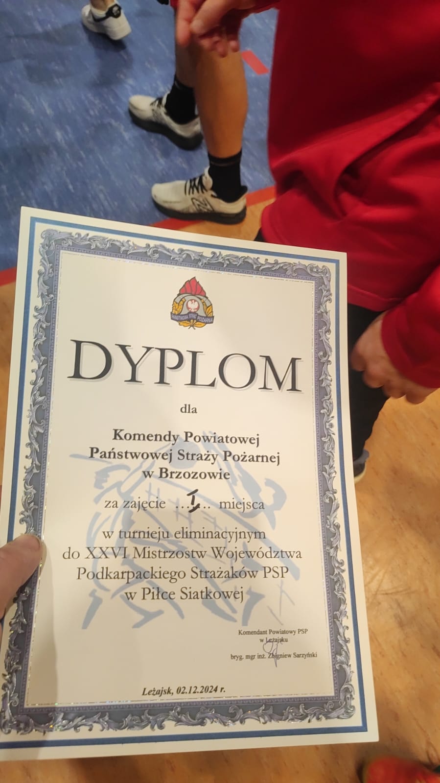 2 grudnia 2024 roku w Leżajsku odbył się turniej eliminacyjny grupy „D” do XXVI Mistrzostw Województwa Podkarpackiego Strażaków Państwowej Straży Pożarnej w piłce siatkowej. W zawodach wzięło udział pięć drużyn z komend Miejskich i Powiatowych PSP województwa podkarpackiego. W wyniku zaciętej rywalizacji reprezentacja Komendy Powiatowej PSP w Brzozowie zwyciężyła w całym turnieju nie tracąc nawet seta i tym samym po raz pierwszy w historii awansowała do turnieju finałowego. Ponadto st. kpt. Dawid Nowak został najlepszym zawodnikiem turnieju. Gratulujemy całej drużynie i życzymy sukcesu podczas czwartkowych finałów XXVI Mistrzostw Województwa Podkarpackiego strażaków Państwowej Straży Pożarnej w piłce siatkowej, które odbędą się w Tarnobrzegu.