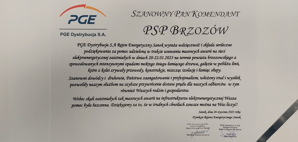 27 stycznia 2023 r. w Komendzie Powiatowej Państwowej Straży Pożarnej w Brzozowie przedstawiciele Rejonu Energetycznego Sanok PGE Dystrybucja S.A. przekazali serdeczne podziękowania strażakom PSP i OSP za pomoc udzieloną w trakcie usuwania masowych awarii na sieci elektroenergetycznej na terenie powiatu brzozowskiego.