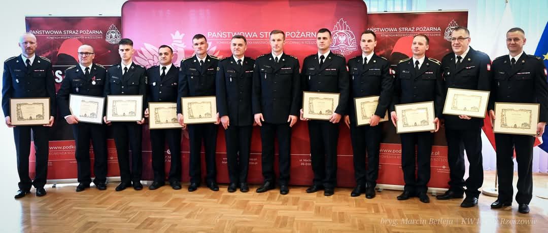 Podczas uroczystości podkarpacki komendant wojewódzki PSP st. bryg. Tomasz Baran wręczył wyróżnienia i dyplomy strażakom, którzy odegrali kluczową rolę w tej niezwykle trudnej i niebezpiecznej operacji.