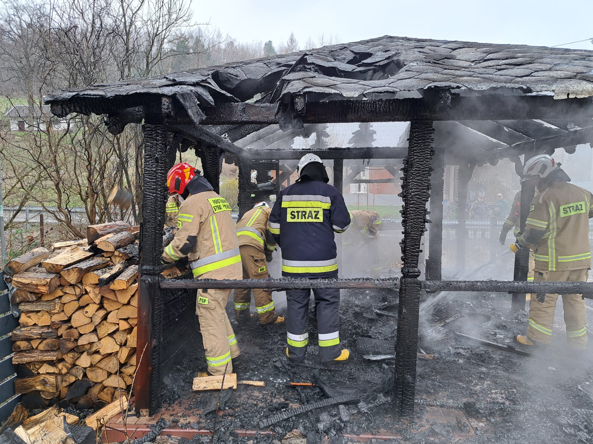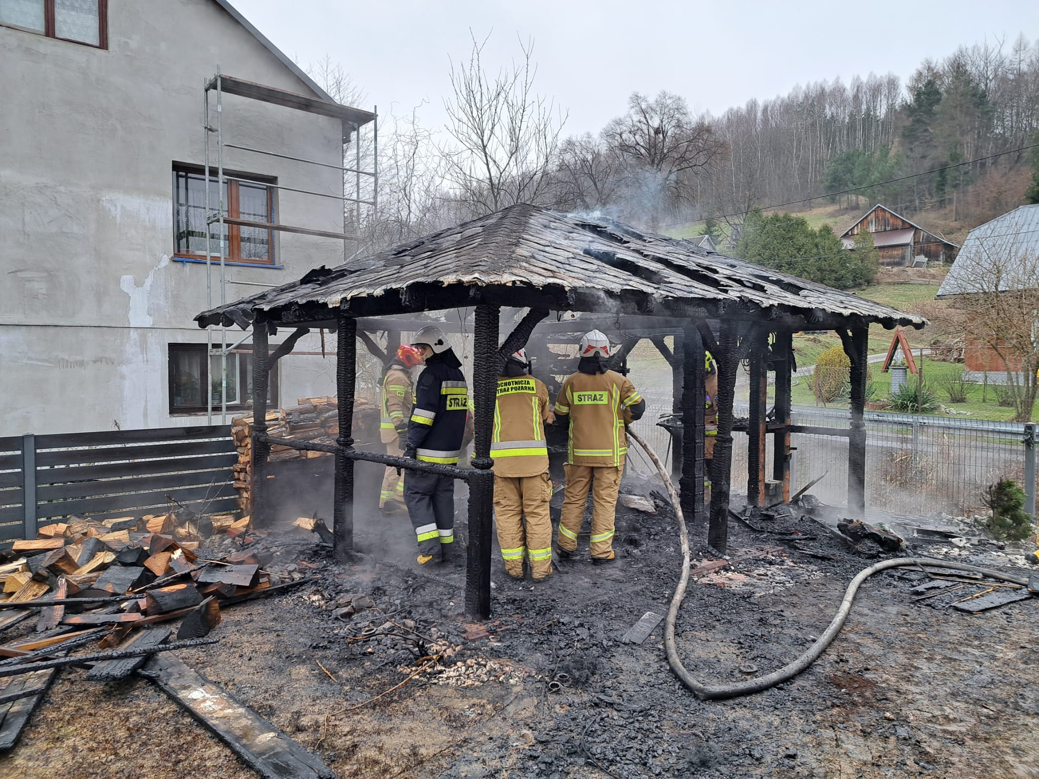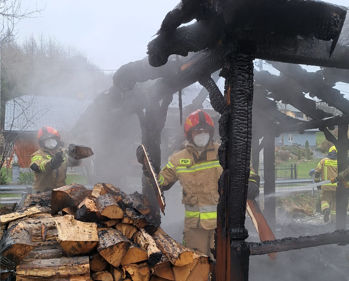 Przybyli na miejsce zdarzenia strażacy zastali altanę ogrodową w całości objętą ogniem, znajdującą się w bliskiej odległości od budynków mieszkalnych. Podano trzy prądy gaśnicze wody na palącą się altanę szybko opanowując pożar.