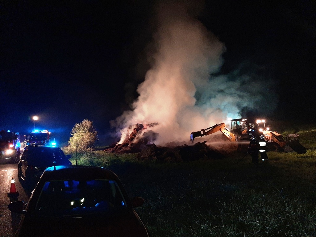 Paliła się duża pryzma kostek słomy o wymiarach ok. 22 m długości, 5 m szerokości i 5 m wysokości, na polu w pobliżu drogi, pod linią wysokiego napięcia. Na miejsce pożaru, jako pierwsza przybyła OSP z pobliskich Siedlisk, która zabezpieczyła miejsce zdarzenia i podała dwa prądy wody w natarciu. Do akcji gaśniczej dojeżdżają kolejne zastępy OSP (Nozdrzec, Dydnia, Wara i Wesoła). Jednostki te podają łącznie cztery prądy wody w natarciu na palącą się słomę. Jednostki zorganizowały punkt czerpania wody na rzece San i zapewniły dowożenie wody do pożaru. Do pożaru dojeżdża JRG Brzozów i przejmuje kierowanie działaniami. Ze względu na lokalizację palącej się słomy pod linią wysokiego napięcia (110kV), KDR wnioskuje do SKKP o zadysponowanie zapasu wody w postaci cysterny aby zapewnić ciągłość i dużą intensywność podawania środka gaśniczego. Rozwój pożaru zagrażałby napowietrznej linii energetycznej 110 kV. Na miejsce zdarzenia dojeżdża cysterna z 25 m3 zapasu wody z JRG Sanok, oficer operacyjny kpt. Nowak Dawid i zastępca komendanta powiatowego PSP w Brzozowie mł. bryg. Bogdan Biedka. Ze względu na rozmiar palącego się składowiska (głównie w części środkowej - wewnętrznej) zadysponowano do pożaru dodatkowe samochody gaśnicze i zapas środka pianotwórczego. Zastępca komendanta PSP w Brzozowie w porozumieniu z lokalnym samorządem gminnym organizuje i uzgadnia użycie koparek firm zewnętrznych, które rozpoczynają rozkopywanie palącej się pryzmy kostek słomy. Do akcji dołączają kolejne zastępy: z OSP Stara Wieś, OSP Grabownica Starzeńska, OSP Izdebki i OSP Hłudno, które pomagają w organizacji nowych punktów czerpania wody i w jej dowożeniu. W czasie przekopywania i rozsuwania na boki pryzmy przez koparki, strażacy przez kilka godzin dogaszali paląca się słomę wodą z niewielką ilością środka pianotwórczego jako zwilżacza. Rano następnego dnia ok. godz. 7.00, po zalaniu wodą wszystkich źródeł ognia zakończono działania gaśnicze.