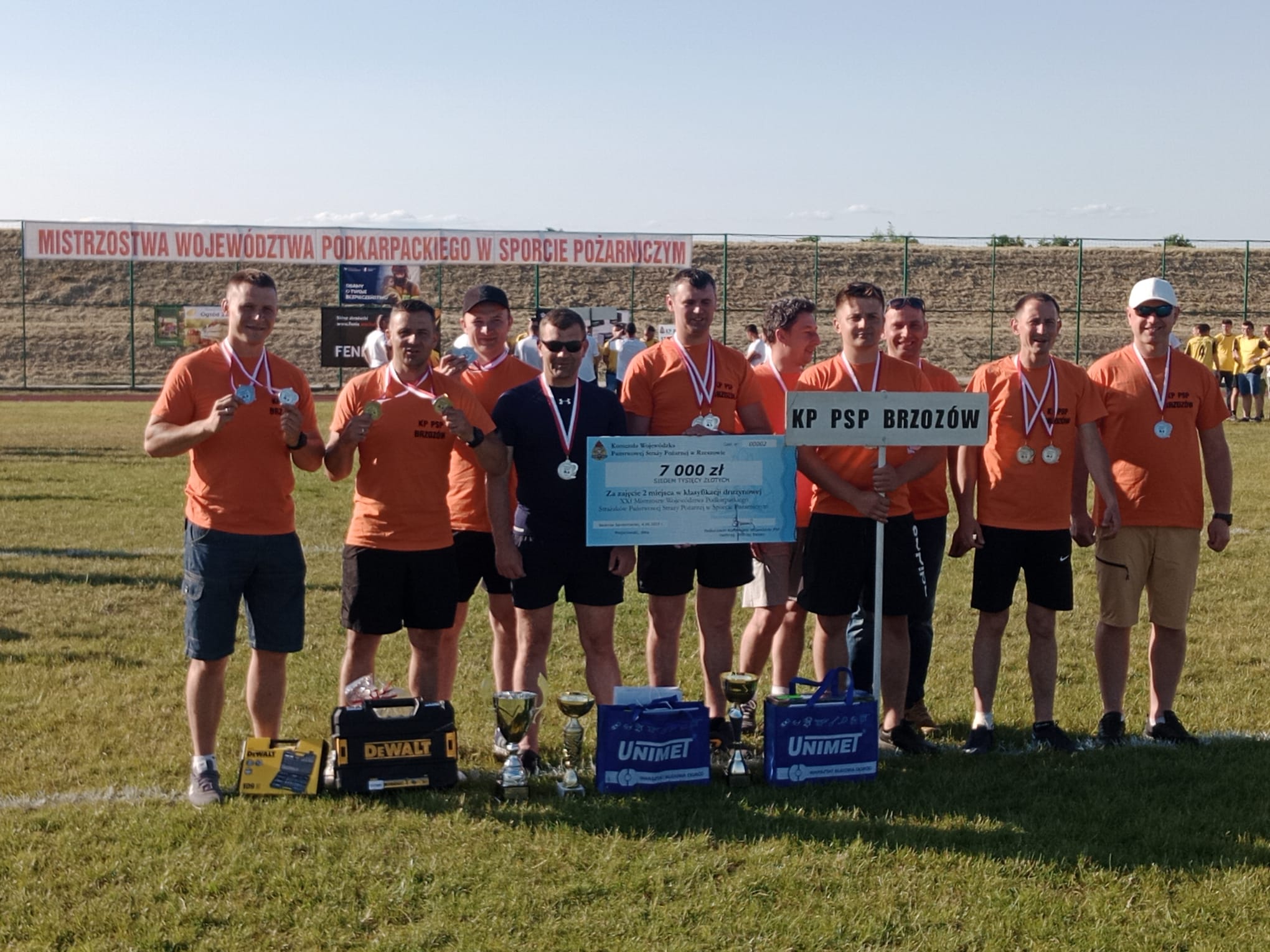 31 maja i 4 czerwca 2023 roku miały miejsce XXI Mistrzostwa Województwa Podkarpackiego w Sporcie Pożarniczym. Pierwszy dzień zmagań w konkurencjach indywidualnych tj: biegu 100 m z przeszkodami oraz wspinaniu przy użyciu drabiny hakowej miał miejsce w Rzeszowie na obiektach Jednostki Ratowniczo – Gaśniczej nr 3, natomiast drugi dzień to rywalizacja sztafet 4 x100 m oraz ćwiczenie bojowe, które miały miejsce w Baranowie Sandomierskim. W zawodach wystąpiły wszystkie Komendy Miejskie i Powiatowe PSP województwa podkarpackiego. Po pierwszym dniu mistrzostw czyli rywalizacji indywidualnych nasza reprezentacja zajmowała bardzo dobre 3 miejsce w klasyfikacji generalnej. Zwycięzcą konkurencji 100 m z przeszkodami z czasem 18,53 s został nasz zawodnik kpt. Wojciech Haduch i został mistrzem województwa. W drugim dniu zmagań nasi zawodnicy spisali się rewelacyjnie: sztafeta z czasem 68,03 s zajęła 7 miejsce, natomiast „bojówka” z czasem 30,69 s zajęła drugie miejsce. W klasyfikacji generalnej nasza reprezentacja zajęła świetne 2 miejsce w województwie podkarpackim. Gratulujemy i cieszymy się z tego wielkiego sukcesu całej drużyny. Odpowiedzialnym za całość przygotowań był Dowódca Jednostki Ratowniczo - Gaśniczej kpt. Wojciech Sobolak.