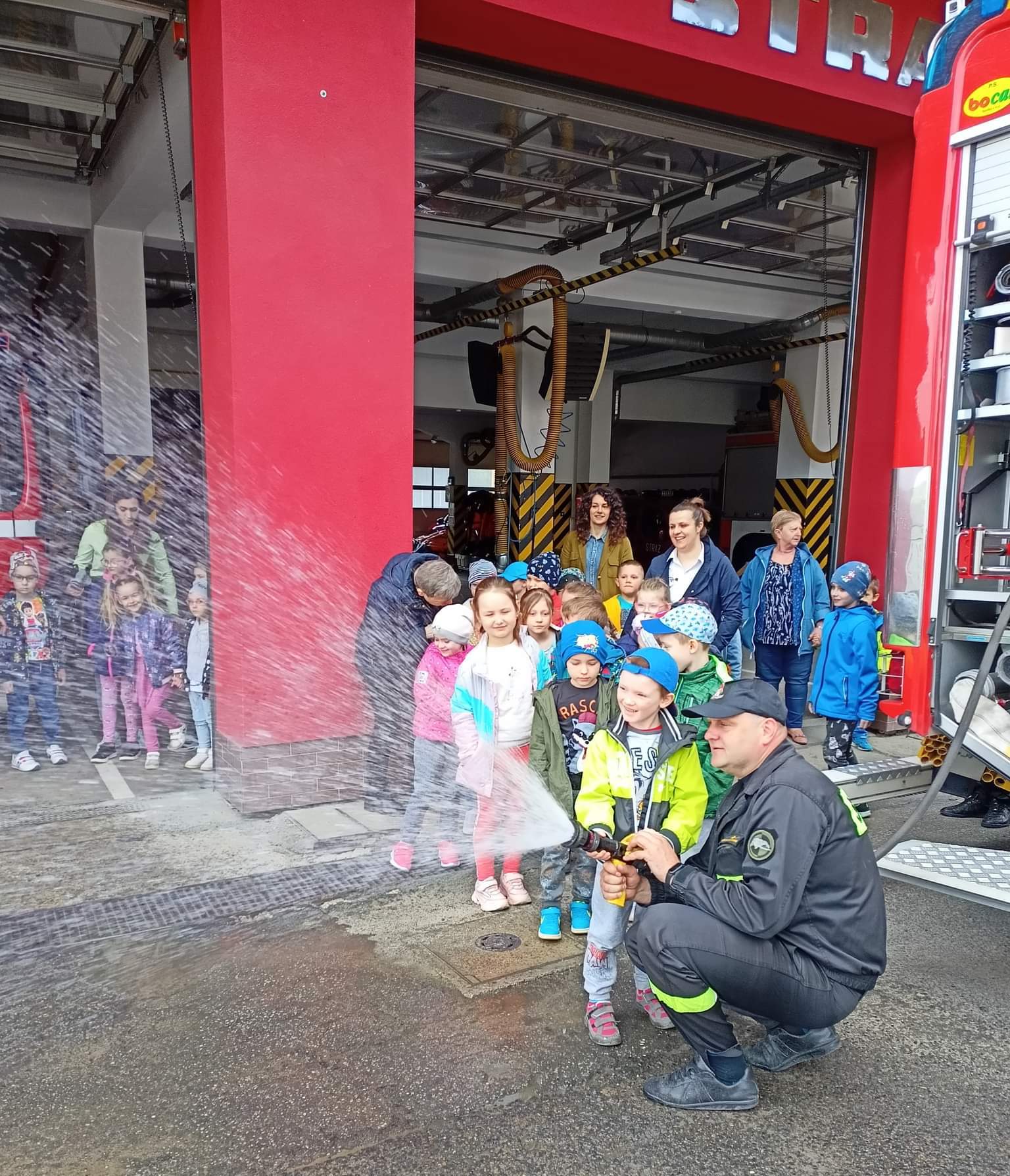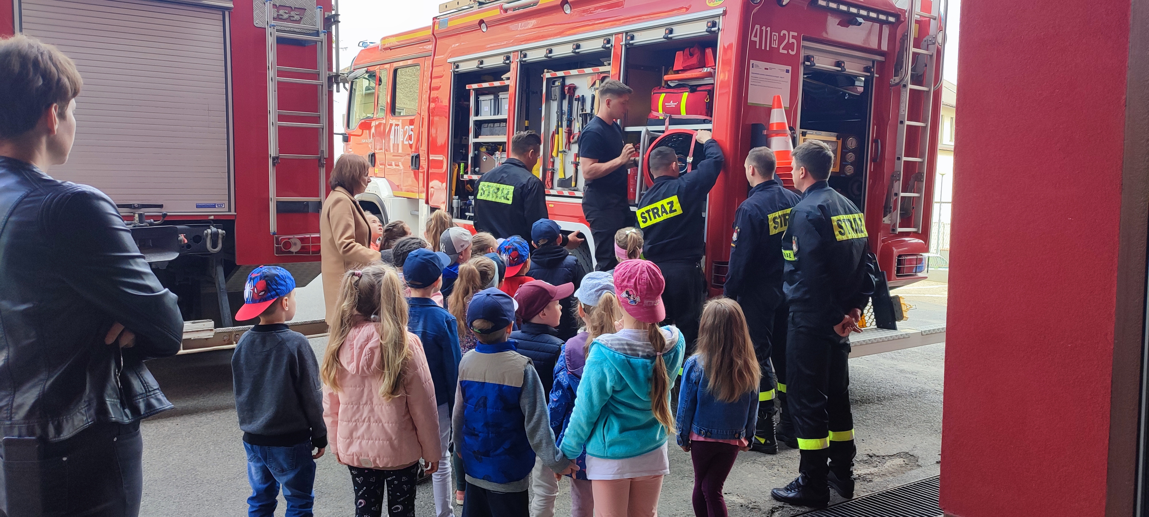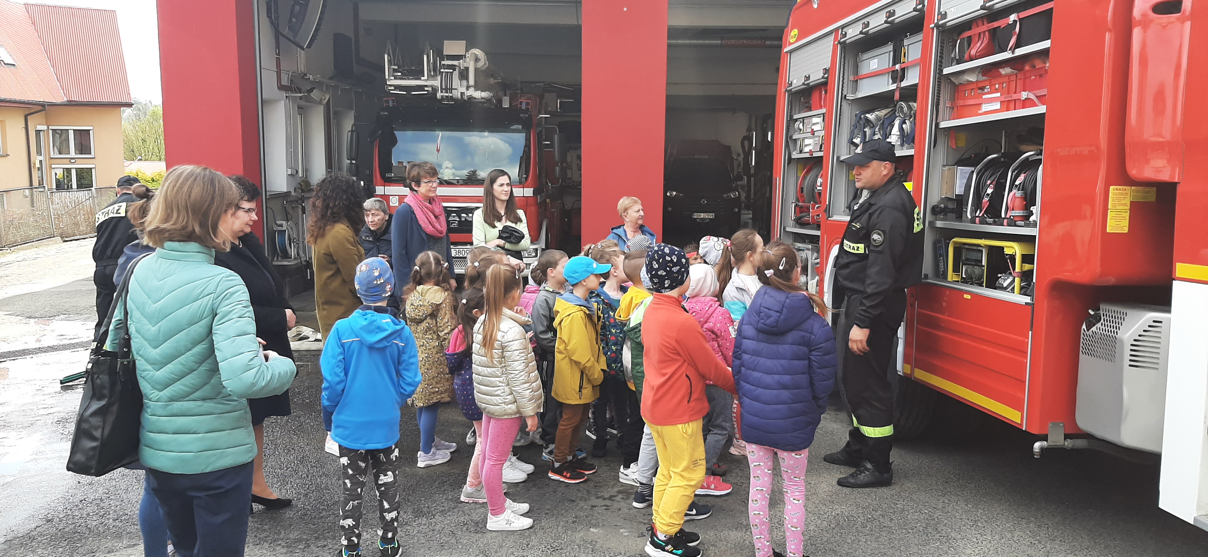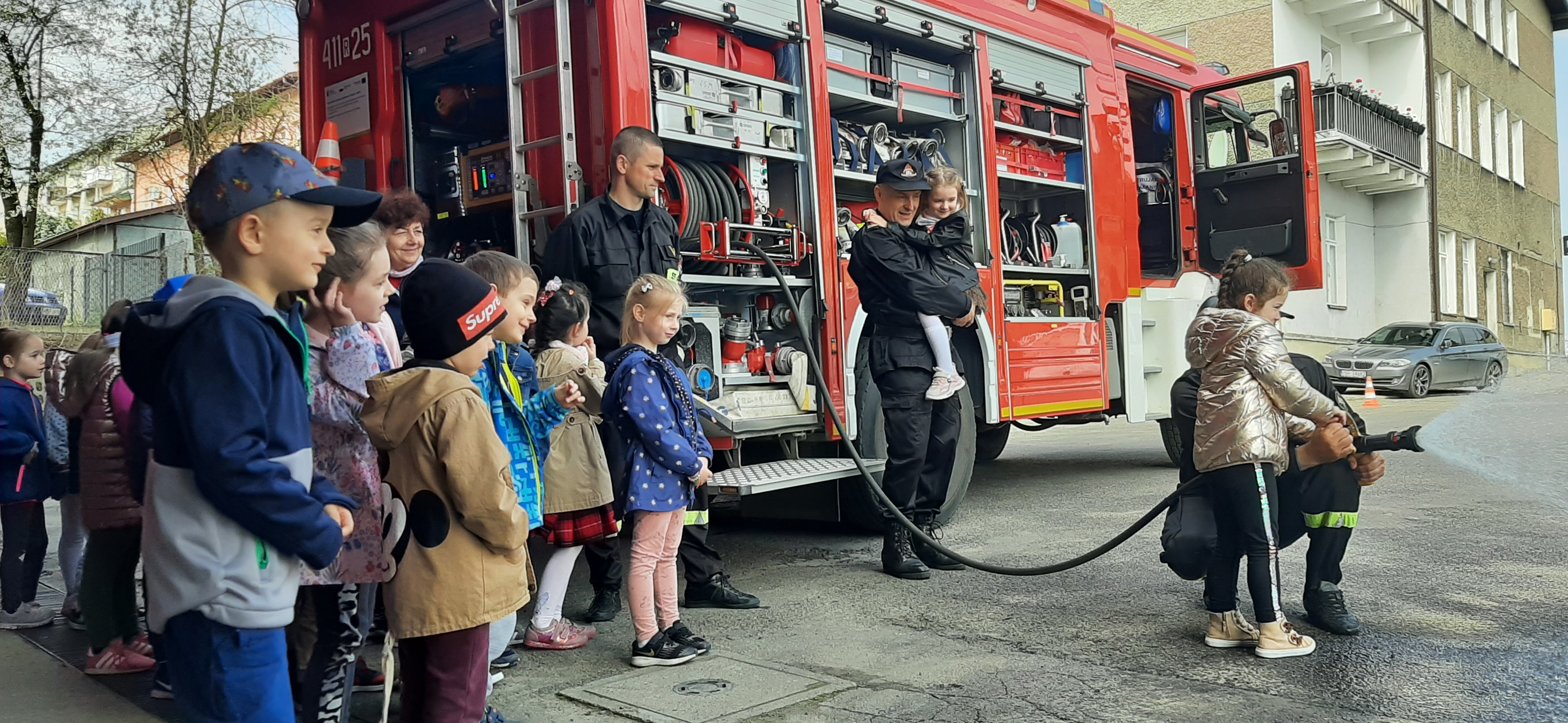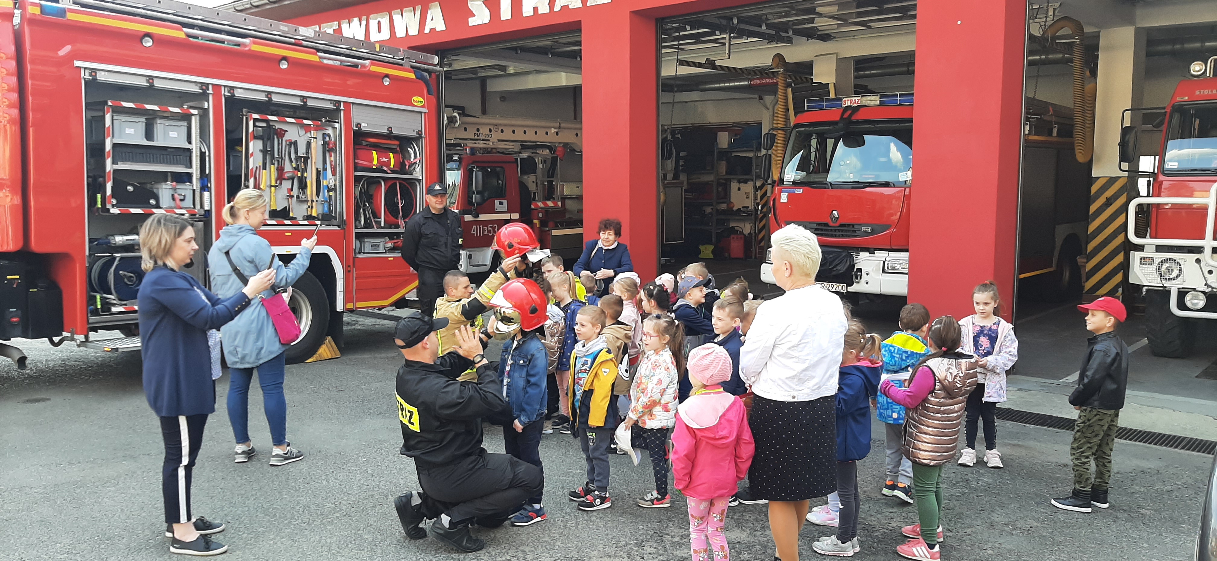 W czasie wizyty strażacy zaprezentowali dzieciom i opiekunom pojazdy pożarnicze, sprzęt ratowniczy i gaśniczy, dodatkowe wyposażenie specjalistyczne oraz ubrania i sprzęt ochrony osobistej. Dzieci mogły również zobaczyć jak wygląda wewnątrz kabina wozu strażackiego, jak strażacy gaszą wodą pożar i jak obsługują hydrauliczne narzędzia ratownicze. W czasie zwiedzania strażnicy dzieci obserwowały pokazowy zjazd strażaków po ześlizgu i przygotowanie do wyjazdu alarmowego. Odwiedziny przedszkolaków były również okazją do pogadanki na temat bezpiecznych zachowań w domu i w przedszkolu. Na koniec odwiedzin dzieci złożyły strażakom okolicznościowe życzenia i piękne kolorowe prace o tematyce pożarniczej, za które serdecznie DZIĘKUJEMY.