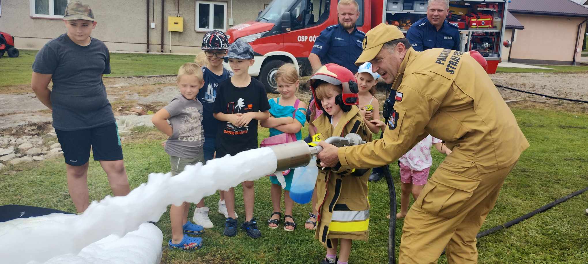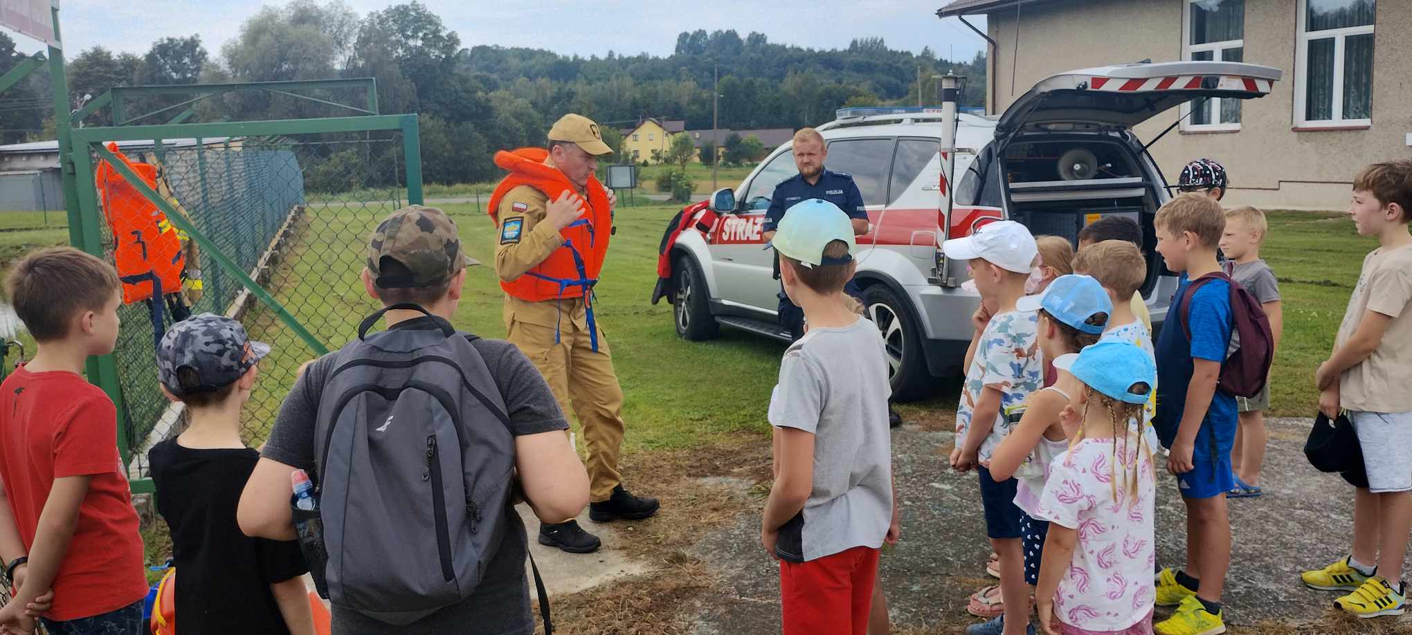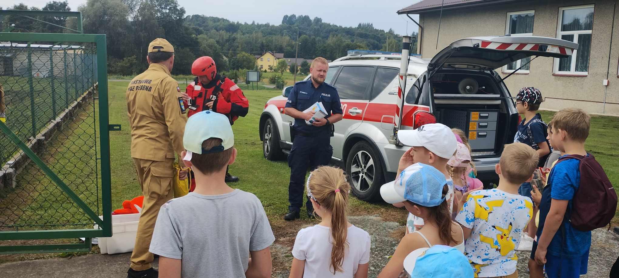 25 sierpnia 2023 r. w Górkach przy zbiorniku przeciwpożarowym Ochotniczej Straży Pożarnej odbyła się pogadanka na temat bezpiecznego wypoczynku nad wodą oraz prezentacja sprzętu używanego podczas działań z zakresu ratownictwa wodnego. W spotkaniu udział wzięły dzieci biorące udział w zajęciach organizowanych przez Bibliotekę Publiczną w Górkach, Policjanci Komendy Powiatowej Policji w Brzozowie, strażacy Ochotniczej Straży Pożarnej w Górkach oraz przedstawiciel PSP w Brzozowie. Przypomniano zasady bezpiecznego wypoczynku nad wodą, a także prawidłowe zachowanie się podczas zagrożeń występujących na akwenach. Zaprezentowano również sprzęt jakim posługują się strażacy podczas działań z zakresu ratownictwa wodnego. Na koniec spotkania dzieci mogły praktycznie użyć sprzętu ratownictwa wodnego oraz armatury wodnno - pianowej podczas symulowanego pożaru zbiornika co sprawiło im wiele radości.