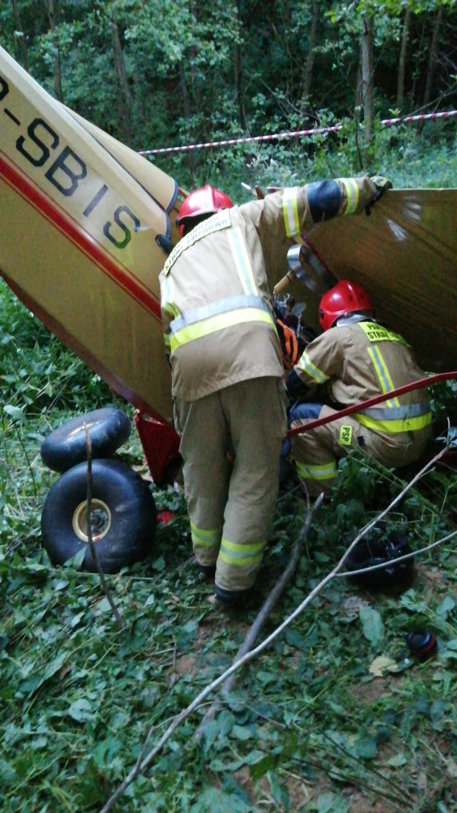 Po przybyciu na miejsce zastępów Straży Pożarnej ustalono, iż w okolicy Lądowiska Stara Wieś EBPW doszło do wypadku ultralekkiego samolotu Air Camper SP-SBIS . Samolot znajdował się kilkaset metrów od lądowiska, wbity dziobem w ziemię – brak oznak pożaru. Na skutek zdarzenia poszkodowana została 1 osoba – pilot, który zostawał uwięziony w maszynie. Strażacy wydobyli poszkodowanego z samolotu oraz przekazali Zespołowi Ratownictwa Medycznego. Mężczyzna został przetransportowany do szpitala przez Zespół LPR.