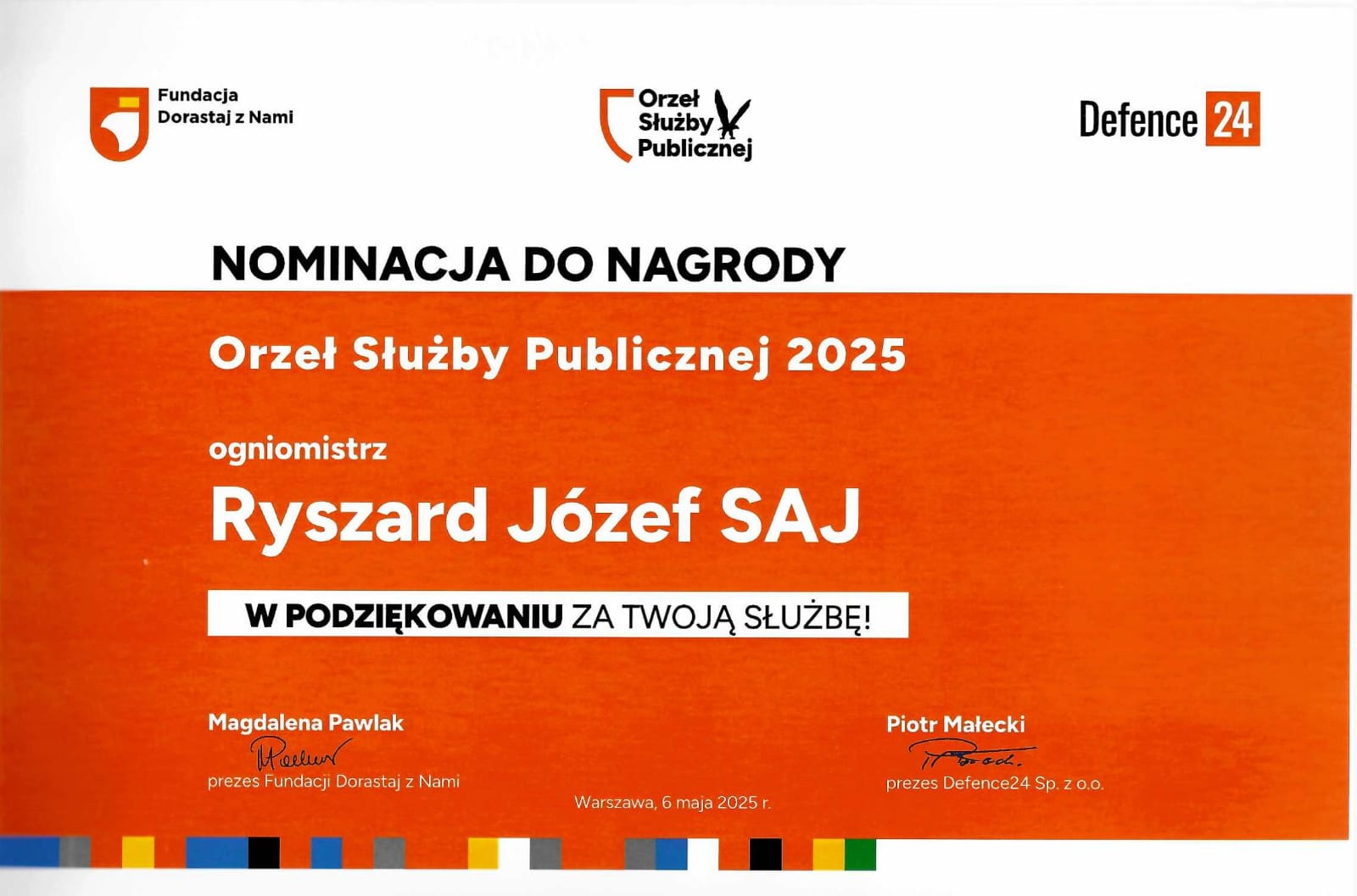 6 maja w hotelu Hilton w Warszawie miała miejsce uroczysta Gala DEFENCE 24 DAYS zorganizowana przez Fundację Dorastaj z Nami, podczas której zostały wręczone nominacje oraz Nagroda Orzeł Służby Publicznej 2025. Fundacja Dorastaj z Nami i Defence24 przyznaje Nagrodę Orzeł Służby Publicznej funkcjonariuszom służb publicznych i żołnierzom, którzy wykazali się bohaterską postawą w swoim działaniu na rzecz innych osób. Jest to forma wyjątkowego podziękowania tym wszystkim ludziom, którzy codziennie narażają swoje życie i zdrowie, by chronić spokój ojczyzny i jej obywateli. Wśród nominowanych do wyżej wymienionej nagrody znalazło się dwóch funkcjonariuszy Komendy Powiatowej PSP w Brzozowie: