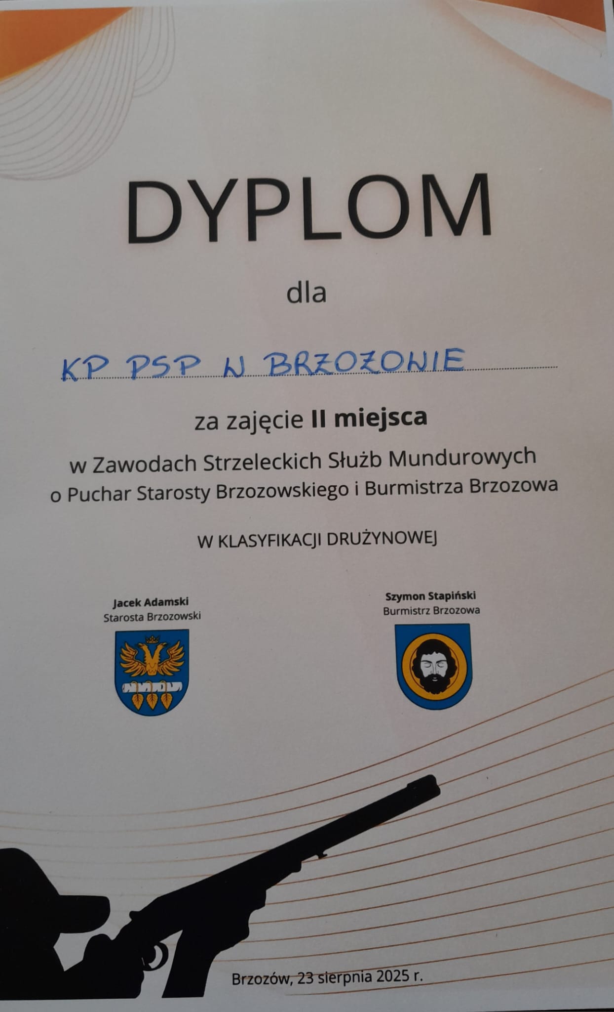 23 sierpnia b.r. na strzelnicy sportowej LOK w Brzozowie miały miejsce zawody strzeleckie, w których w zespołach 3 osobowych rywalizowali przedstawicie służb mundurowych: Nadleśnictwa Brzozów, Komendy Powiatowej Policji oraz Komendy Powiatowej Państwowej Straży Pożarnej w Brzozowie. Wydarzenie odbyło się pod patronatem starosty brzozowskiego i burmistrza Brzozowa, a jego celem była integracja, popularyzacja sportu strzeleckiego oraz wzmocnienie współpracy pomiędzy służbami. W zawodach uczestniczył starosta brzozowski Jacek Adamski, zastępca burmistrza Mariusz Bieńczak oraz komendant powiatowy PSP w Brzozowie st. bryg. Krzysztof Folta. W wyniku rywalizacji kolejność miejsc w klasyfikacji drużynowej przedstawia się następująco: