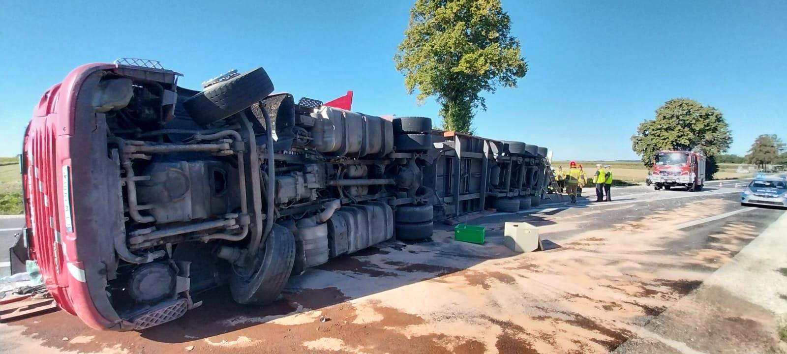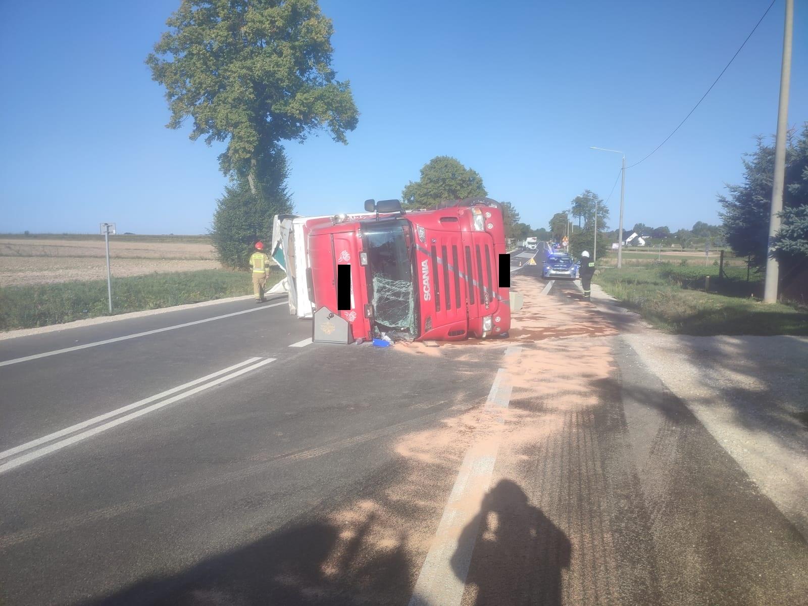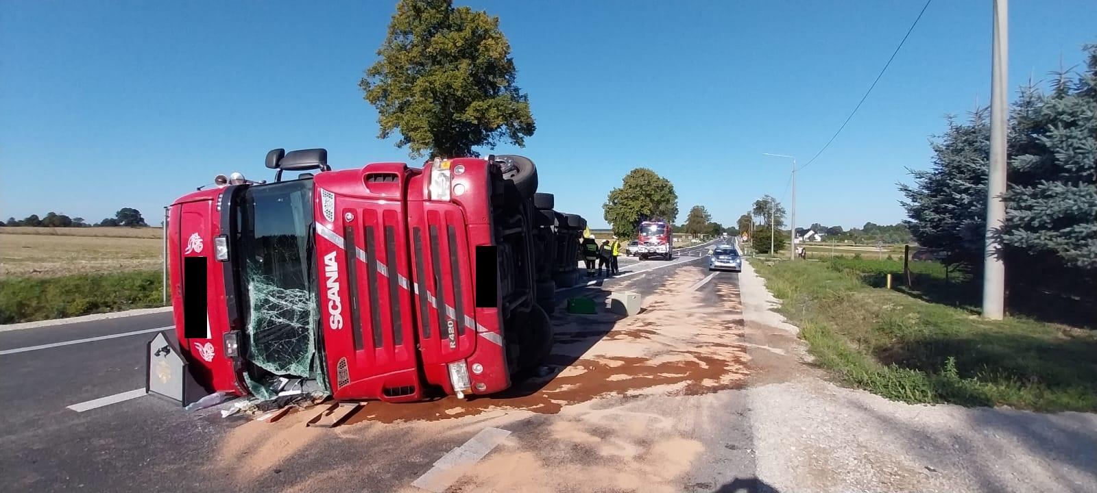 Ciągnik siodłowy z naczepą przewrócony na jezdnie w miejscowości Szczeglin gm. Stopnica