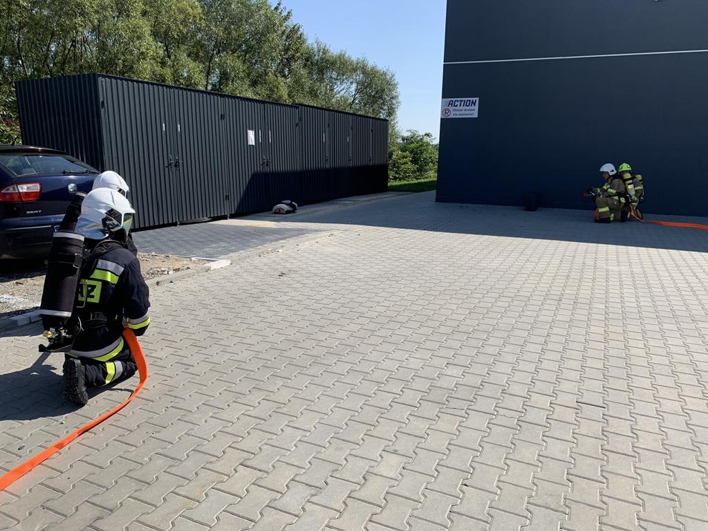 i utrudnieniami jakie mogą wystąpić podczas akcji ratowniczo - gaśniczej, infrastrukturą techniczną budynku oraz zabezpieczeniami przeciwpożarowymi. Po zapoznaniu strażaków z obiektem przeprowadzono ćwiczenia praktyczne, których tematem był pożar magazynu na kartony zlokalizowanego przy Parku handlowym „Promyk”. Ćwiczenia były okazją do sprawdzenia