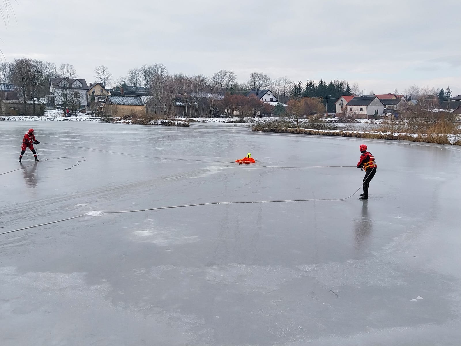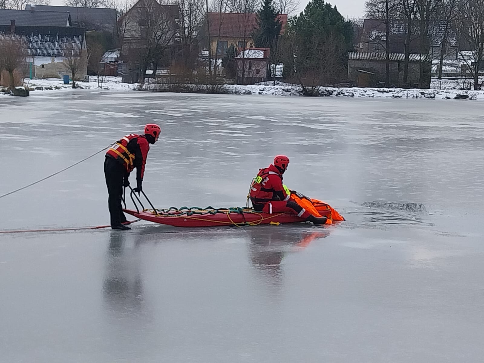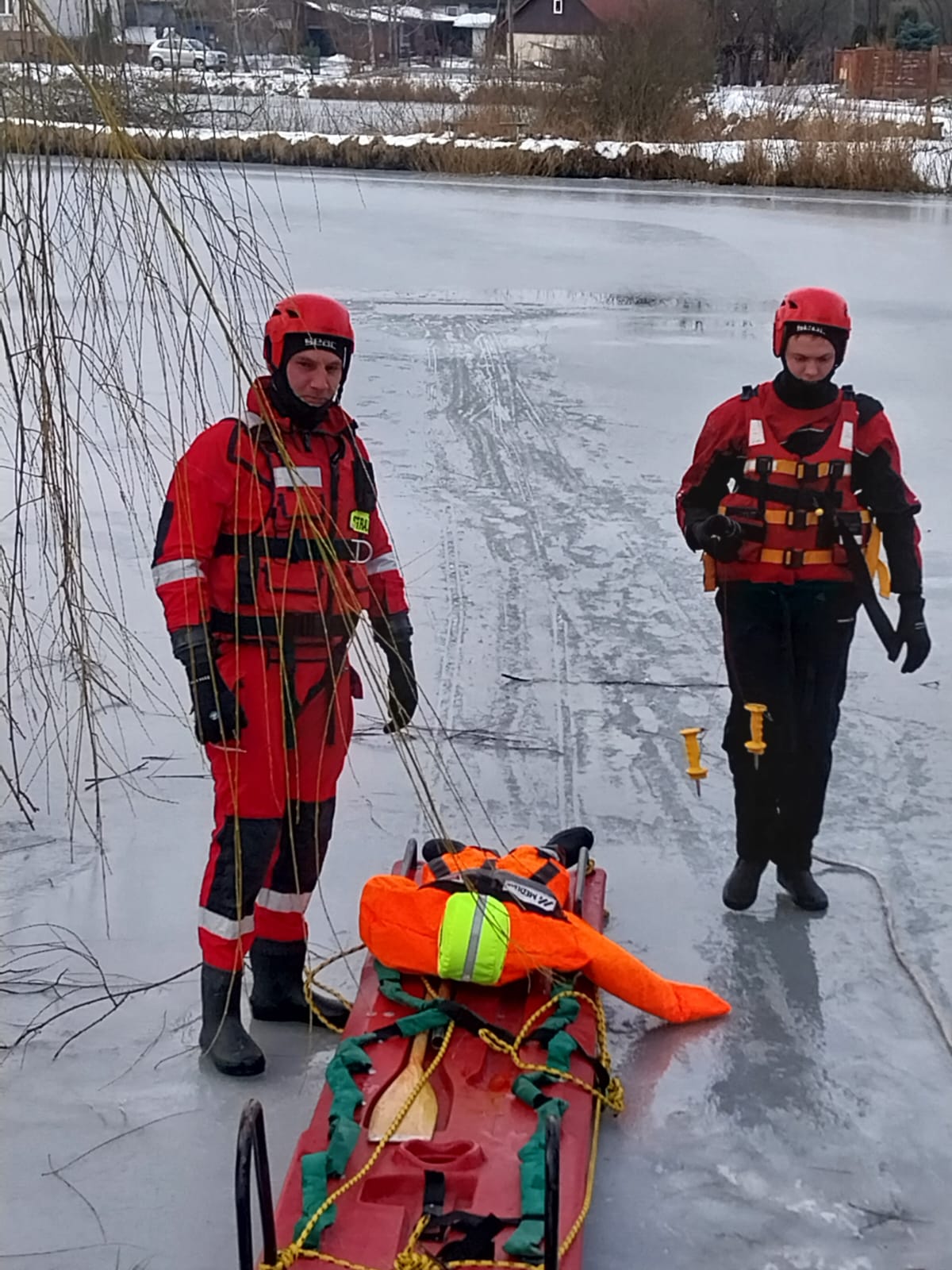 23 stycznia 2024 roku strażacy z Jednostki Ratowniczo-Gaśniczej PSP w Busku – Zdroju wraz z jednostkami OSP Kobylniki oraz OSP Widuchowa uwzględniając aurę zimową oraz odpowiednie warunki atmosferyczne przeprowadzili ćwiczenia na zbiorniku wodnym w miejscowości Mikułowice, gm. Busko-Zdrój. Ćwiczenia te miały na celu doskonalenie różnych technik ratowania osób tonących z zamarzniętych zbiorników wodnych. Podczas ćwiczeń, strażacy korzystali ze sprzętu będącego na wyposażeniu samochodów ratowniczo-gaśniczych takiego jak: sanie lodowe, deska ortopedyczna, rzutka ratunkowa, koło ratunkowe czy suche skafandry. Tego typu ćwiczenia są doskonałą okazją do sprawdzenia możliwości wykorzystania obowiązujących procedur jak również możliwości taktycznych posiadanego sprzętu ratowniczego wykorzystywanego podczas zdarzeń prowadzonych na akwenach wodnych w warunkach zimowych przy ujemnych temperaturach. Plan doskonalenia zawodowego przewiduje prowadzenie tego typu ćwiczeń z udziałem jednostek Ochotniczych Straży Pożarnych z terenu powiatu buskiego, włączonych do KSRG posiadających na wyposażeniu sprzęt niezbędny do likwidacji tego rodzaju zdarzeń.