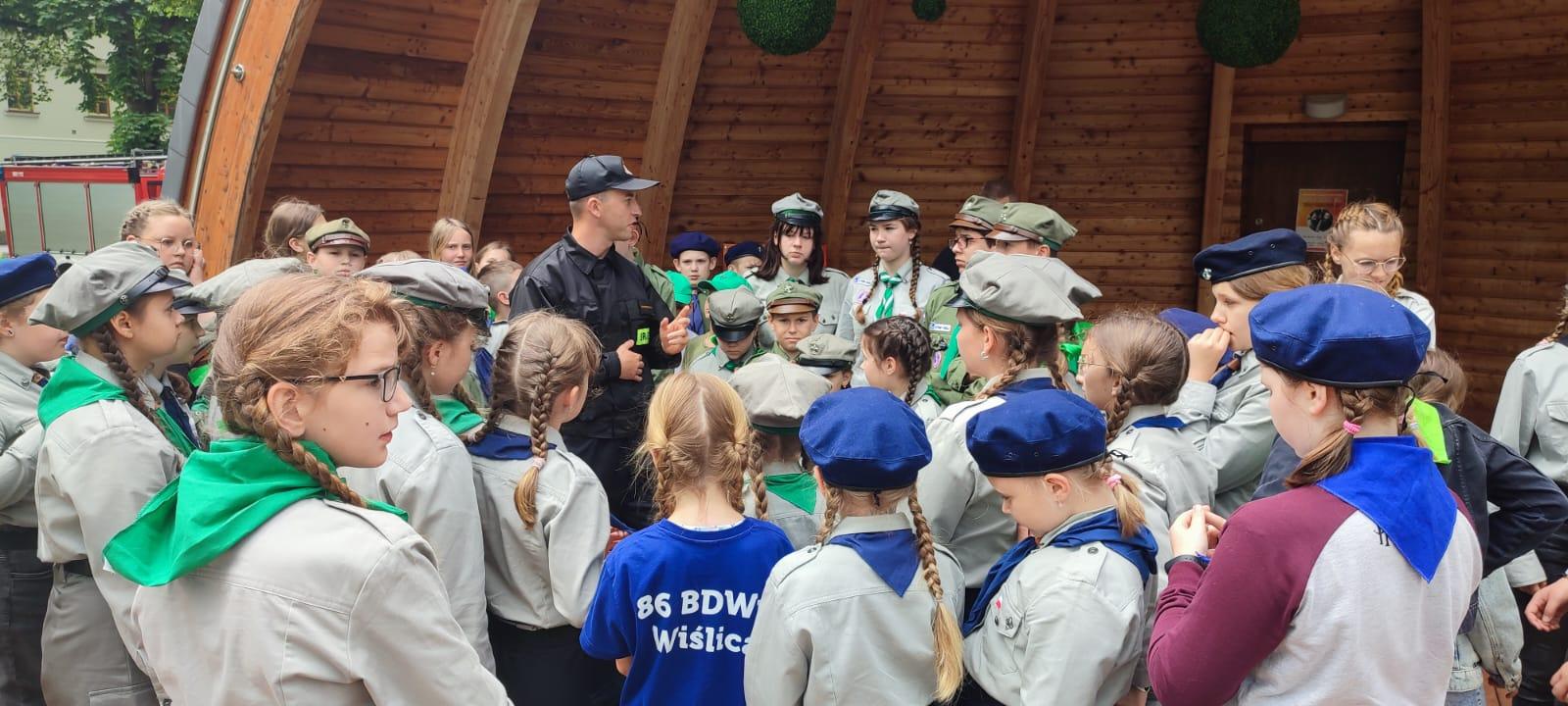 23 maja 2024 roku strażacy Komendy Powiatowej Państwowej Straży Pożarnej w Busku-Zdroju w odpowiedzi na zaproszenie Hufica ZHP Busko-Zdrój spotkali się z harcerzami na muszli koncertowej w Parku Zdrojowym w celu przeprowadzenia prelekcji. Tematem przeprowadzonego szkolenia było zapoznanie dzieci z podstawowymi zasadami udzielania pierwszej pomocy, takich jak sprawdzenie bezpieczeństwa miejsca zdarzenia i ocena stanu poszkodowanego. Prelekcje przeprowadzili dwaj strażacy naszej komendy, którzy przekazali uczestnikom niezbędną wiedzę dotyczącą prawidłowego postępowania w sytuacjach takich jak zasłabnięcie, krwotok czy złamanie. Praktyczne ćwiczenia pozwoliły uczestnikom nauczyć się wykonywania podstawowych czynności resuscytacyjnych na manekinie. Podczas szkolenia zostały również omówione kwestie związane z zasadami wezwania pomocy i zostały przypomniane numery alarmowe, zasady bezpiecznego wypoczynku nad zbiornikami wodnymi. Uczestnicy mieli okazję zadawać pytania i rozwiewać wątpliwości związane z udzielaniem pierwszej pomocy. Szkolenie cieszyło się dużym zainteresowaniem wśród dzieci, które chętnie uczestniczyły w zajęciach. Prelekcja cieszyła się dużym zainteresowaniem uczniów, w spotkaniu wzięło udział ok. 50 dzieci i 4 opiekunów.
