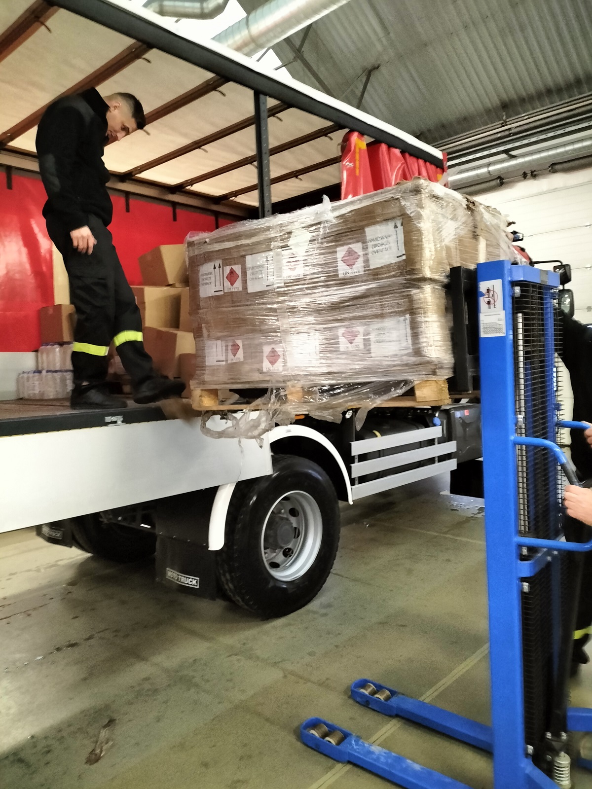 Pomoc buskich strażaków w dystrybucji środków ochrony osobistej, przeznaczonych dla punktów szczepień z terenu powiatu buskiego
