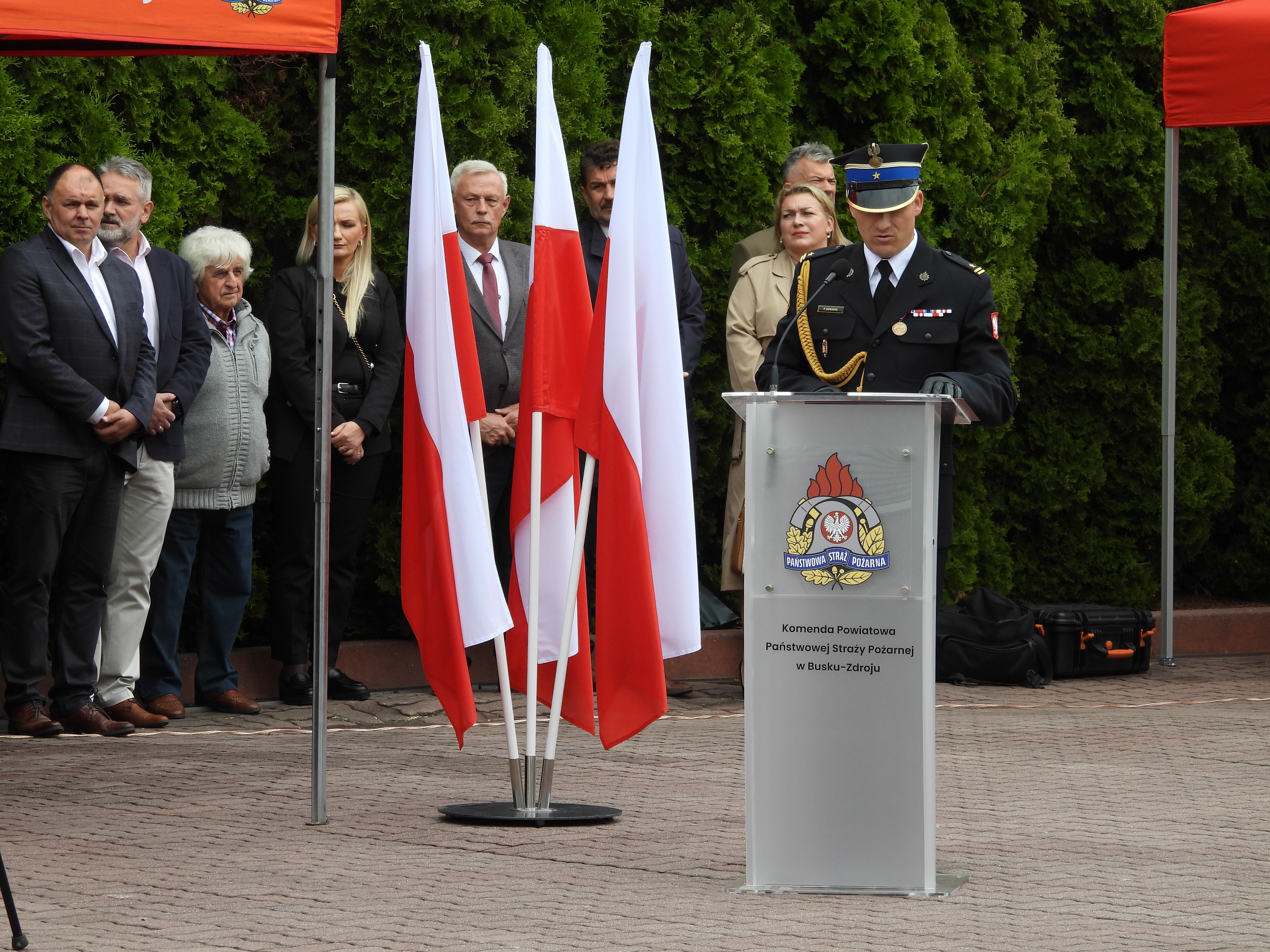 Następnie Komendant Powiatowy Państwowej Straży Pożarnej w Busku–Zdroju mł. bryg. Piotr Dziedzic przywitał zaproszonych gości. Uroczystość swoją obecnością zaszczycili : Zastępca Świętokrzyskiego Komendanta Wojewódzkiego PSP st. bryg. Marcin Machowski, Wicestarosta powiatu buskiego Pan Stanisław Klimczak, Burmistrzowie i Wójtowie, kierownictwo służ mundurowych (Policji, WCR), kierownictwo Straży Miejskiej, kierownictwo Nadleśnictwa Chmielnik oraz Pińczów, emerytowani strażacy buskiej komendy, prezesi Zarządów Oddziałów Miejsko-Gminnych i Gminnych ZOSP RP oraz prezesi jednostek Ochotniczych Straży Pożarnych.
