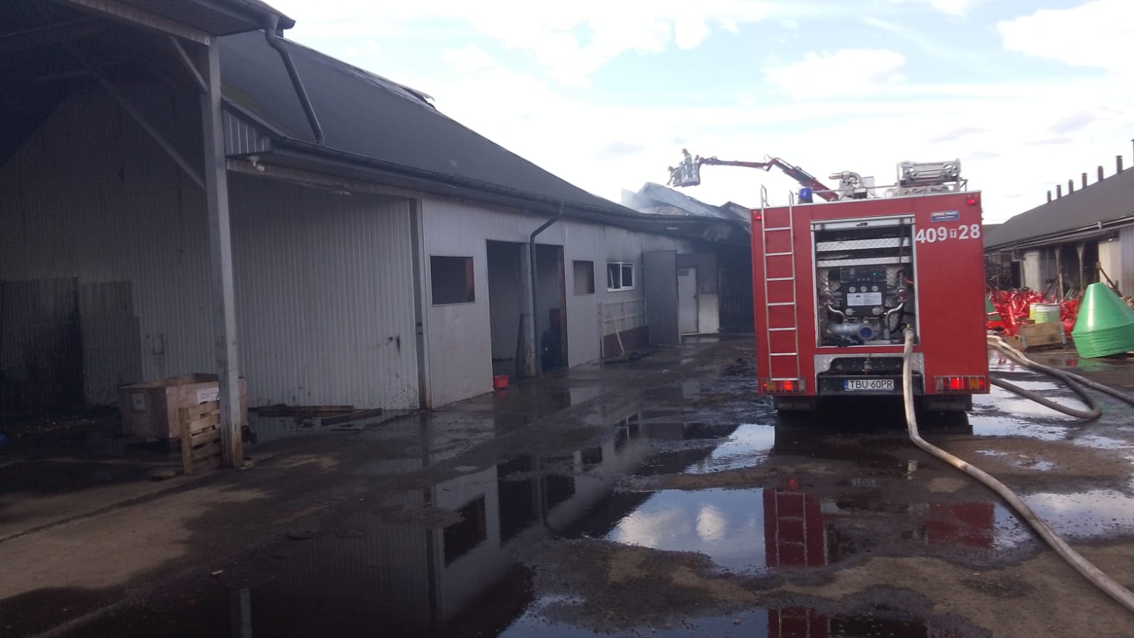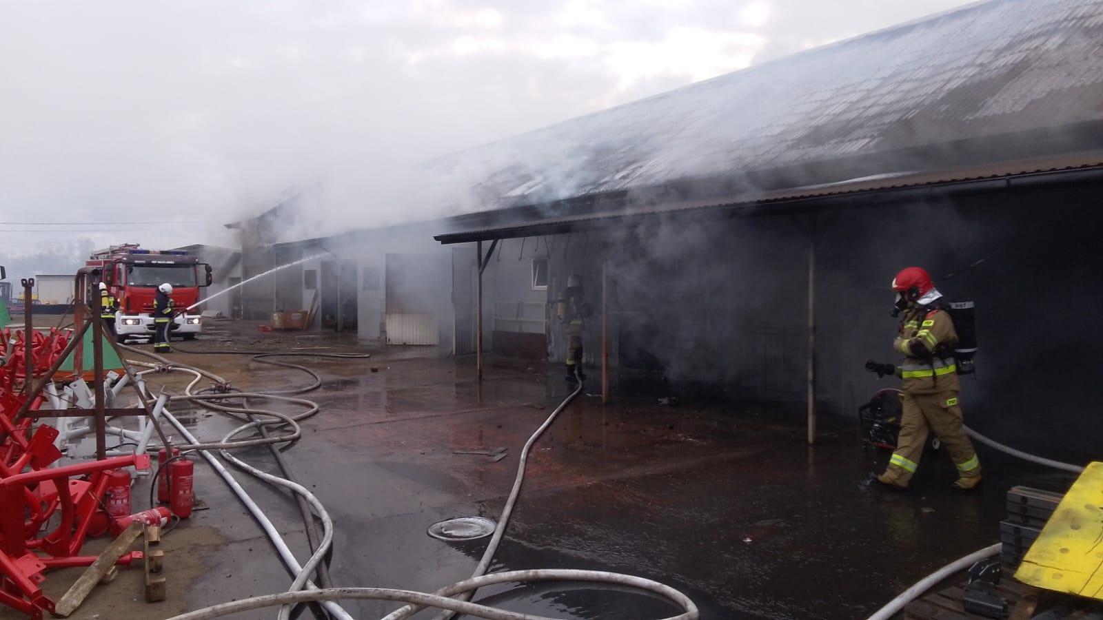 Po przybyciu na miejsce zdarzenia i przeprowadzeniu rozpoznania stwierdzono, że pali się hala produkcyjna w której znajdowały się kadzie z farbami, pomieszczenie spawalnicze i pomieszczenie do składania maszyn rolniczych. Brak osób poszkodowanych, pracownicy opuścili teren hali przed przybyciem Straży Pożarnej. Działania zastępów polegały na zabezpieczeniu miejsca zdarzenia, podaniu do wnętrza hali 4 prądów gaśniczych wody w natarciu oraz 2 prądów gaśniczych wody w obronie na przylegającą drugą halę. Działania prowadzono z użyciem podnośnika hydraulicznego. Po zlokalizowaniu pożaru przystąpiono do prac rozbiórkowych konstrukcji dachu celem zlokalizowania ukrytych zarzewi ognia. Po ugaszeniu pożaru pogorzelisko sprawdzono przy użyciu kamery termowizyjnej - nie stwierdzono zagrożenia.