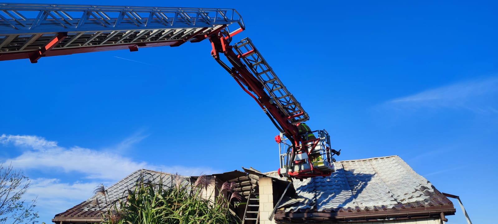 Po przybyciu zastępów straży pożarnej na miejsce zdarzenia i dokonaniu rozpoznania stwierdzono, że pali się poddasze budynku gospodarczego. Działania zastępów polegały na zabezpieczeniu miejsca zdarzenia oraz podaniu dwóch prądów gaśniczych wody w natarciu na palące się poddasze. Po zlokalizowaniu pożaru i sprawieniu podnośnika SHD 23 przystąpiono do rozbiórki spalonej więźby dachowej oraz blachy trapezowej będącej pokryciem dachu. Następnie siano znajdujące się na poddaszu przy pomocy podręcznego sprzętu burzącego złożono w bezpiecznym miejscu i na bieżąco przelewano wodą. Po ugaszeniu pożaru pogorzelisko sprawdzono kamerą termowizyjną pod kątem ewentualnych ukrytych zarzewi ognia - brak zagrożenia. Na miejscu pożaru oprócz JOP obecny był patrol Policji.