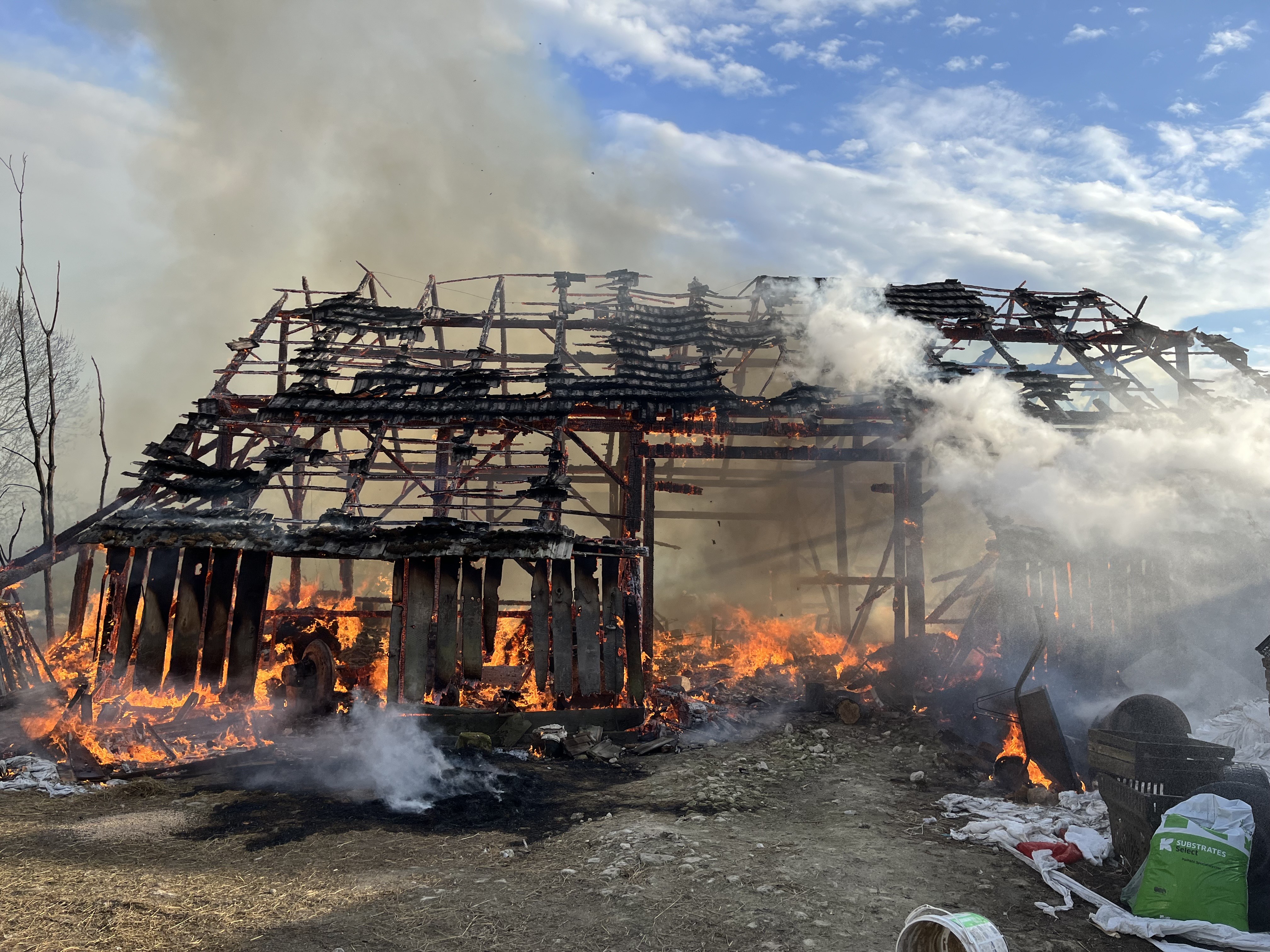 Po przybyciu na miejsce zdarzenia stwierdzono rozwinięty pożar stodoły oraz znajdujących się w pobliżu balotów. Brak osób poszkodowanych. Działania zastępów polegały na zabezpieczeniu miejsca zdarzenia, podaniu 4 prądów gaśniczych wody w natarciu na palący się budynek oraz 1 prąd gaśniczy wody w obronie na sąsiednią stodołę. Budynek uległ całkowitemu spaleniu. Po ugaszeniu pożaru przystąpiono do prac rozbiórkowych konstrukcji budynku przy użyciu podręcznego sprzętu burzącego, a następnie przelano wodą. Po zakończeniu działań sprawdzono pogorzelisko kamerą termowizyjną nie stwierdzając dodatkowych zarzewi ognia. W działaniach trwających 4 h zaangażowanych było łącznie 8 zastępów w sile 32 strażaków.