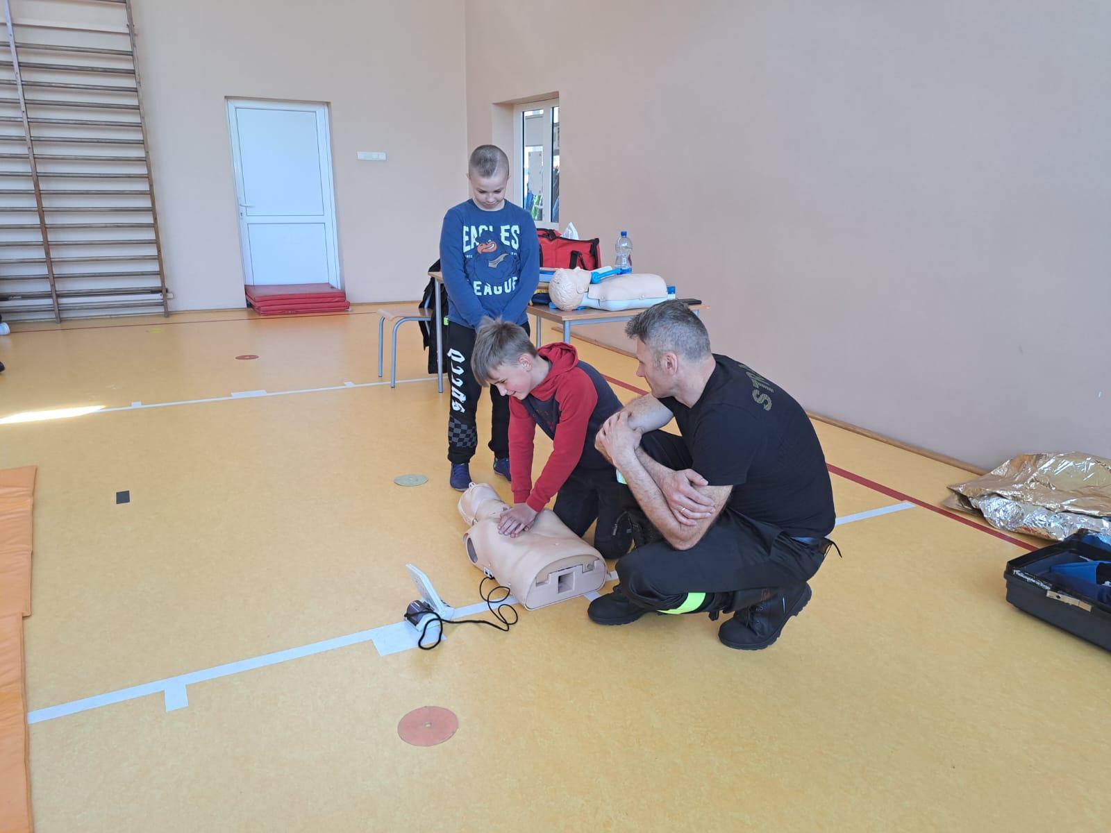 W dniu 11 kwietnia 2024 roku strażak Komendy Powiatowej Państwowej Straży Pożarnej w Busku-Zdroju w odpowiedzi na zaproszenie dyrekcji Szkoły Podstawowej w Raczycach, gm. Gnojno spotkał się z dziećmi tamtejszej placówki w celu przeprowadzenia prelekcji. Tematem przeprowadzonego szkolenia było zapoznanie dzieci z podstawowymi zasadami udzielania pierwszej pomocy, takich jak sprawdzenie bezpieczeństwa miejsca zdarzenia i ocena stanu poszkodowanego. Prelekcje przeprowadził strażak naszej komendy, który przekazał uczestnikom niezbędną wiedzę dotyczącą prawidłowego postępowania w sytuacjach takich jak zasłabnięcie, krwotok czy złamanie. Praktyczne ćwiczenia pozwoliły uczestnikom nauczyć się wykonywania podstawowych czynności resuscytacyjnych na manekinie z użyciem defibrylatora automatycznego AED, jak również zastosowania bandażowania, unieruchamiania urazów i tamowania krwotoków. Podczas szkolenia zostały również omówione kwestie związane z zasadami wezwania pomocy i zostały przypomniane numery alarmowe. Uczestnicy mieli okazję zadawać pytania i rozwiać wątpliwości związane z udzielaniem pierwszej pomocy. Prelekcja cieszyła się dużym zainteresowaniem uczniów, w spotkaniu wzięło udział ok. 120 dzieci i 11 opiekunów.
