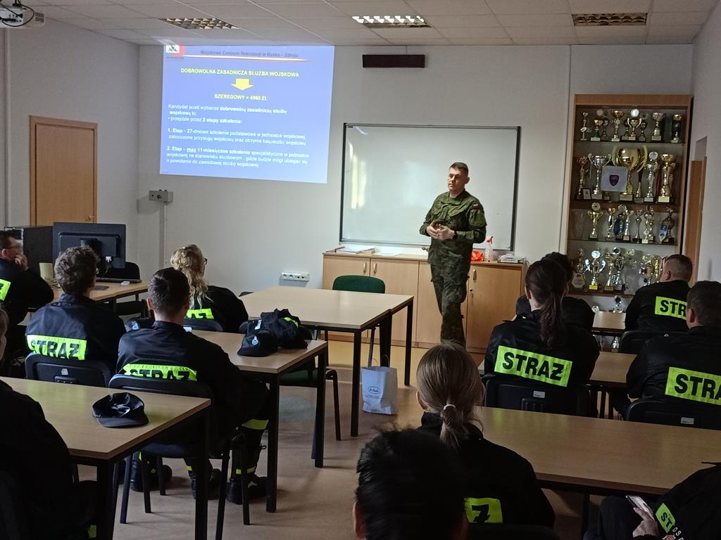 W trakcie trwania szkolenia słuchacze mieli zaszczyt gościć żołnierza z Wojskowego Centrum Rekrutacji w Busku-Zdroju – kpt. Tomasza Olszewskiego. Wizyta żołnierza miała na celu przedstawienie informacji dotyczących Dobrowolnej Zasadniczej Służby Wojskowej (DZSW), zapoznanie uczestników szkolenia z działaniami i obowiązkami żołnierzy oraz wymianą doświadczeń między obiema służbami. Podczas pogadanki podkreślono szczególną wagę współpracy i koordynacji działań w trudnych warunkach. Spotkanie z żołnierzem było nie tylko inspirujące, ale również dodatkowo motywujące dla strażaków, którzy zdają sobie sprawę, że ich praca jest niezwykle istotna dla społeczności lokalnej.