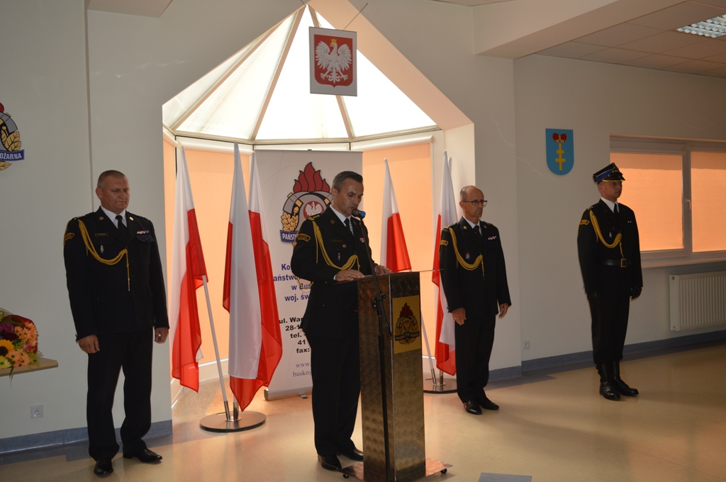 Uroczystość rozpoczęła się od złożenia meldunku Komendantowi Powiatowemu PSP w Busku - Zdroju – st. bryg. Arturowi Brachowiczowi po czym wprowadzony został sztandar Komendy Powiatowej PSP w Busku - Zdroju.