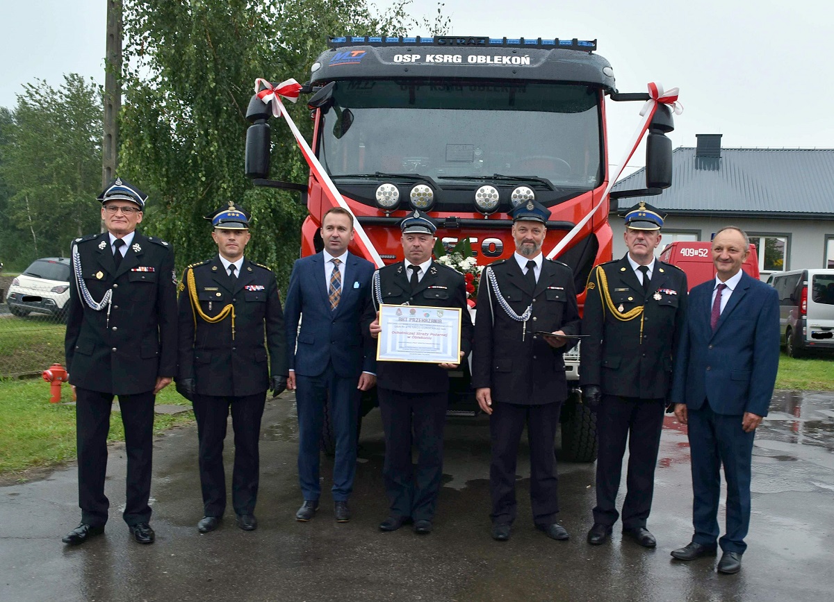 Następnie po dokonaniu poświęcenia pojazdu przez Kapelana strażaków ks. Kajetana Burzyńskiego oraz Proboszcza Parafii Oblekoń ks. Lucjana Sańprucha, nastąpiło uroczyste wręczenie aktu przekazania oraz kluczyków do nowego samochodu strażackiego, którego dokonali dostojni goście w osobach: Pan Michał Cieślak – Poseł na Sejm, Pan Józef Zuwała reprezentujący WFOŚiGW w Kielcach, st. bryg. Artur Brachowicz - zastępca świętokrzyskiego komendanta wojewódzkiego PSP, bryg. Grzegorz Karwat - komendant powiatowy PSP oraz Pan Wiesław Skop – Burmistrz Miasta i Gminy Pacanów.