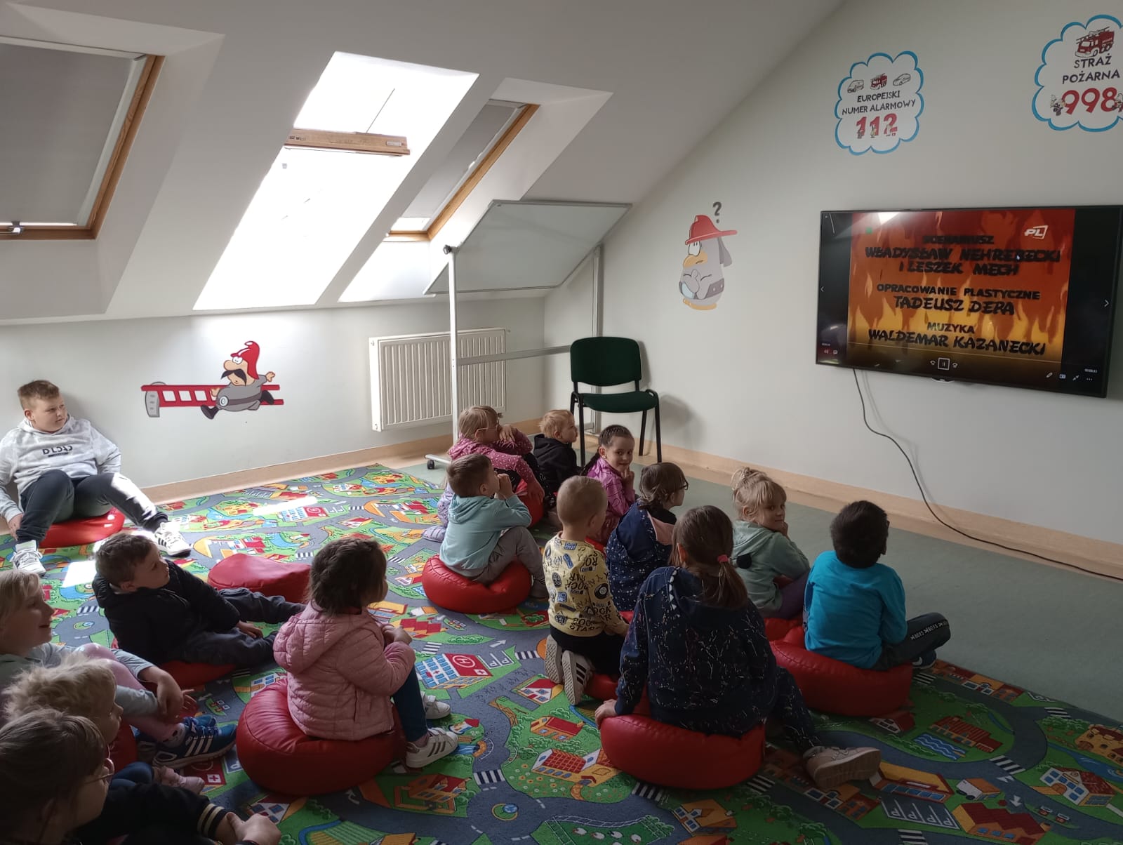 Zajęcia w sali edukacyjnej „Ognik” w Komendzie Powiatowej PSP w Busku – Zdroju dla dzieci ze Szkoły Podstawowej w Zagości