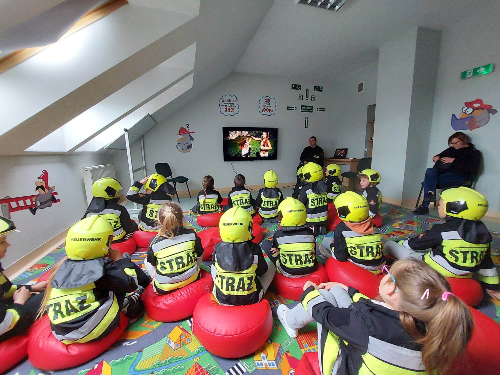 Zajęcia w sali edukacyjnej „Ognik” w Komendzie Powiatowej PSP w Busku–Zdroju dla dzieci z Zespołu Szkolno-Przedszkolnego w Wiślicy