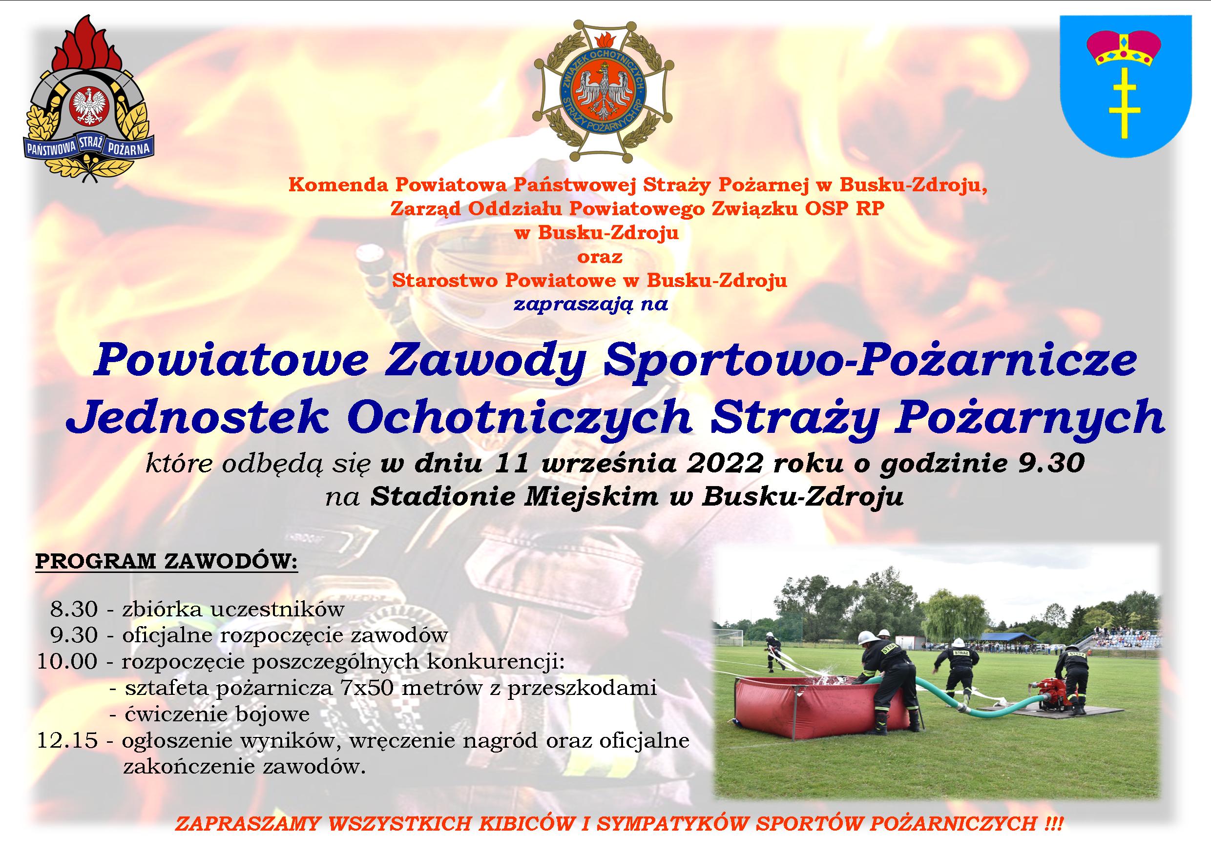 Komenda Powiatowa Państwowej Straży Pożarnej w Busku-Zdroju, Zarząd Odziału Powiatowego Związku Ochotniczych Straży Pożarnych RP oraz Starostwo Powiatowe w Busku-Zdroju jako organizatorzy, zapraszają na zawody sportowo-pożarnicze szczebla powiatowego jednostek Ochotniczych Straży Pożarnych, które odbędą się w dniu 11 września 2022 roku o godzinie 9:30 na stadionie miejskim w Busku-Zdroju.