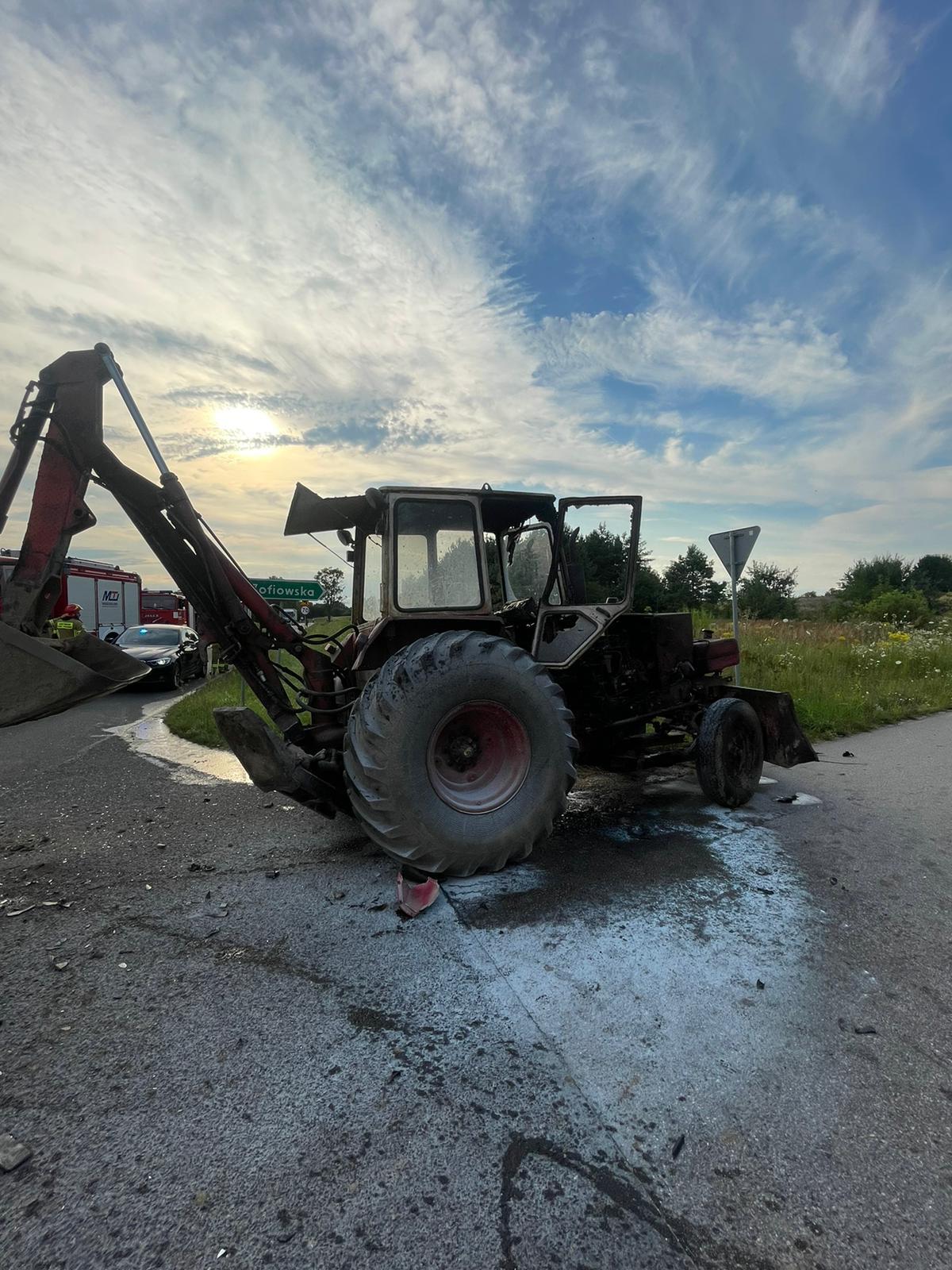 Zdarzenie drogowe motocykla z koparko-ładowarką w miejscowości Wola Zofiowska, gm. Gnojno