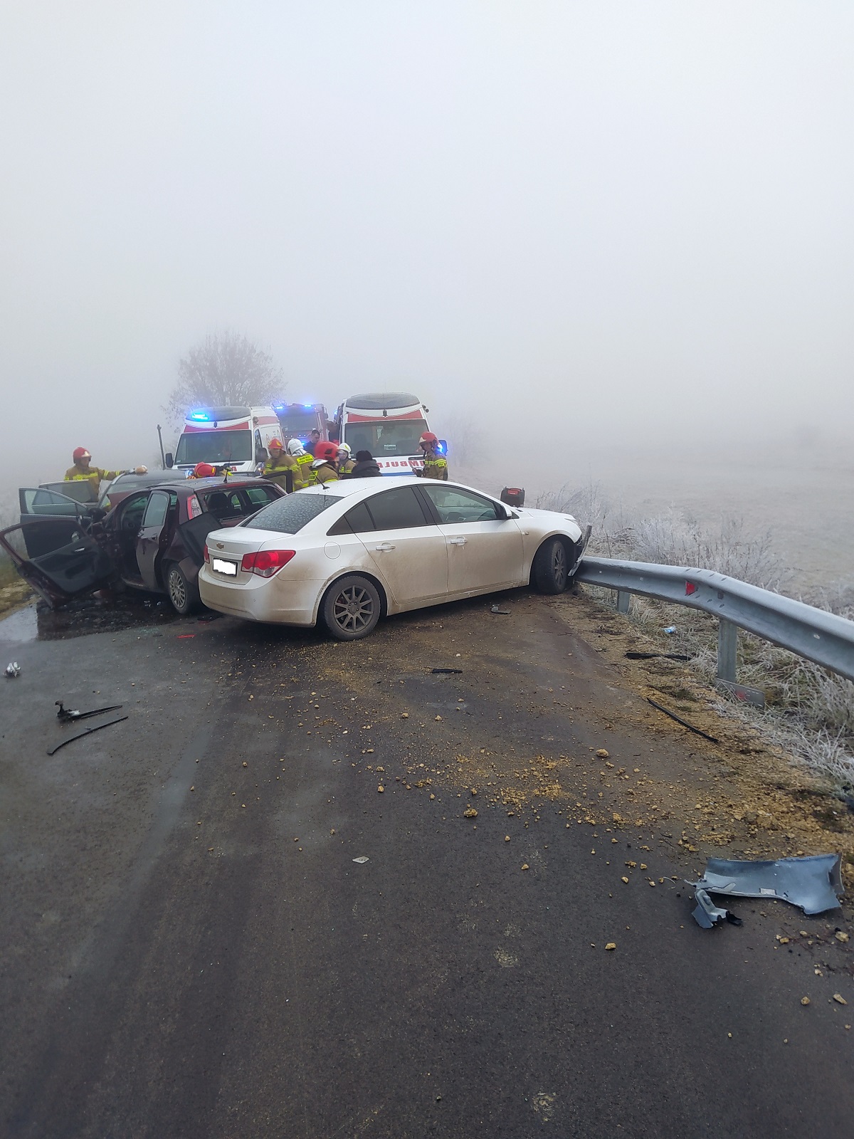 4 stycznia 2023 roku. o godz. 8:40 do Stanowiska Kierowania Komendanta Powiatowego Państwowej Straży Pożarnej w Busku – Zdroju wpłynęło zgłoszenie o wypadku komunikacyjnym na drodze powiatowej w miejscowości Siesławice gmina Busko - Zdrój. Do zdarzenia zostały zadysponowane trzy zastępy z JRG PSP Busko-Zdrój oraz jednostka OSP ze Zbludowic. Po dojeździe na miejsce zdarzenia jednostek ochrony przeciwpożarowej zabezpieczono teren akcji i przeprowadzono rozpoznanie. Ustalono, że w zdarzeniu udział brały trzy samochody osobowe, którymi podróżowało łącznie cztery osoby. Jedna z osób poszkodowanych opuściła pojazd o własnych siłach, natomiast pozostałe trzy osoby poszkodowane uwięzione były w uszkodzonych samochodach. Działania JOP polegały na wykonaniu dostępu przy użyciu narzędzi hydraulicznych do poszkodowanych, wydobyciu ich na zewnątrz pojazdów i przekazaniu pod opiekę ZRM. Równocześnie z prowadzonymi działaniami ratowniczymi, odłączono akumulatory w uszkodzonych pojazdach oraz dokonano sorpcji rozlanych płynów eksploatacyjnych. Droga na czas prowadzonych działań była całkowicie zablokowana.