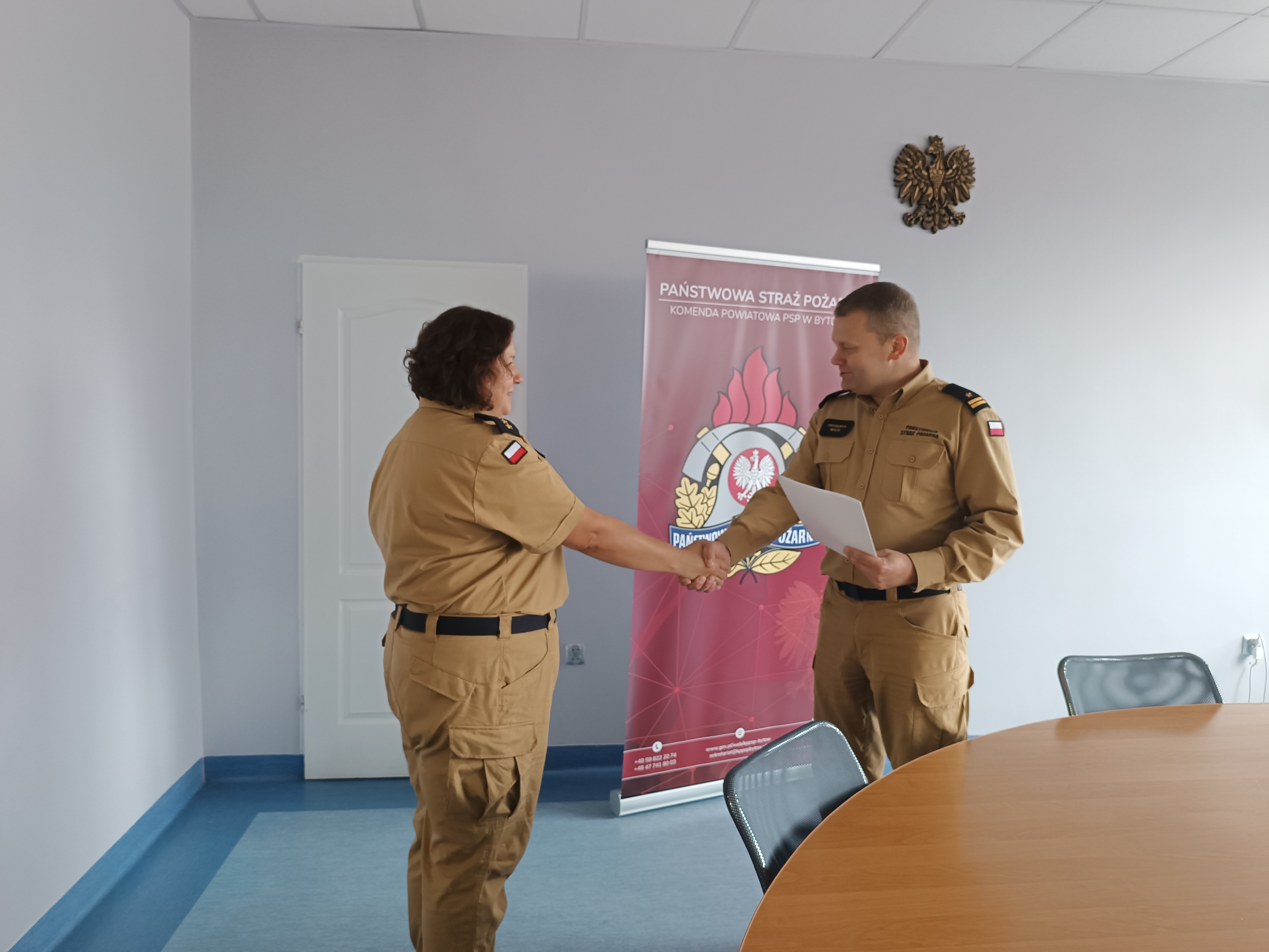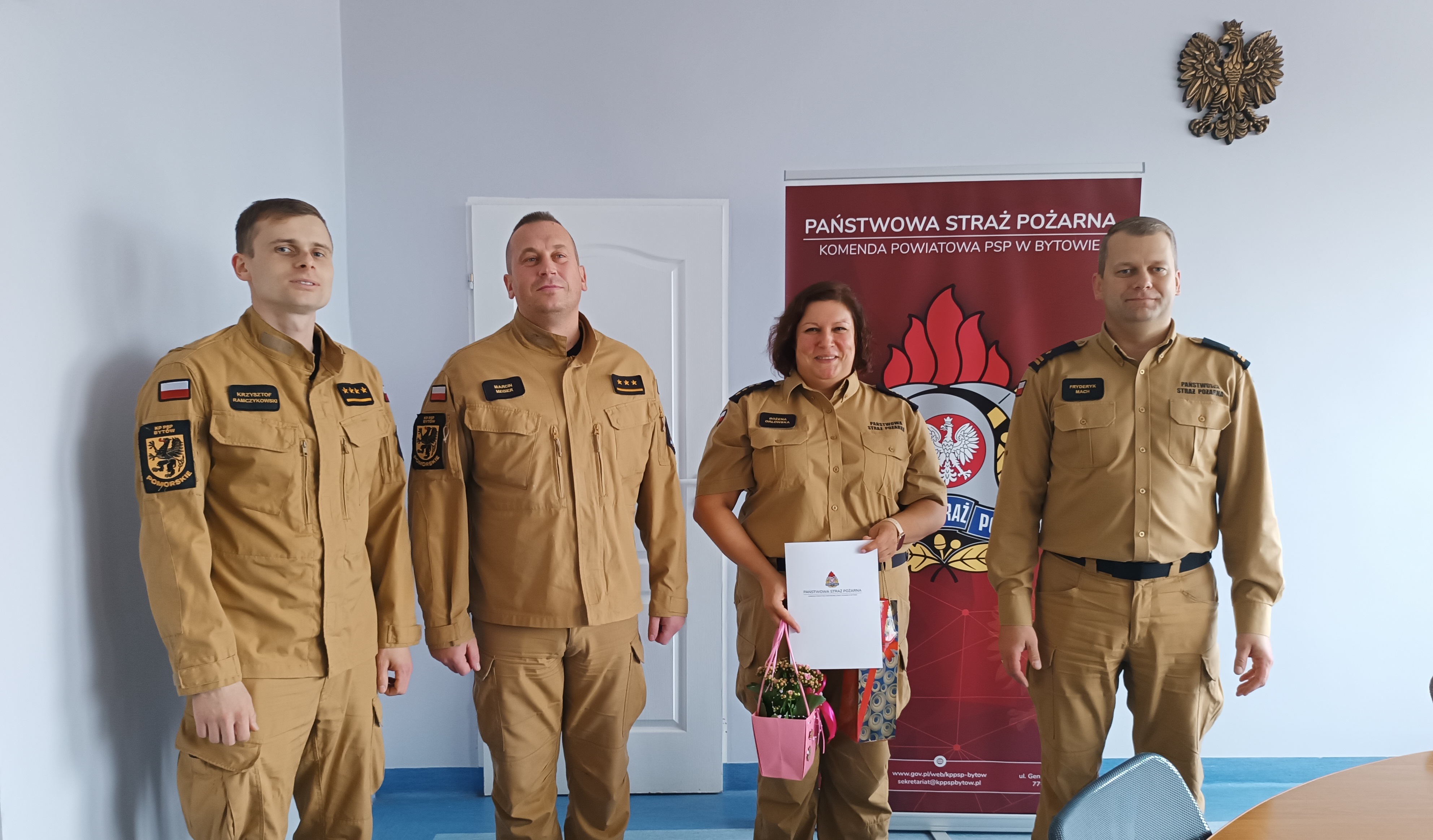 29 października 2024 roku, podczas uroczystej zbiórki w Komendzie Powiatowej Państwowej Straży Pożarnej w Bytowie, st. kpt. Bożena Orłowska z rąk Komendanta Powiatowego PSP w Bytowie mł. bryg. Fryderyka Mach otrzymała nagrodę jubileuszową z okazji 25-lecia pracy i służby.