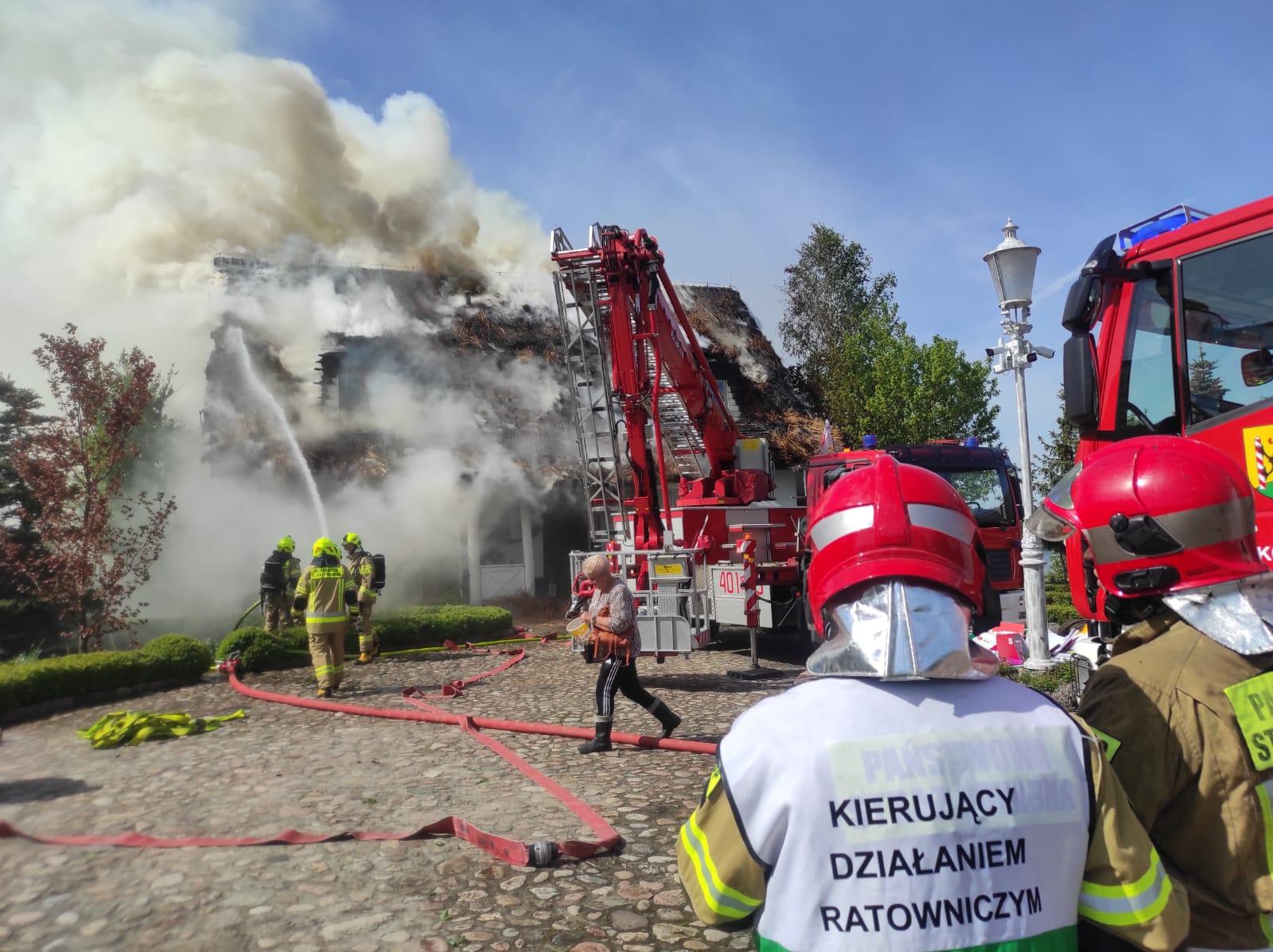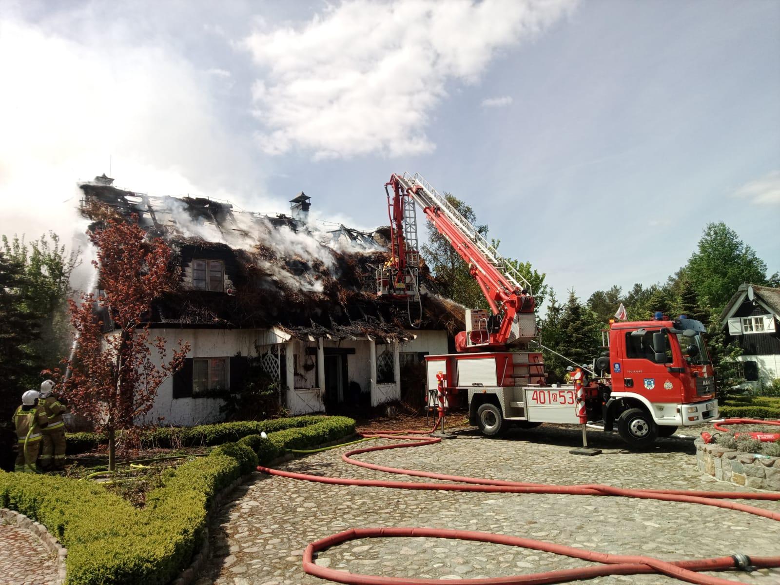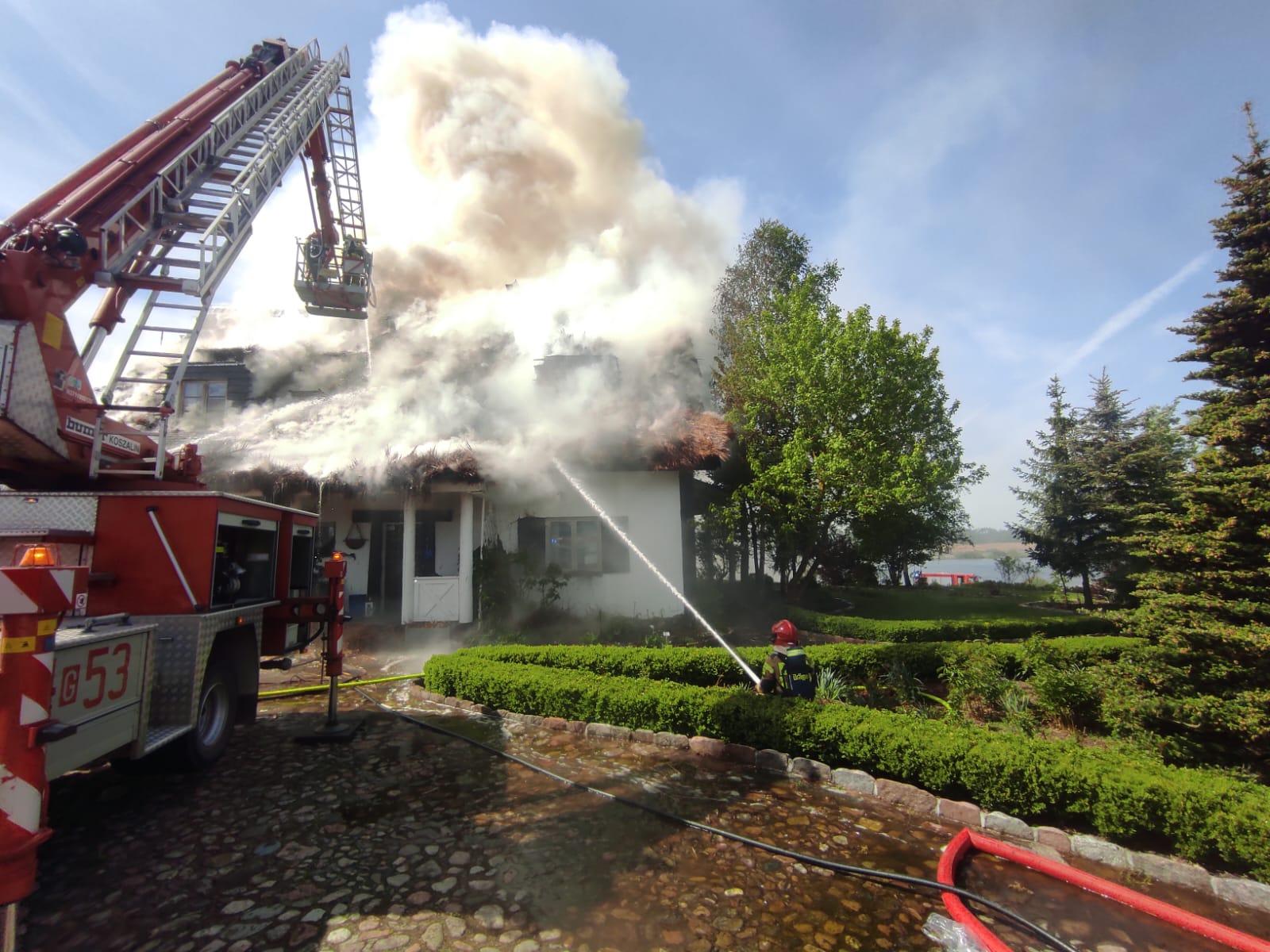Po przybyciu na miejsce zdarzenia zastępów straży pożarnej stwierdzono, że pali się dach budynku mieszkalnego, krytego strzechą. Po przybyciu pierwszych zastępów zabezpieczono miejsce zdarzenia. Prowadzono obronę obiektu sąsiedniego. Działania gaśnicze przy palącym się budynku prowadzono z zewnątrz oraz podjęto próbę wprowadzenia roty gaśniczej do wnętrza budynku. Z uwagi na intensywny rozwój pożaru działania w dalszej fazie działania prowadzone były tylko z zewnątrz. Sukcesywnie zwiększano ilość prądów wody wraz z przybyciem kolejnych zastępów ratowniczych. W działaniach korzystano z podnośnika SH-25D. Zaopatrzenie wodne odbywało się z pobliskiego jeziora. Na szczęście nikt nie odniósł obrażeń.
