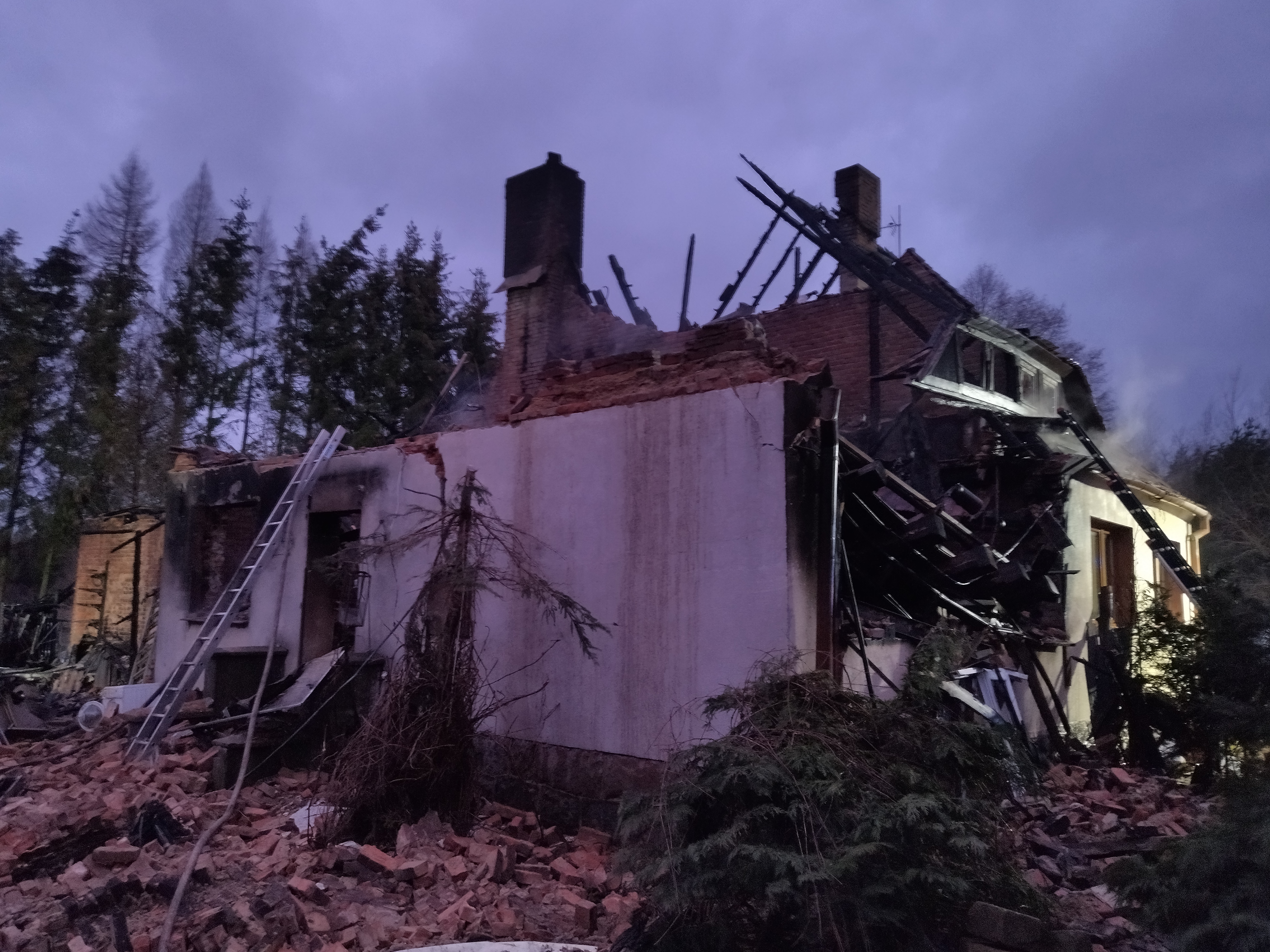 Po przybyciu na miejsce zdarzenia stwierdzono, że pożarem objęty jest całkowicie budynek mieszkalny. Dwie osoby dorosłe i dziecko, które zamieszkiwały jedno z mieszkań, ewakuowały się z palącego budynku przed przybyciem zastępów straży pożarnej. Podano cztery prądy wody w natarciu na palący się obiekt oraz zorganizowano zaopatrzenie wodne z pobliskiego stawu i hydrantu. Działania gaśnicze były wyjątkowo trudne ze względu na bardzo silny wiatr.