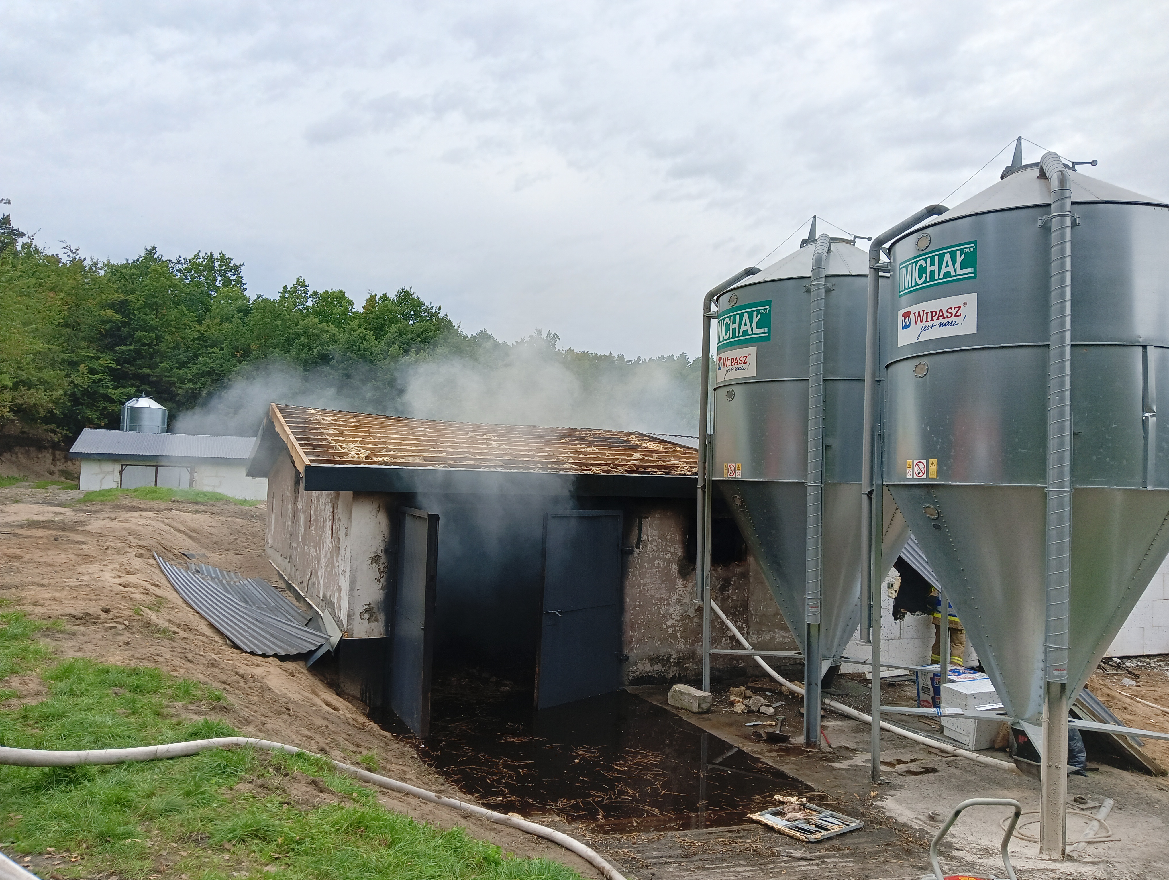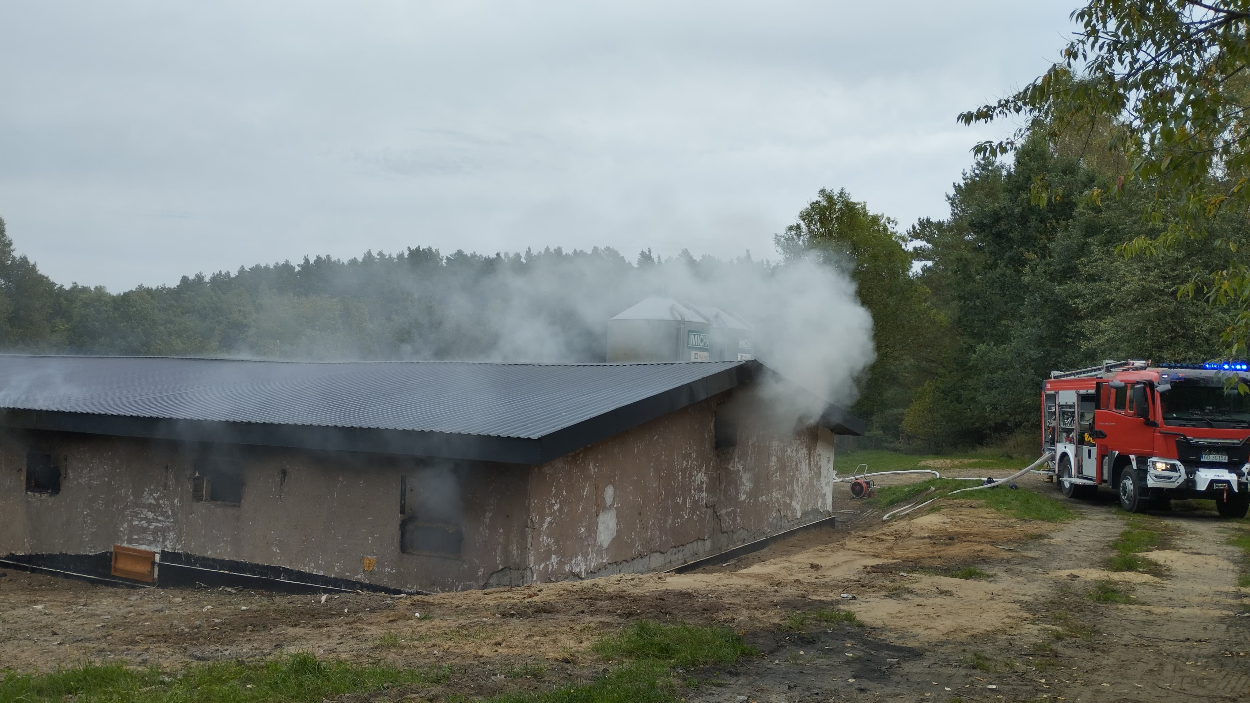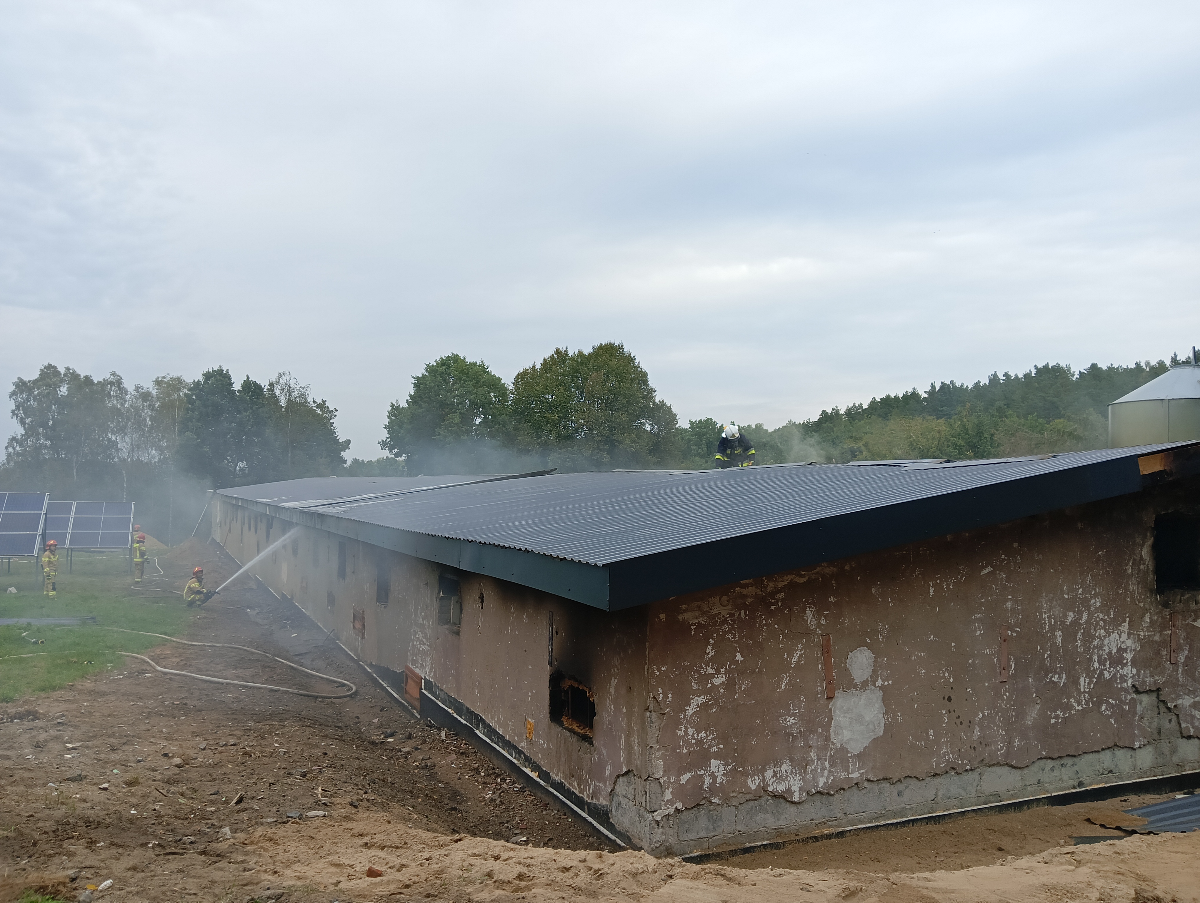 Po przybyciu na miejsce zdarzenia stwierdzono, że pali się budynek inwentarski - kurnik. W budynku panowało silne zadymienie. Pożarem objęta była znaczna cześć obiektu, w którym przebywał drób. Podano cztery prądy wody w natarciu do wnętrza budynku. Z uwagi na konieczność pracy w aparatach ochrony dróg oddechowych do działań zadysponowano samochód SPGaz z dodatkowymi aparatami powietrznymi i butlami. Dostarczenie wody do miejsca pożaru odbywało się poprzez dowożenie. Wstępne straty oszacowano na ok. 480 tys. złotych. W wyniku pożaru nie było osób poszkodowanych, jednak padło 12500 sztuk drobiu.
