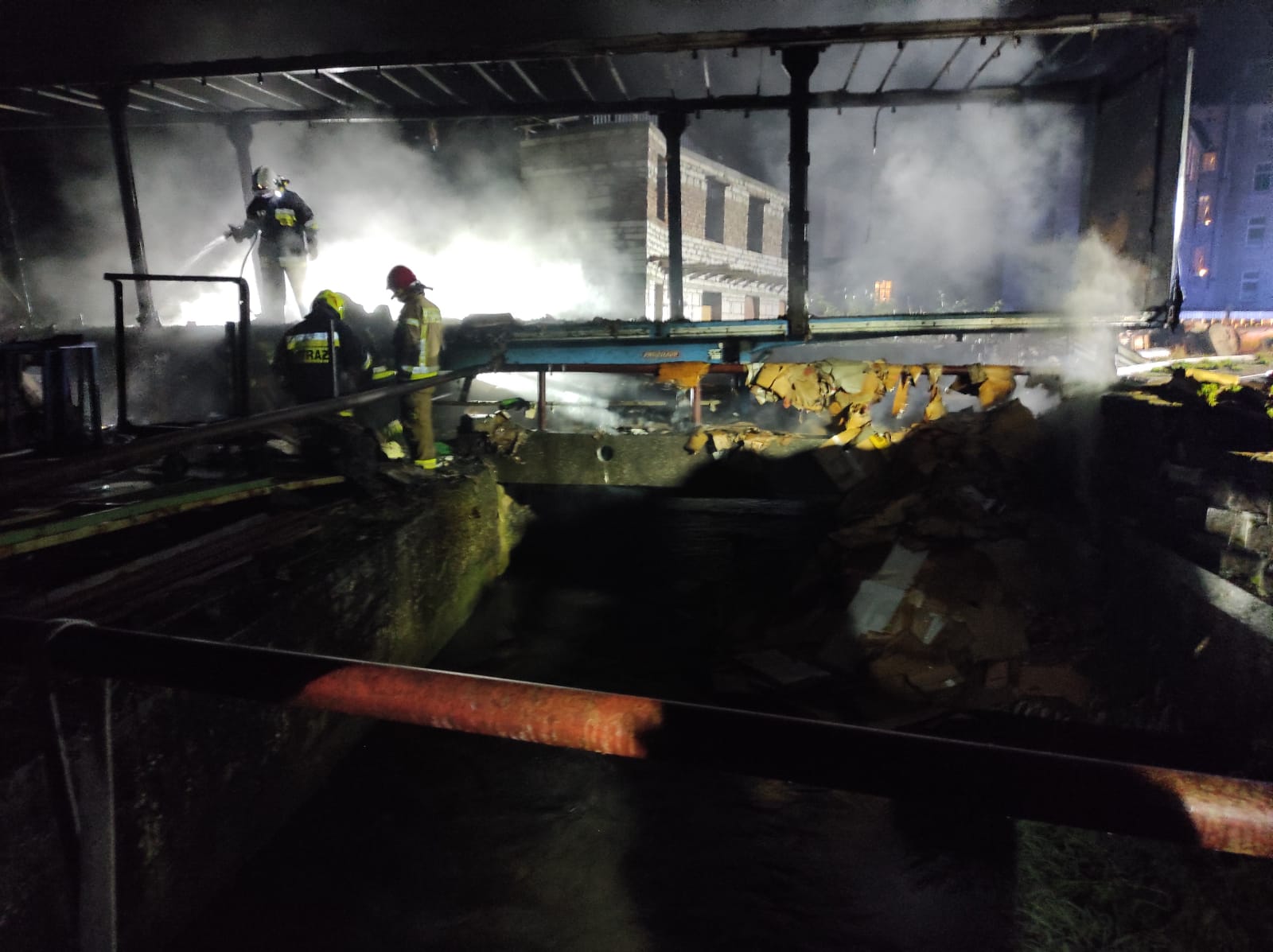 Po zabezpieczeniu miejsca zdarzenia podano trzy prądy wody na palącą się naczepę. Z bezpośredniego sąsiedztwa naczepy odsunięto kilkanaście palet drewnianych, które były zagrożone pożarem. Kolejne przybyłe zastępy OSP wykonały zaopatrzenie wodne z wykorzystaniem pomp pływających, pobierając wodę z rzeki Borui przepływającej przez teren zakładu. Po zakończonych działaniach gaśniczych cały ładunek z naczepy został rozrzucony na placu i dogaszony prądami wody.