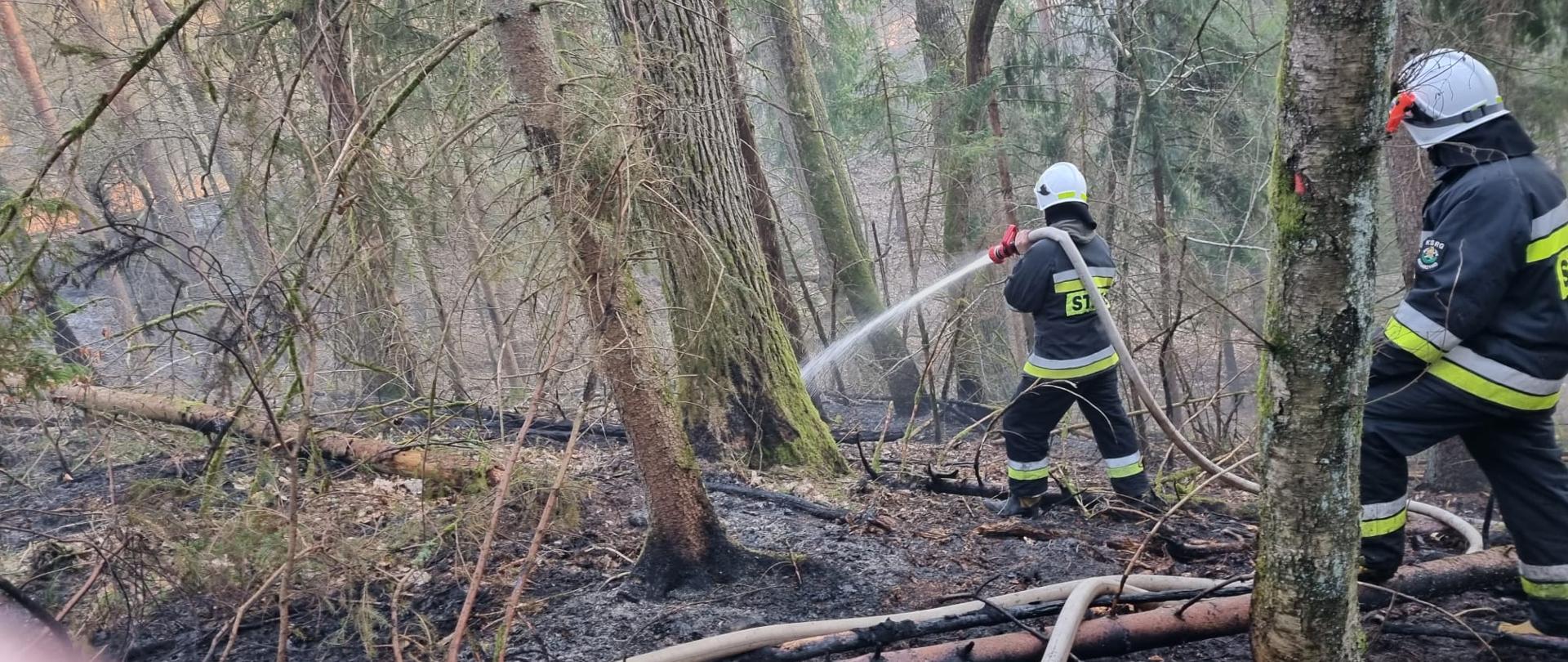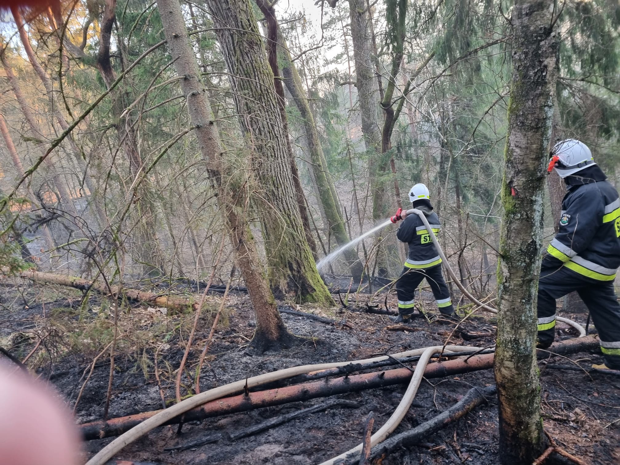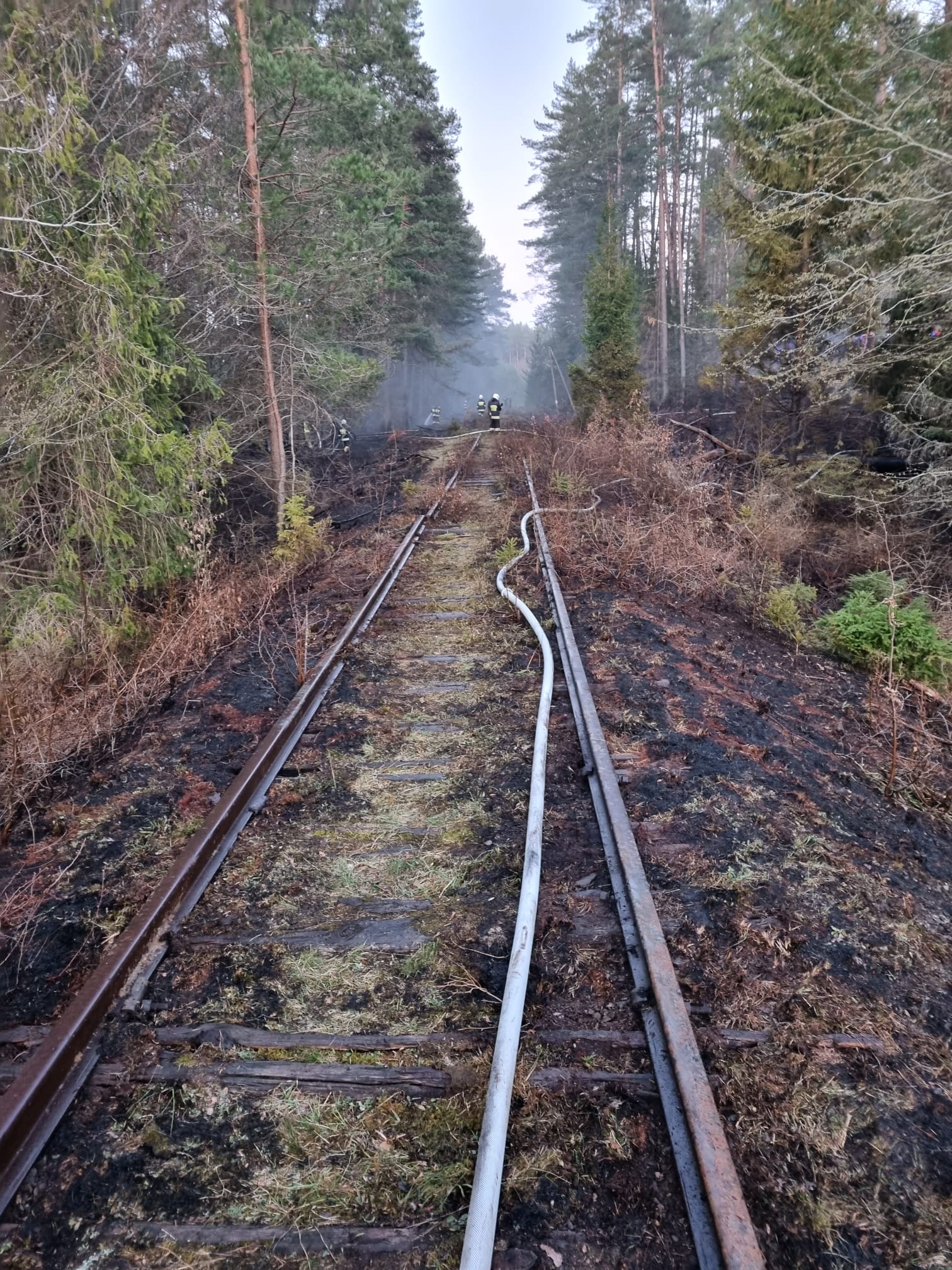 Po przybyciu na miejsce zdarzenia pierwszych zastępów OSP Borzytuchom i OSP Kołczygłowy stwierdzono, że pali się poszycie leśne oraz ściółka na powierzchni ok.1,5 ha. Pożar obejmował drzewostan dominujący w sosny, świerki oraz brzozy. Na miejscu zdarzenia działania gaśnicze prowadzili pracownicy nadleśnictwa Bytów oraz leśnictwa Jutrzenka. Przybyłe na miejsce jednostki JRG Bytów, OSP Niedarzyno, OSP Dąbrówka Bytowska oraz OSP Krosnowo wsparły działające zastępy oraz podały kolejne prądy w natarciu na palące się drzewa, tory kolejowe i poszycie po obu stronach mostu, drogi i lasu. Kolejni ratownicy w fazie budowania zasilania oraz stanowisk gaśniczych dogaszali miejsca najdalej wysunięte i trudno dostępne przy pomocy łopat i tłumic. Zasilanie wodne zbudowano z rzeki oddalonej ok. 400m, skąd zasilano jednostki OSP. Na miejsce zadysponowano patrol Policji oraz techników śledczych, celem wyjaśnienia i przeprowadzenia dochodzenia przyczyny z uwagi na charakter zdarzenia. Po ugaszeniu pożaru sprawdzono teren kamerą termowizyjną, aby wykluczyć zarzewia ognia, następnie sprzętem rolniczym zabezpieczono i oborano teren wokół pożaru. Pogorzelisko przekazano do zabezpieczenia i dozorowania leśniczemu oraz dyżurnym wyznaczonym i pozostającym na miejscu zdarzenia. Prawdopodobną przyczyna pożaru było zapalenie się poszycia podczas cięcia palnikiem elementów torów kolejowych. Szczegółowe dochodzenie prowadzi policja.