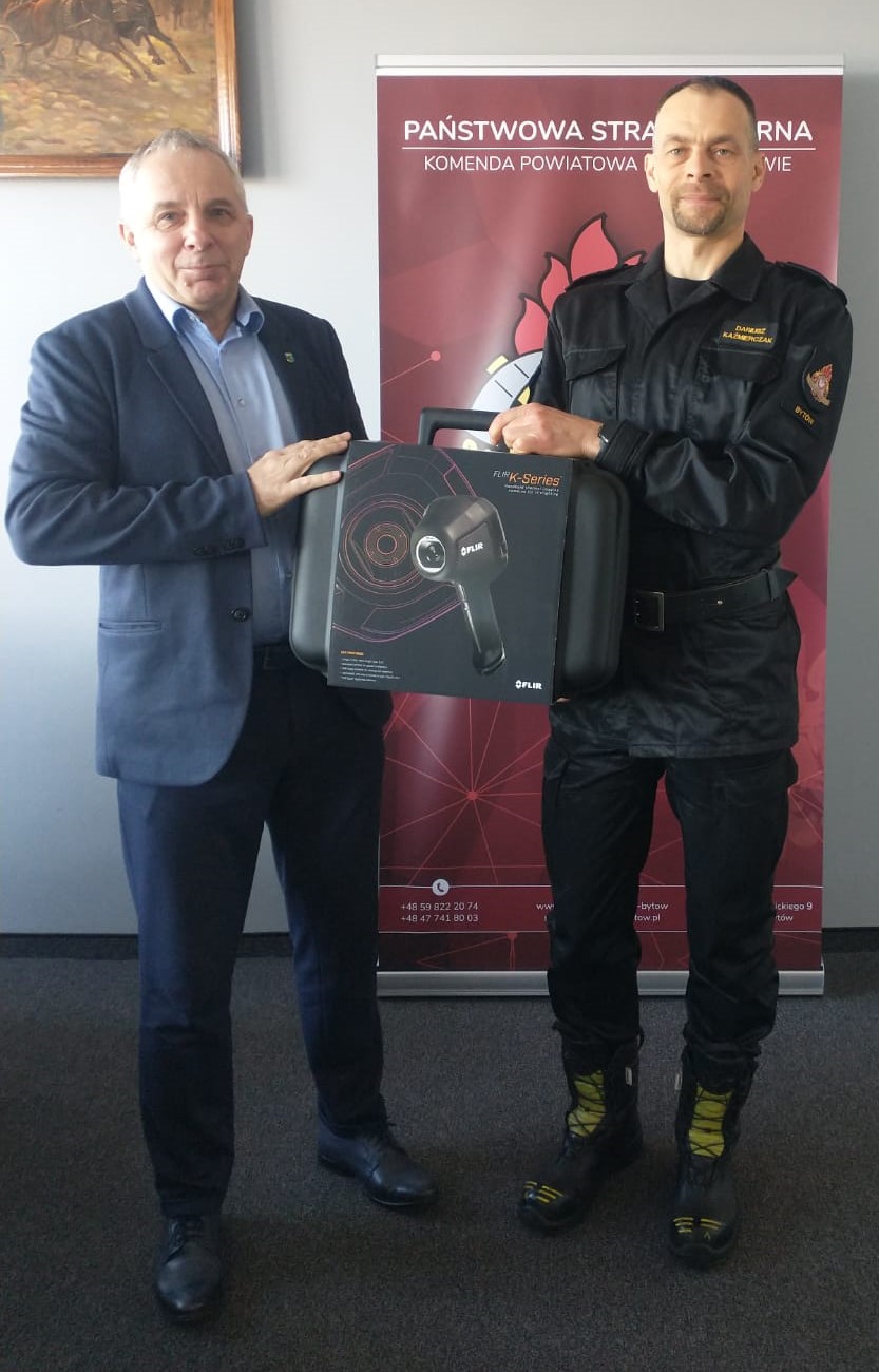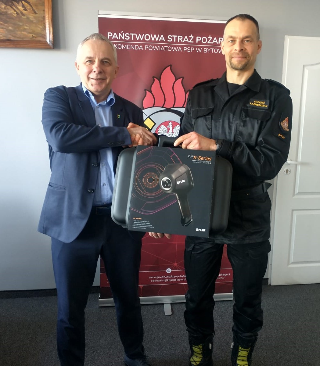 Dnia 31 marca 2022 r. Starosta Bytowski Leszek Waszkiewicz przekazał na ręce Komendanta Powiatowego PSP w Bytowie bryg. Dariusza Kaźmierczaka nowoczesną kamerę termowizyjną FLIR K33 wraz z wyposażeniem. Sprzęt został zakupiony w całości ze środków Powiatu Bytowskiego za kwotę 15000,00 zł.