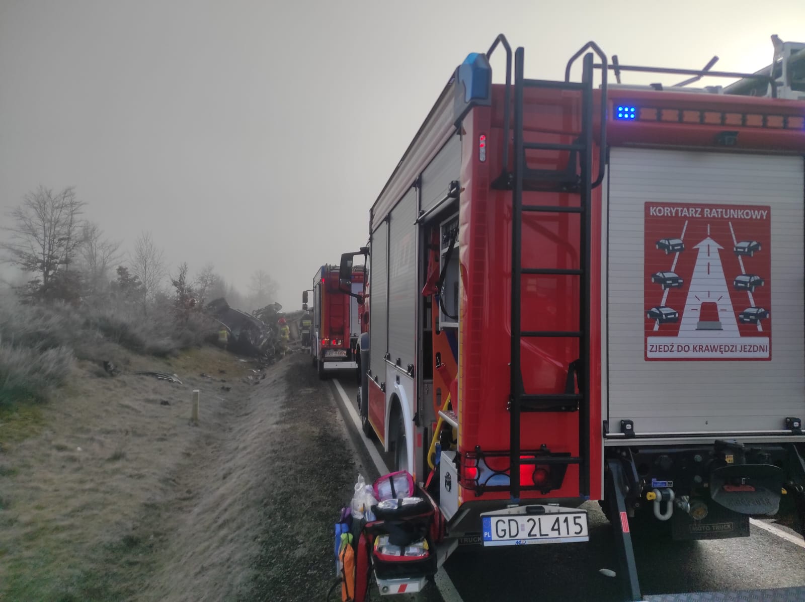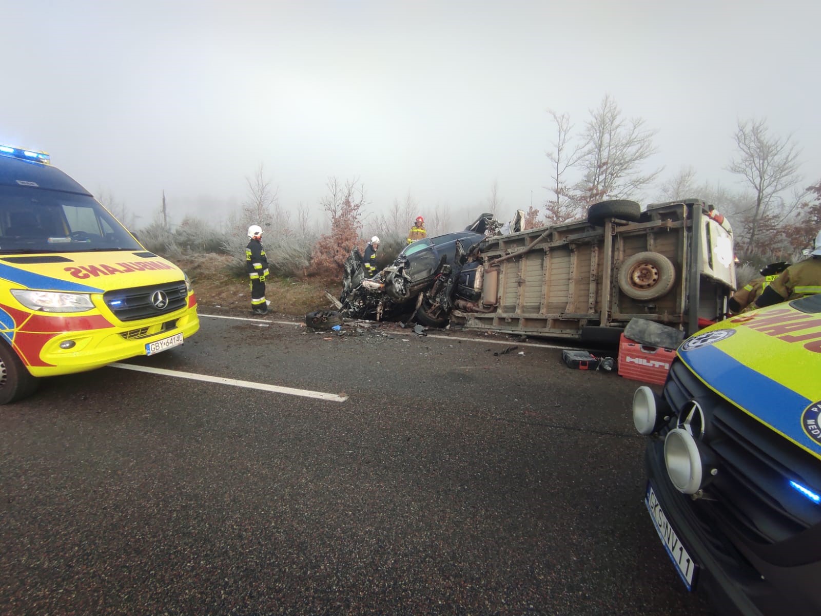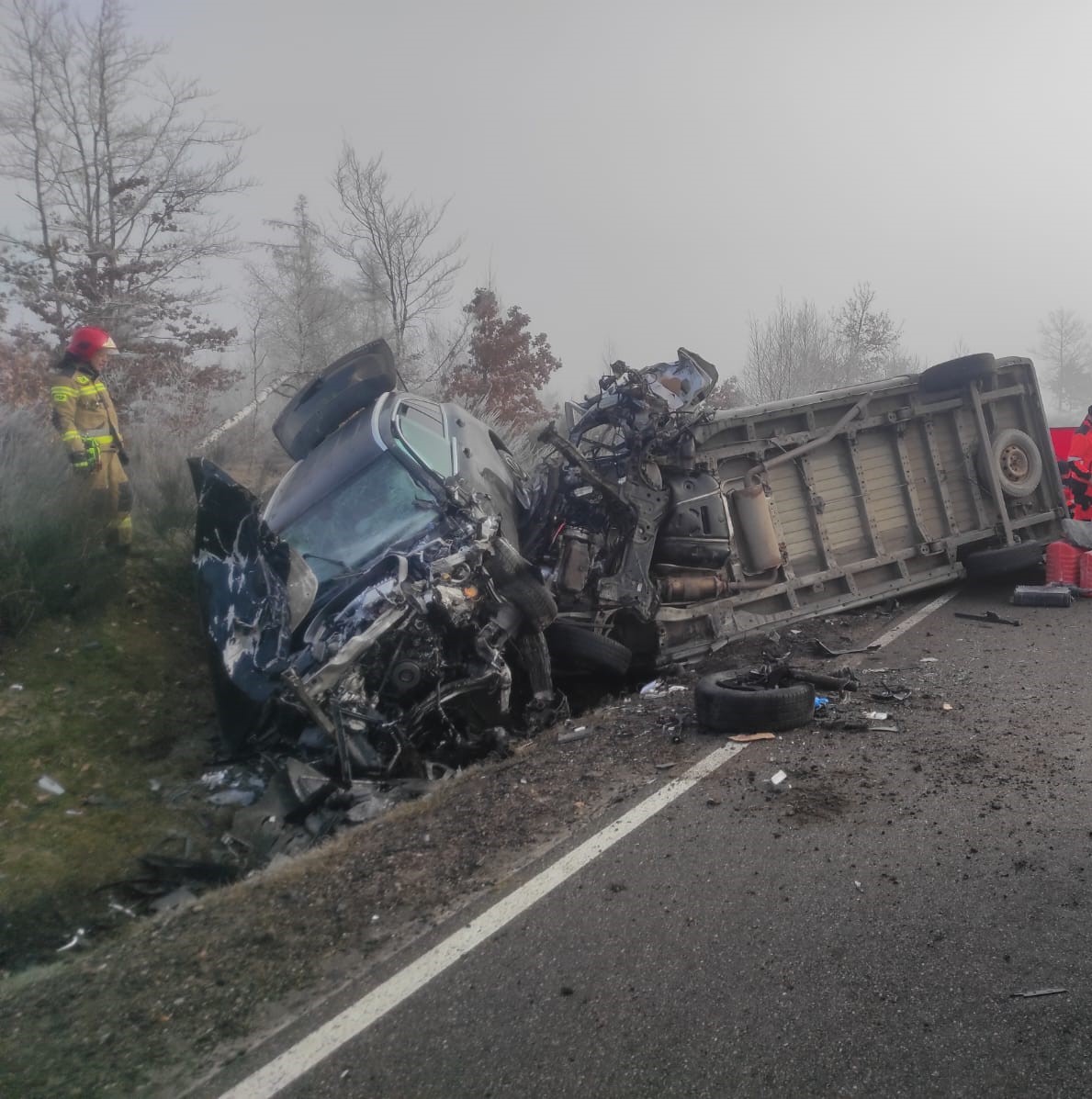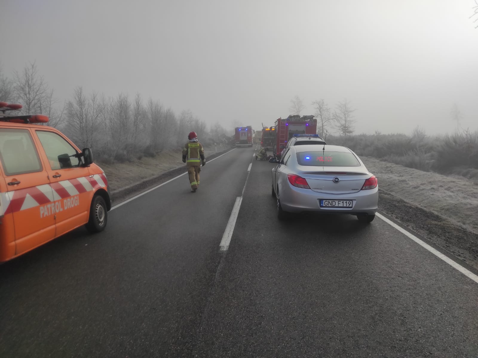 Po przybyciu na miejsce zdarzenia stwierdzono, że na drodze krajowej nr 20 doszło do zderzenia samochodu osobowego Mercedes GLC z samochodem dostawczym Fiat Ducato. W zdarzeniu udział brały 3 osoby (1 podróżujący samochodem osobowym i 2 samochodem dostawczym). Po rozpoznaniu sytuacji stwierdzono, że 2 osoby opuściły pojazdy o własnych siłach i znajdują się na poboczu drogi, a kierujący samochodem dostawczym nieprzytomny znajduje się w głębi pojazdu. Działania zastępów straży pożarnej polegały na zabezpieczaniu miejsca zdarzenia, udzieleniu kwalifikowanej pierwszej pomocy poszkodowanym i dotarciu do kierowcy Fiata. Po dotarciu do poszkodowanego i stwierdzeniu braku czynności życiowych przystąpiono do jego ewakuacji z wnętrza pojazdu, a następnie rozpoczęto resuscytację krążeniowo-oddechową. Pomimo udzielonej pomocy będący na miejscu zdarzenia lekarz stwierdził zgon. Dwaj pozostali poszkodowani zostali przewiezieni przez ZRM do szpitala.