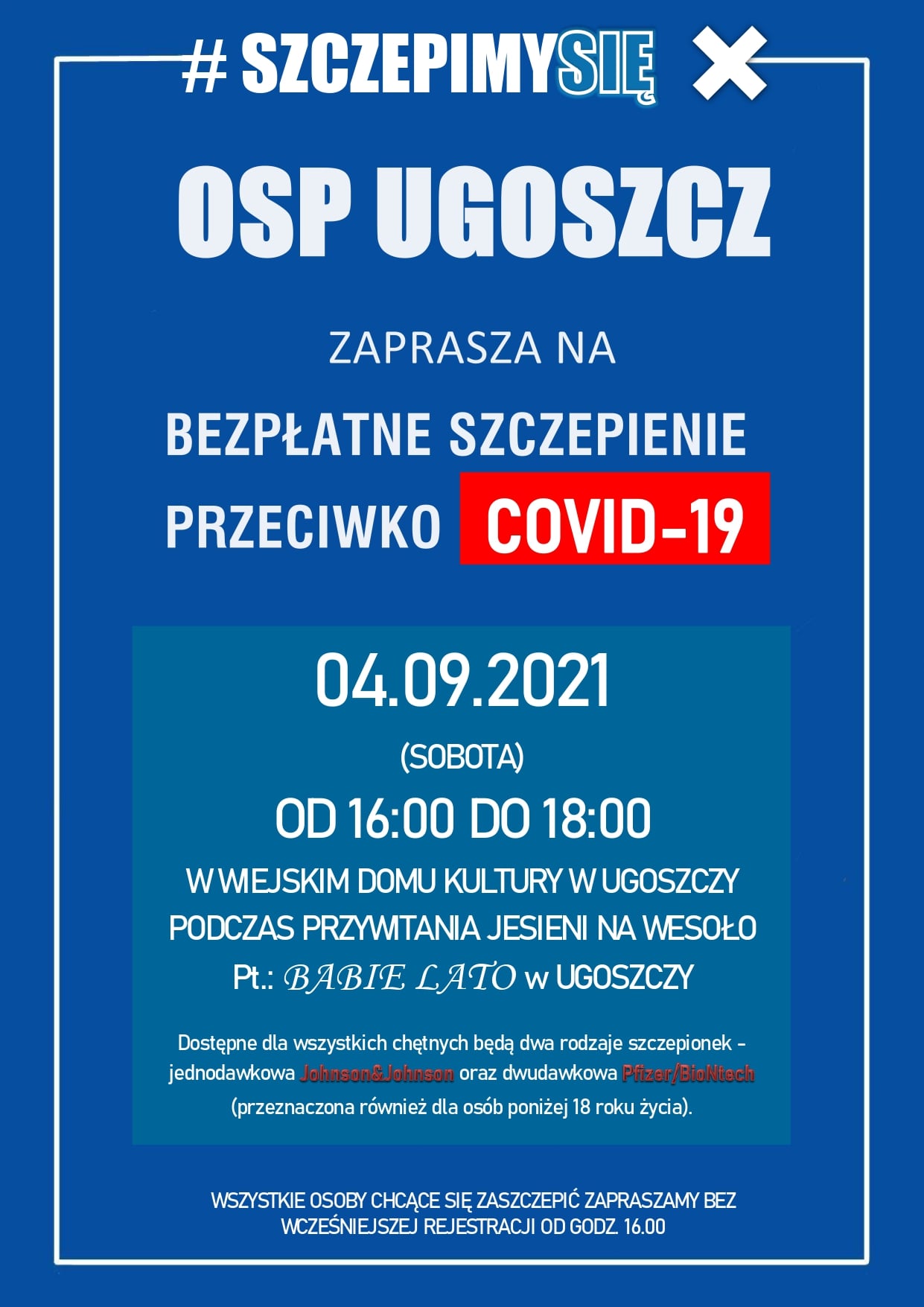 - 04 września 2021 r. w godzinach 16.00-18.00 podczas festynu pt. „Babie Lato w Ugoszczy” w Ugoszczy,