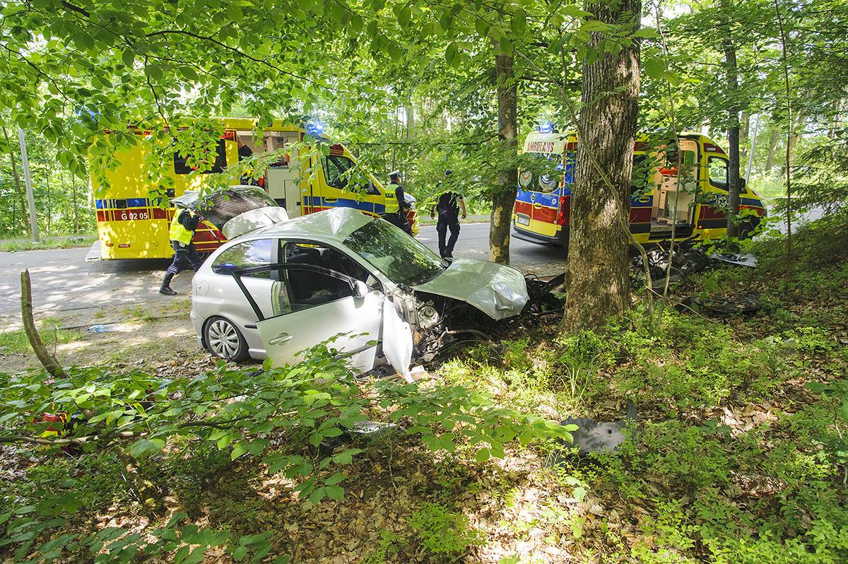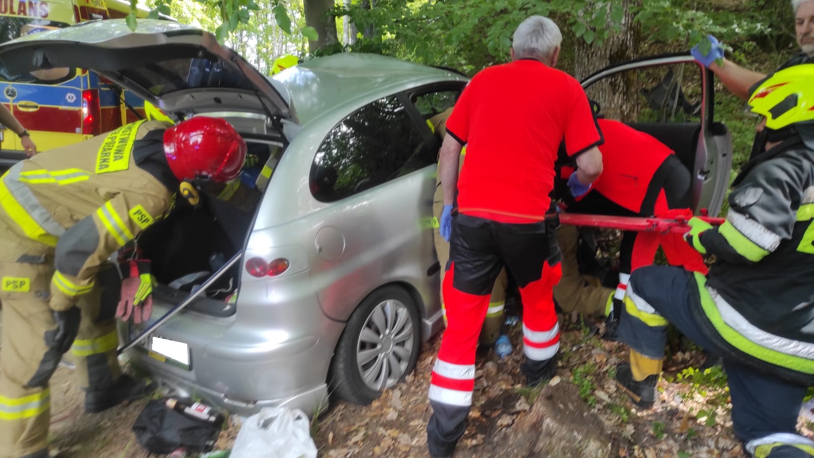 Po przybyciu na miejsce zdarzenia stwierdzono, że samochód osobowy uderzył w przydrożne drzewo. Pojazdem podróżowało 5 osób. W chwili przybycia zastępów straży pożarnej, trzy osoby samodzielnie opuściły pojazd i znajdowały się na zewnątrz, natomiast dwie osoby ranne przebywały w pojeździe. Strażacy zabezpieczyli miejsce zdarzenia, przy użyciu narzędzi hydraulicznych wykonali dostęp do osób poszkodowanych, które przekazano pod opiekę Zespołowi Ratownictwa Medycznego.