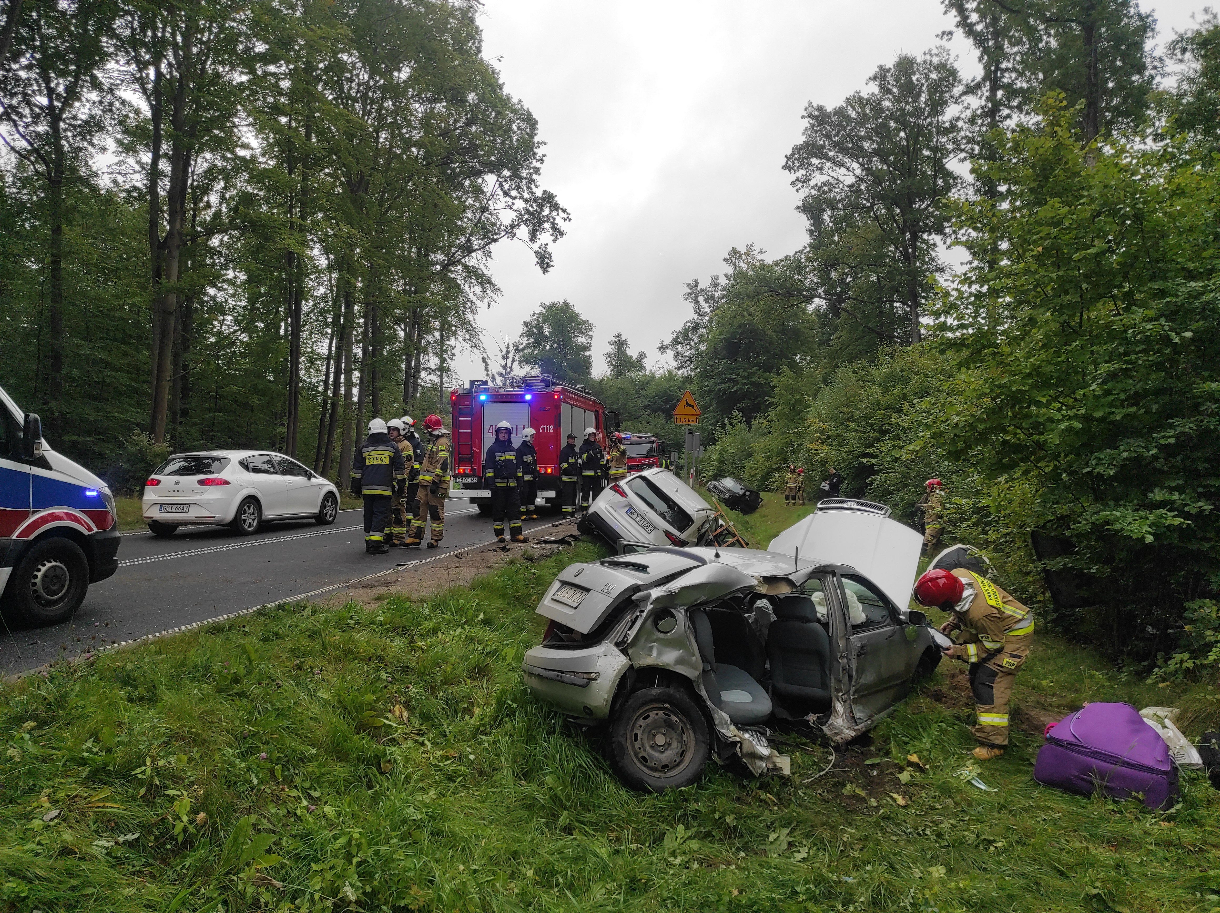 Po przybyciu na miejsce zdarzenia stwierdzono, że na drodze wojewódzkiej nr 209 doszło do zderzenia się trzech samochodów osobowych. W wyniku wypadku wszystkie pojazdy znalazły się w rowie obok drogi. Działania straży w pierwszej kolejności polegały na zabezpieczeniu miejsca zdarzenia, udzieleniu kwalifikowanej pierwszej pomocy, jednemu z poszkodowanych kierowców oraz stabilizacji pojazdu przechylonego na zboczu. Pozostali uczestnicy wypadku nie doznali obrażeń. Ustalenia w sprawie wypadku prowadzi Policja.