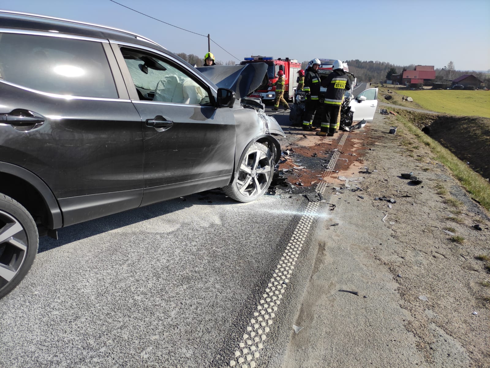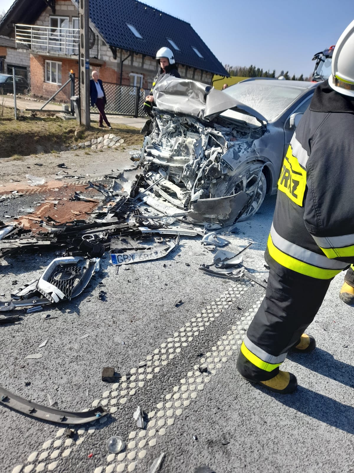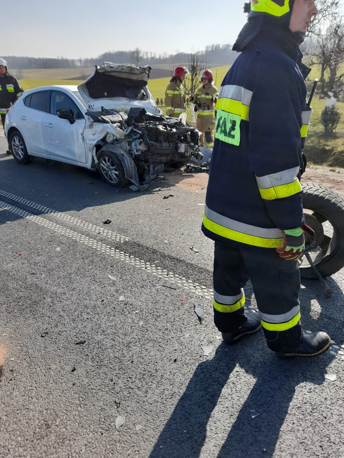 Po przybyciu na miejsce zdarzenia stwierdzono, że na drodze wojewódzkiej doszło do zderzenia trzech samochodów osobowych. Mazda jadąca od strony Bytowa uderzyła w jadącego przed nią Jeepa, a następnie czołowo zderzyła się z jadącym z przeciwka Nissanem. Po zderzeniu wszystkie samochody pozostały na jezdni, całkowicie blokując przejazd. Samochód Nissan po zderzeniu uległ zapaleniu w obrębie komory silnika - pożar został przygaszony za pomocą gaśnic przez osoby postronne. Ratownicy medyczni wraz ze strażakami udzieli pierwszej pomocy osobom poszkodowanym w wypadku. Dwie osoby poszkodowane zostały zabrane przez ZRM do szpitali. Rozwinięto linię szybkiego natarcia w celu dogaszenia komory silnika Nissana. We wszystkich pojazdach odłączono akumulatory ze względu na uszkodzenia instalacji elektrycznych. Plamy substancji ropopochodnych posypano sorbentem. Po zakończeniu czynności przez Policję pomoc drogowa usunęła uszkodzone samochody. Zebrano pozostałości po zdarzeniu.