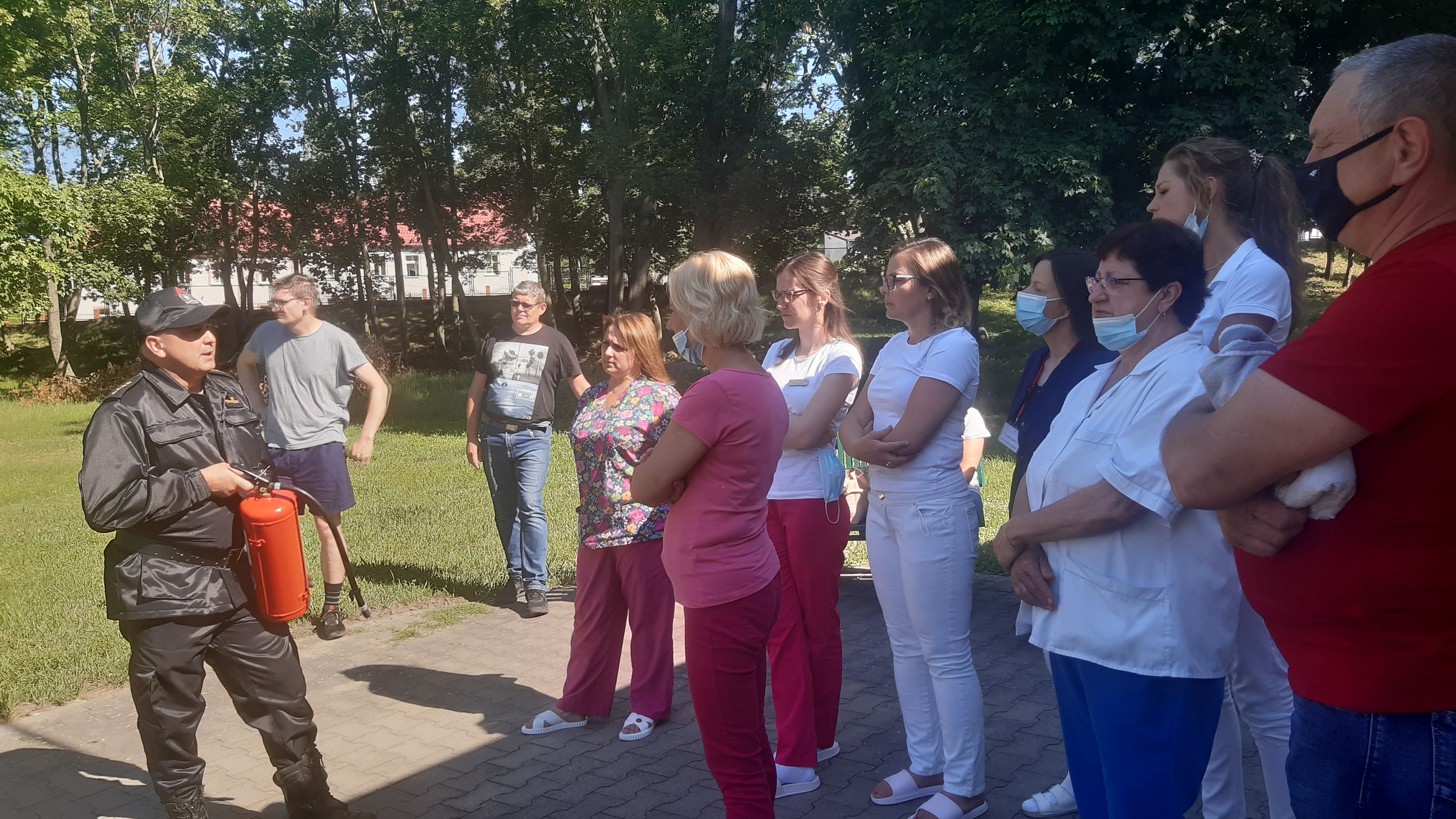Podczas ćwiczeń przeprowadzono krótkie szkolenie z obsługi podręcznego sprzętu gaśniczego, dla pracowników działu fizjoterapii.