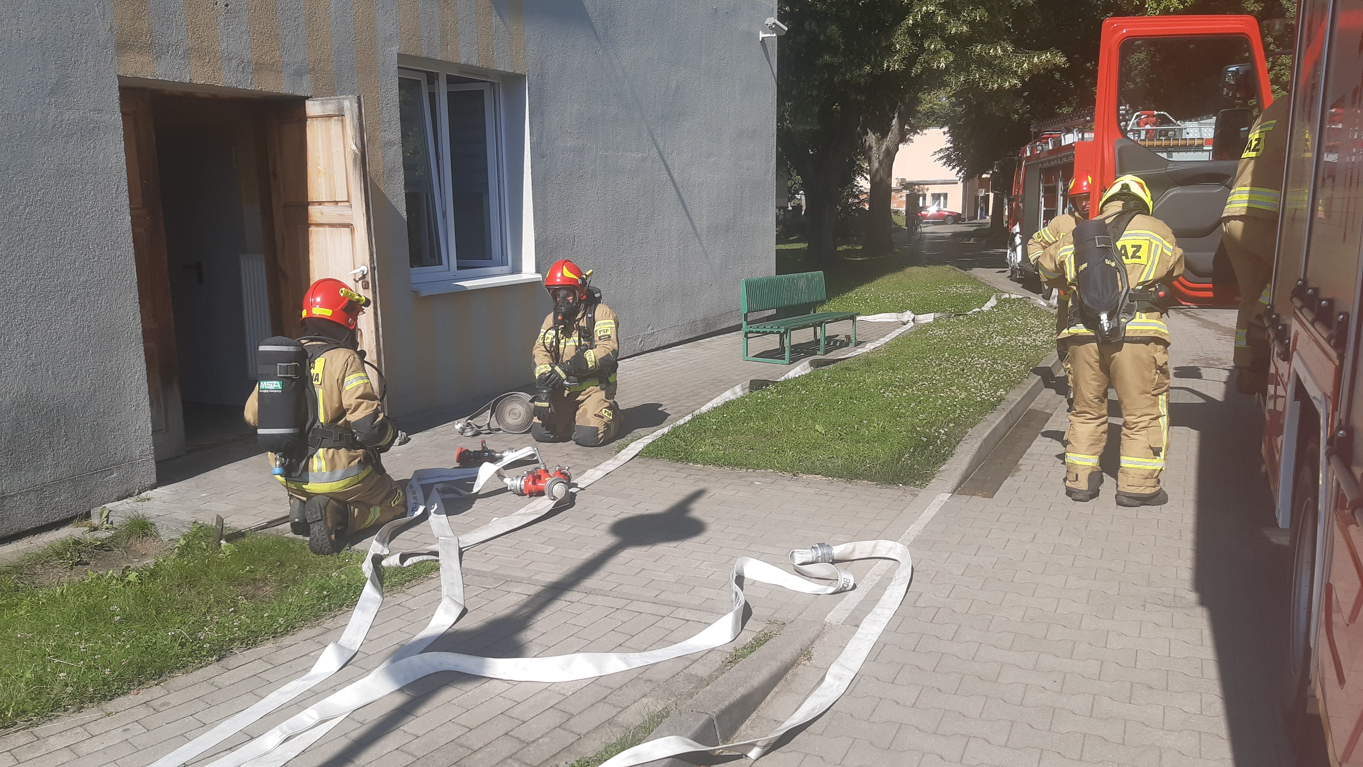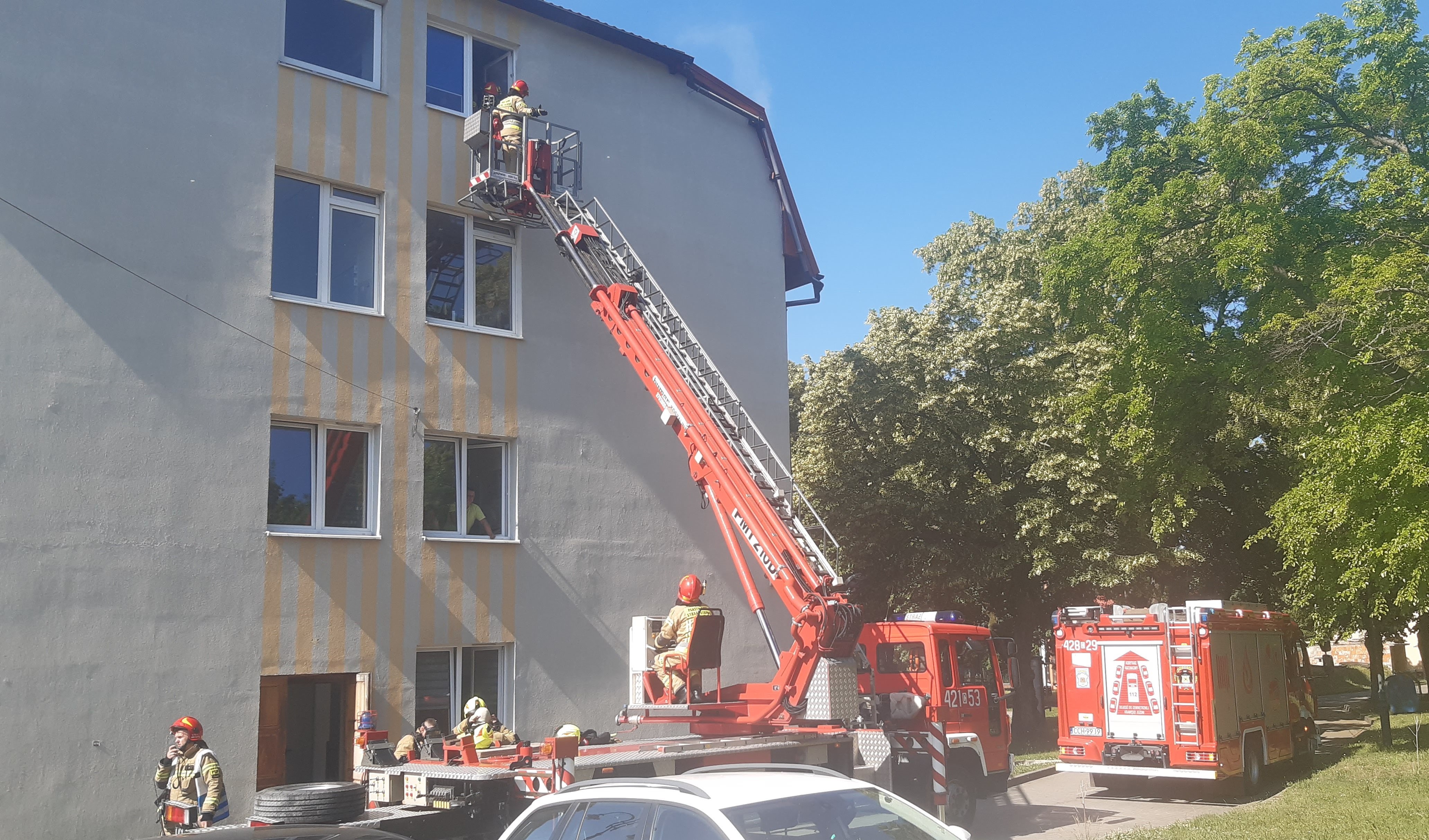 Wprowadzono rotę w aparatach ochrony dróg oddechowych w celu dotarcia do poszkodowanego, jednocześnie sprawiono podnośnik hydrauliczny, który miał za zadanie umożliwić ewakuację poprzez okno na szczycie budynku.