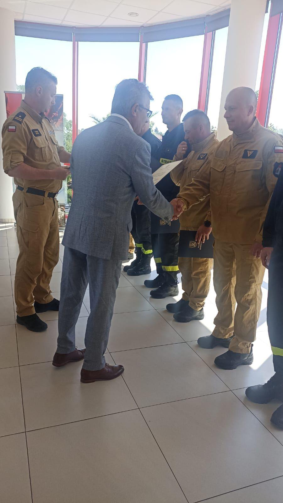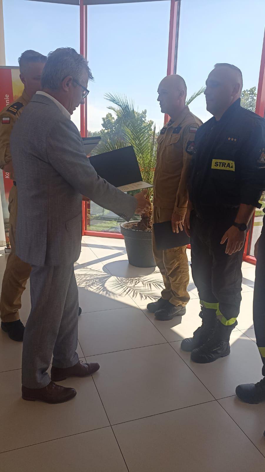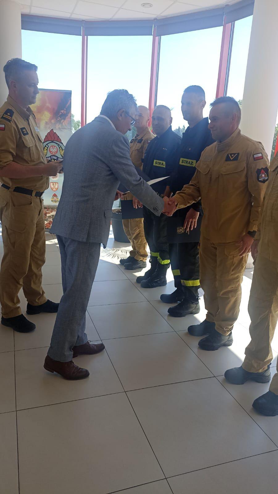 W dniu dzisiejszym Starosta Powiatowy Zdzisław Gamański w obecności Komendanta Powiatowego mł. bryg. Tomasza Guzek przyznał i wręczył nagrody finansowe dla funkcjonariuszy Komendy Powiatowej Państwowej Straży Pożarnej w Chełmnie, którzy wykazali się dużym zaangażowaniem podczas działań 28 czerwca 2024 r.