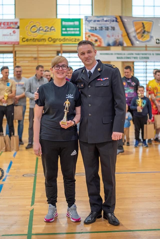 Puchar Komendanta Powiatowego PSP w Chełmnie dla najlepszego zawodnika turnieju otrzymała Pani Monika Błaszczak z OSP Papowo Biskupie, która była jedyną kobietą na boisku.
