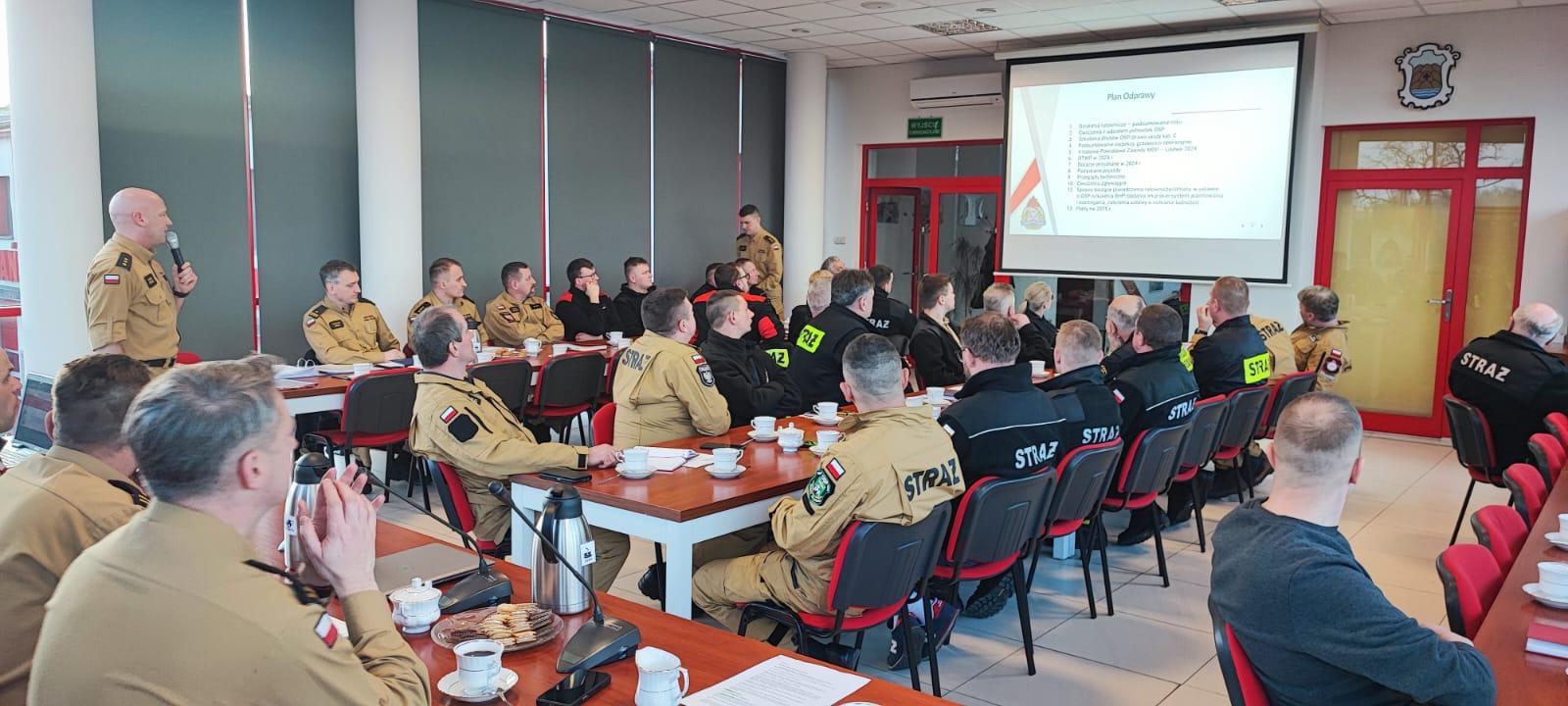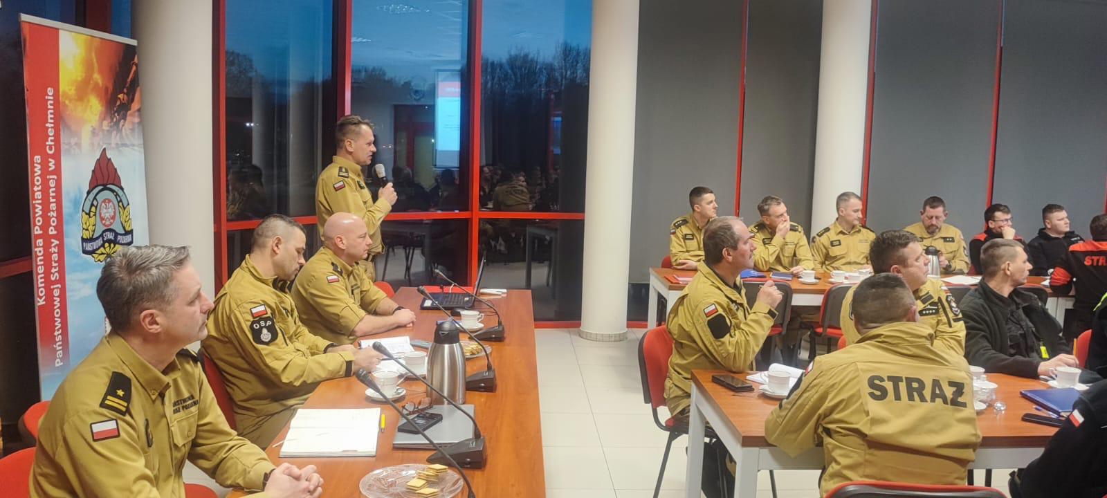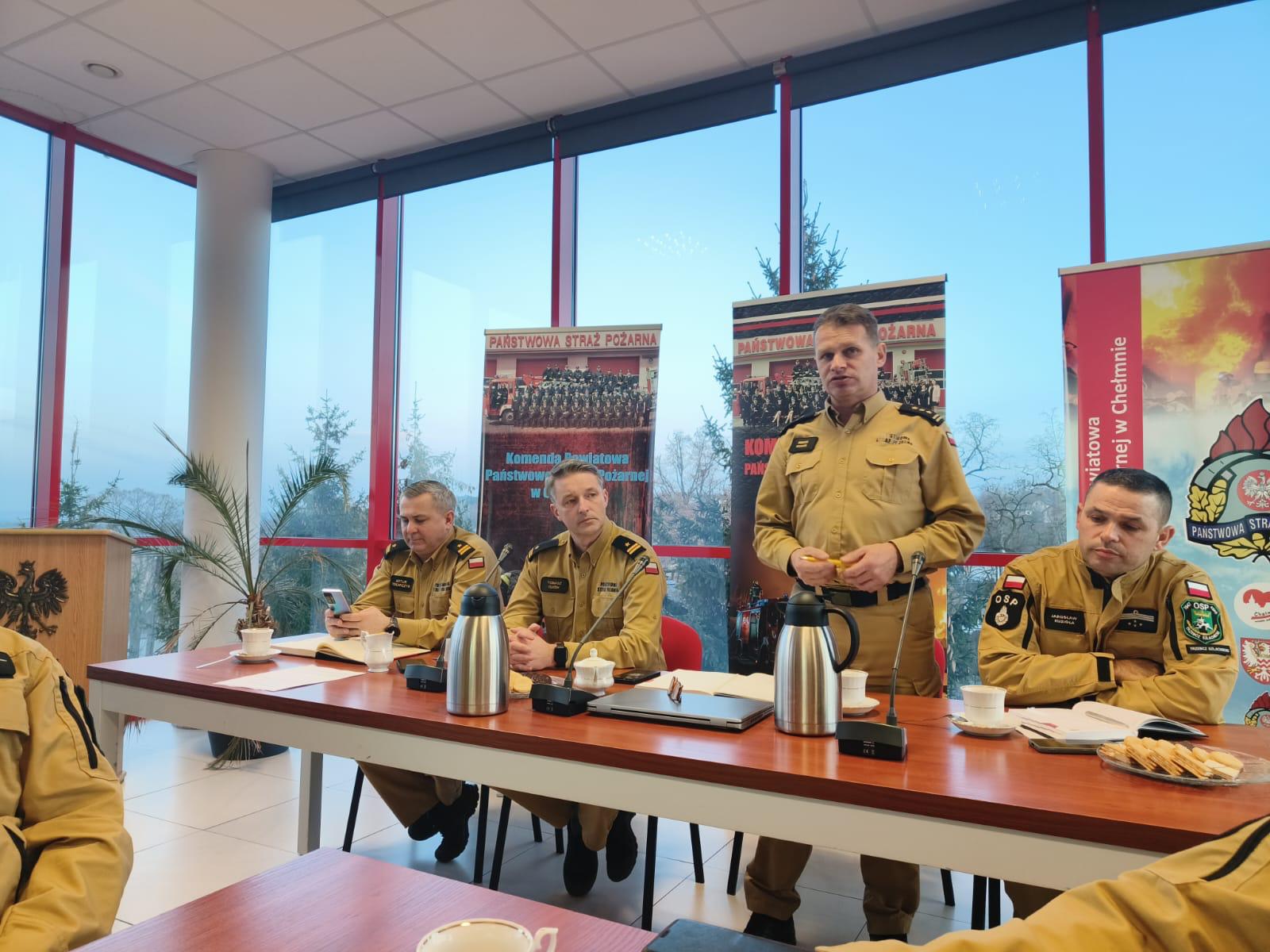 Przybyłych druhów przywitał mł. bryg. Tomasz Guzek – Komendant Powiatowy PSP w Chełmnie, następnie funkcjonariusze komendy omówili następujące tematy:
