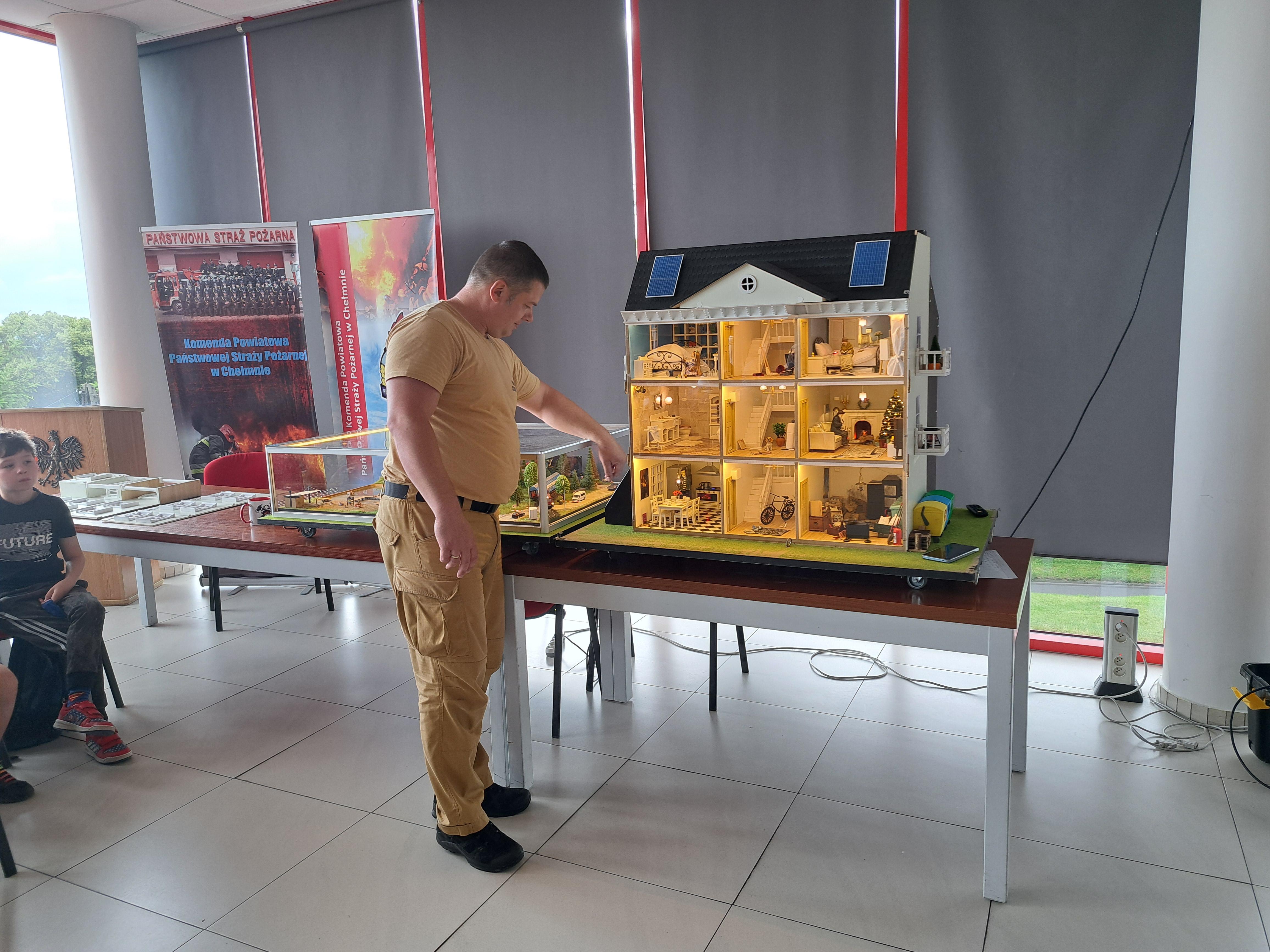 Funkcjonariusze zaprezentowali zagrożenia pożarowe do jakich może dojść w domu lub mieszkaniu. Podczas pokazu zasymulowano niebezpieczne sytuacje mogące wystąpić w pomieszczeniach, takich jak: kuchnia, łazienka, pokój dziecięcy, sypialnia, salon oraz kotłownia. Za pomocą efektów dźwiękowych i świetlnych oraz wydobywającego się sztucznego dymu w sposób realny odtworzono mogące wystąpić zagrożenia.