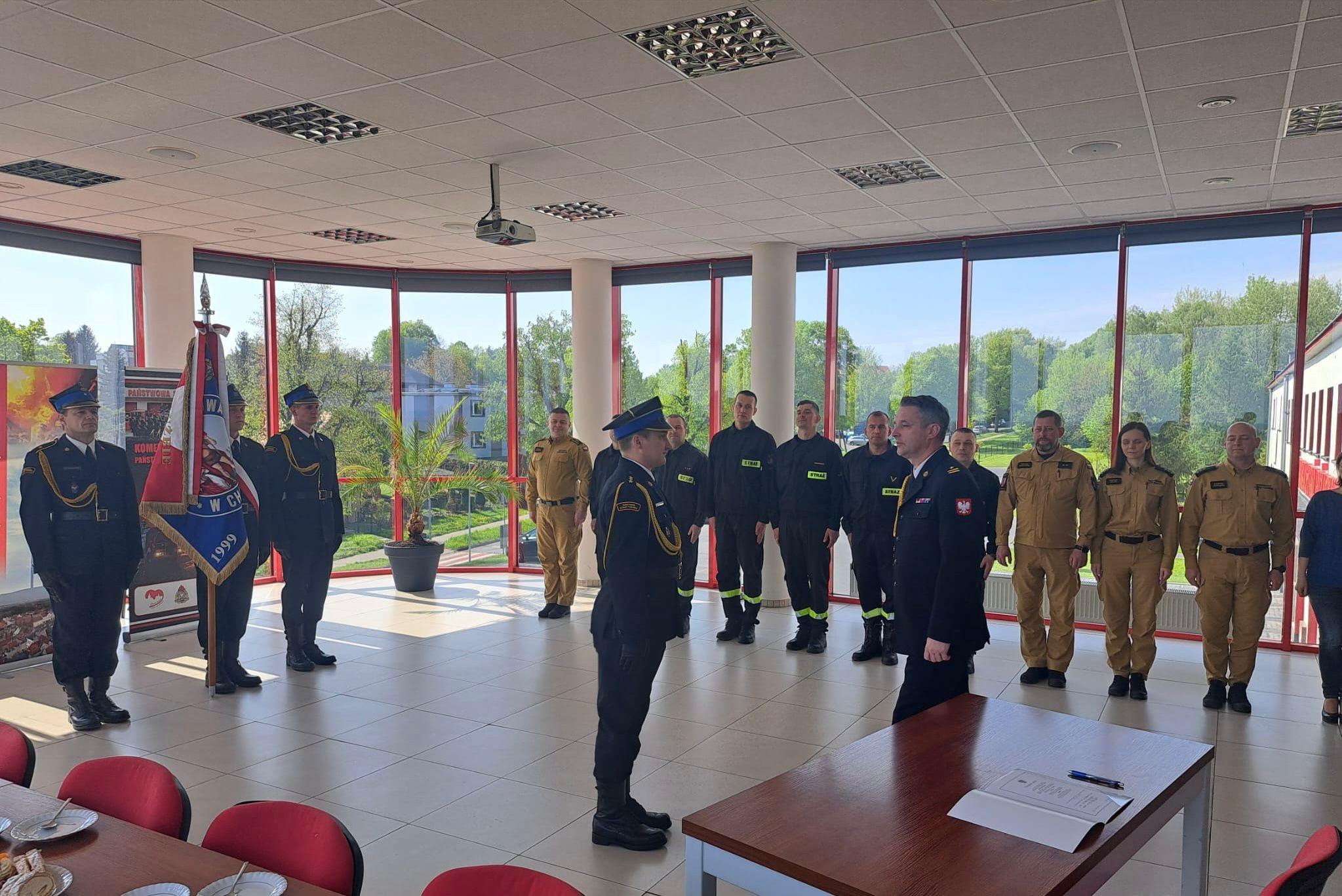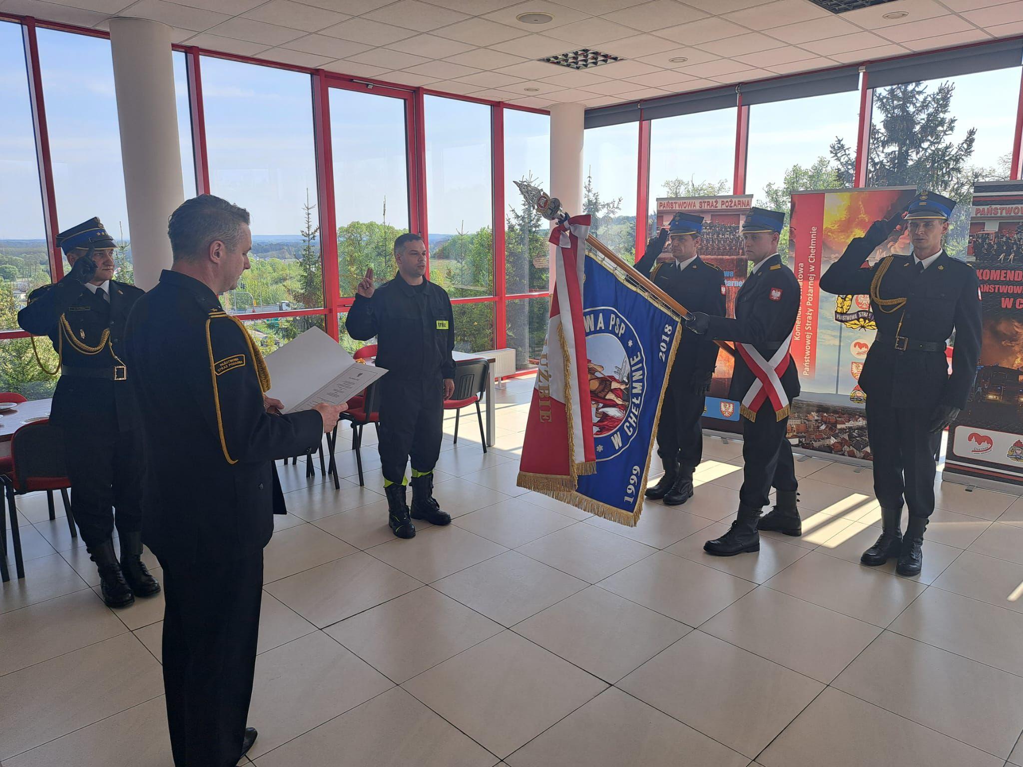 W Komendzie Powiatowej Państwowej Straży Pożarnej w Chełmnie odbyła się uroczysta zbiórka z okazji złożenia ślubowania przez str. Macieja Dzieweczyńskiego.