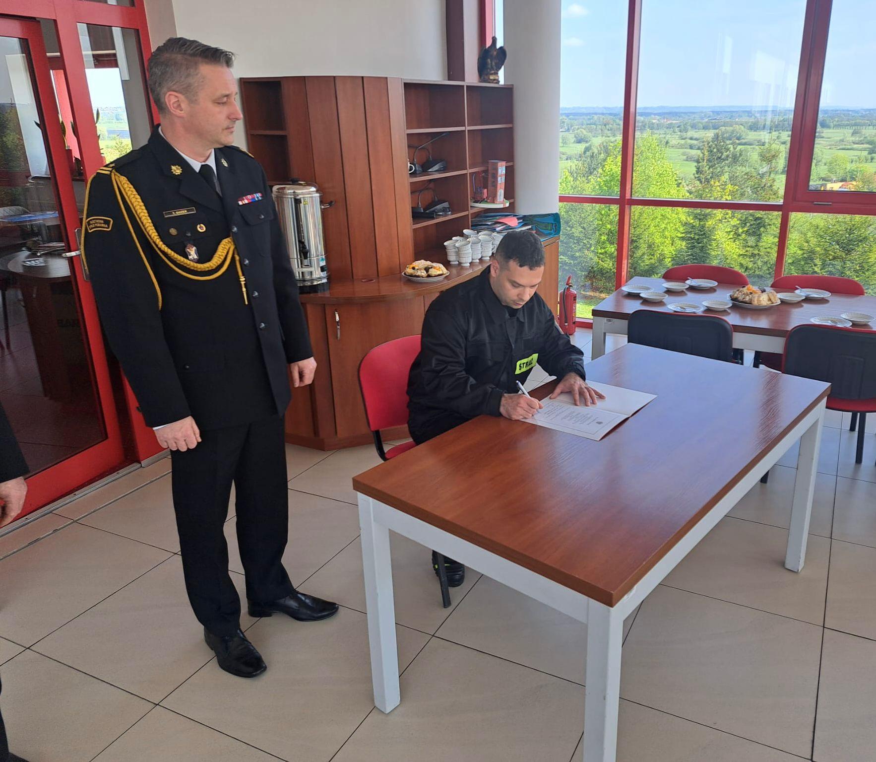 Po wypowiedzeniu roty ślubowania strażak złożył podpis pod aktem ślubowania, pieczętując w ten sposób ważny moment w swojej karierze.